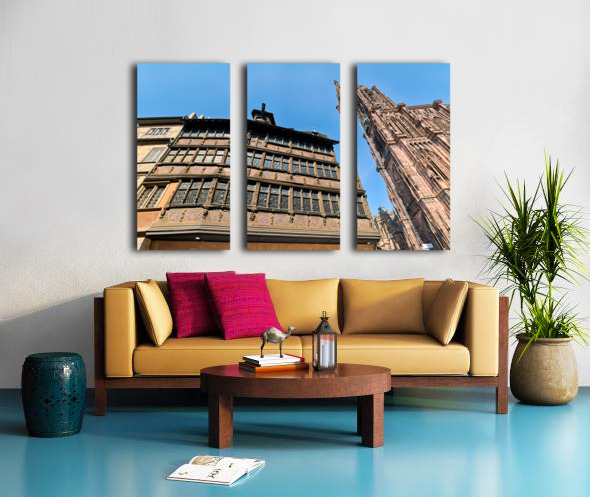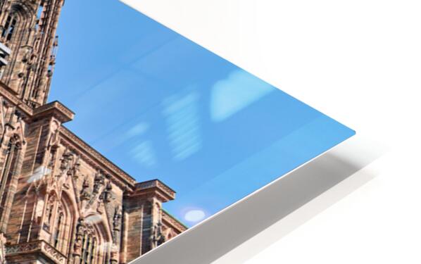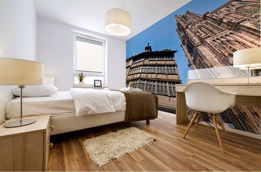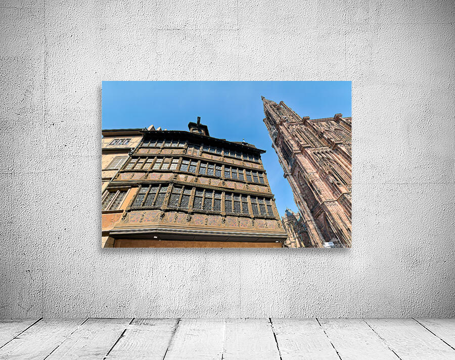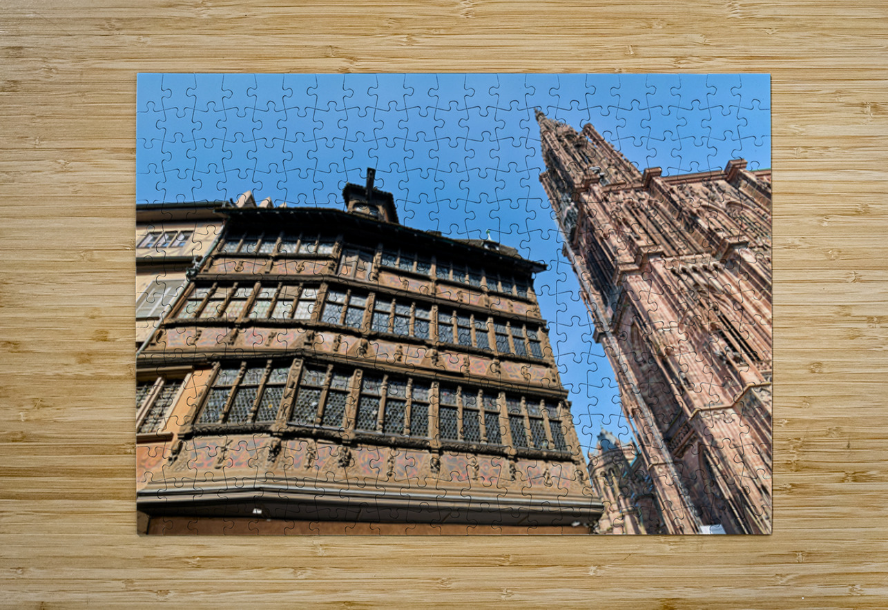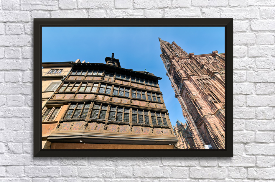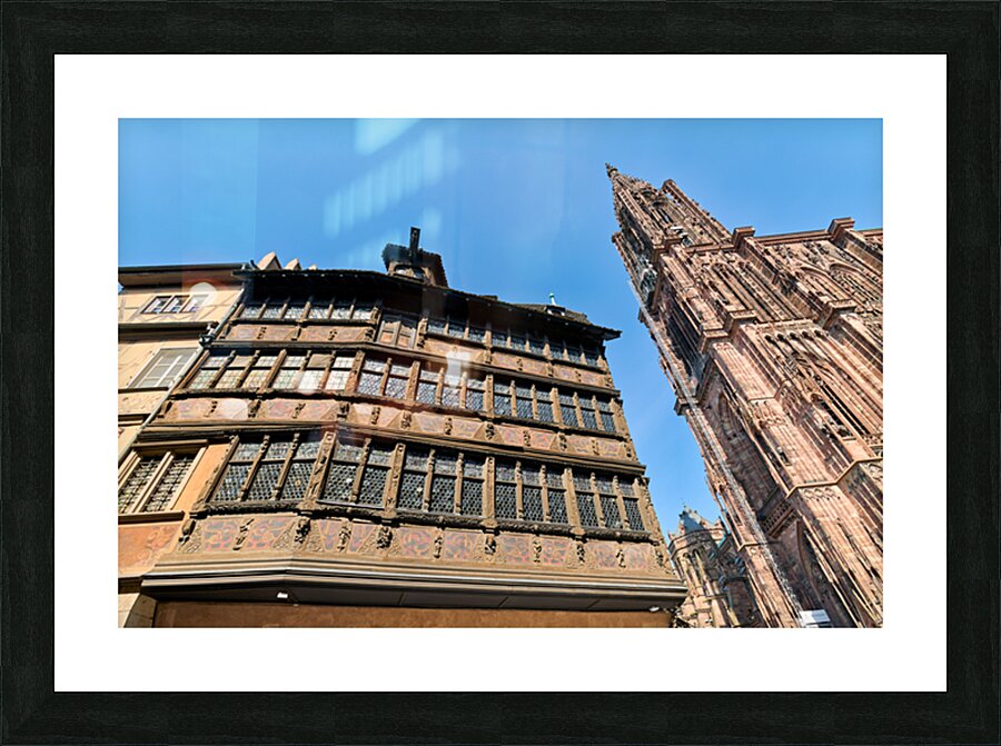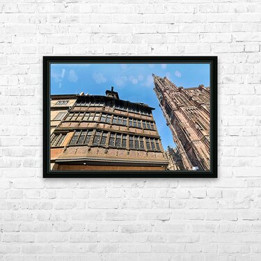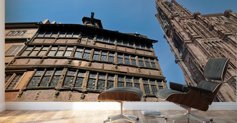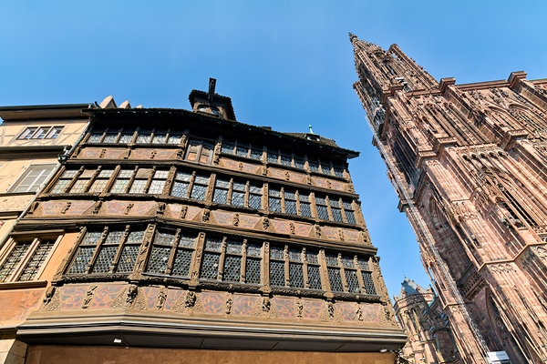 People explore the area near Kammerzell House and the Cathedral in Strasbourg. The buildings show detailed architecture against a blue sky.