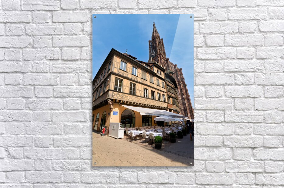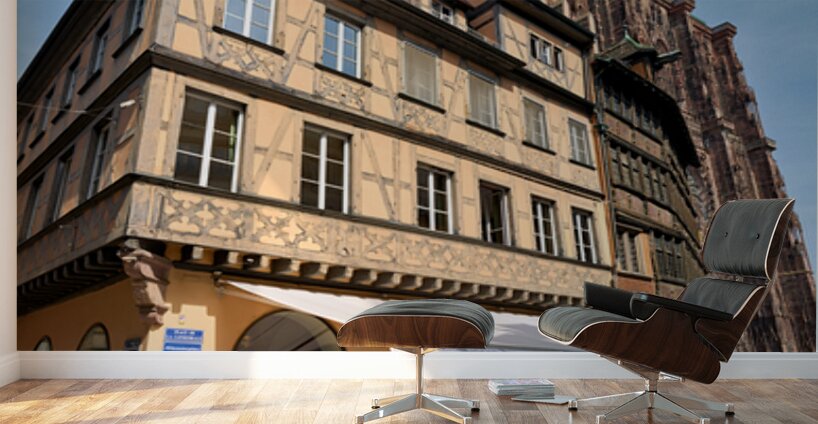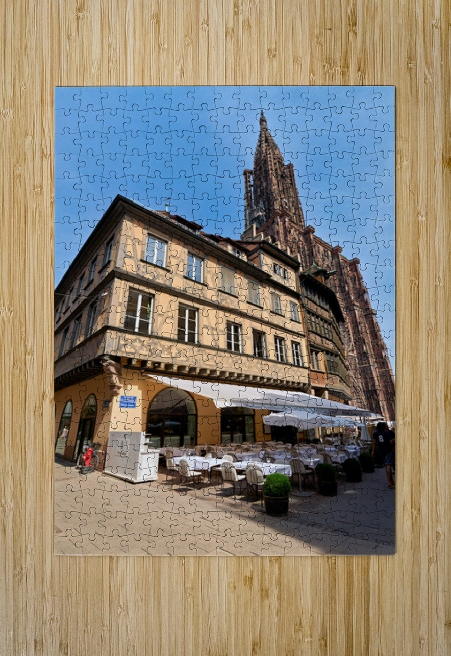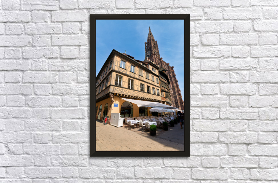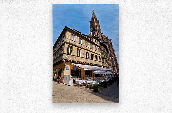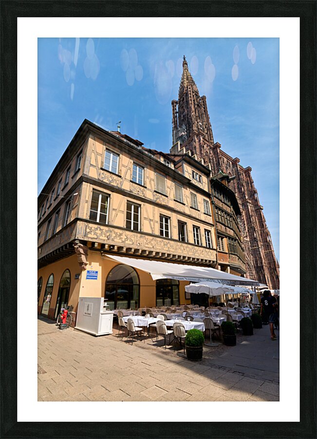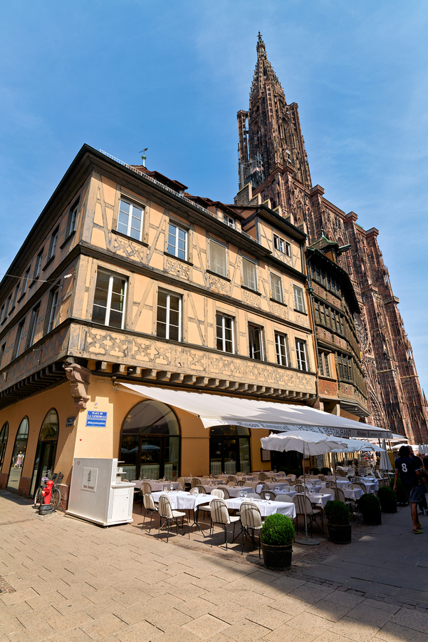 People enjoy the sights near Kammerzell House and Strasbourg Cathedral in Alsace. The area is busy with visitors and historic buildings.