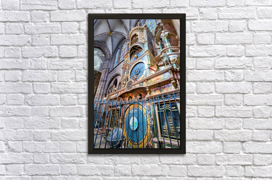 Visitors observe the Astronomical Clock inside Strasbourg Cathedral during daytime. The clock shows time and astronomical data.
