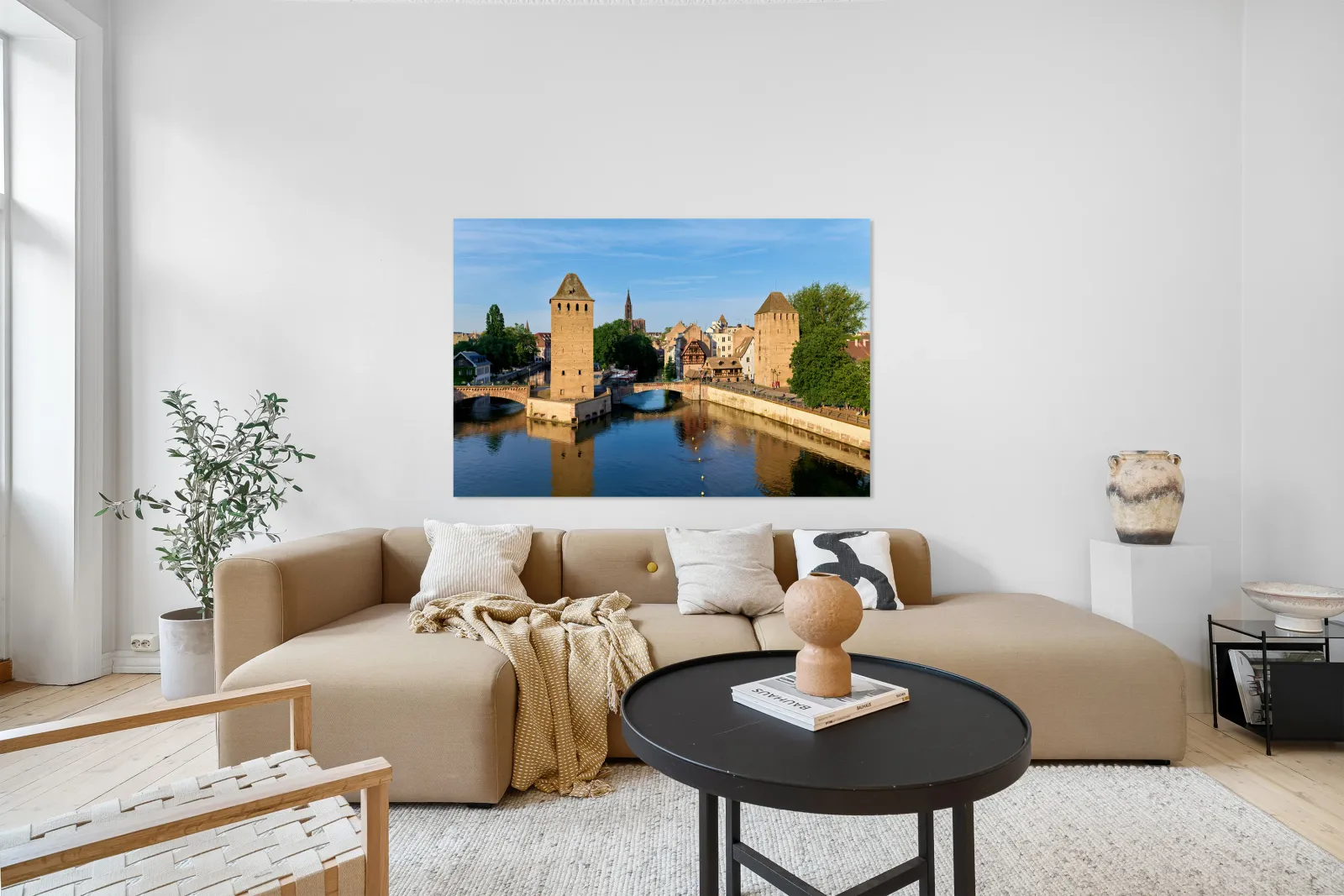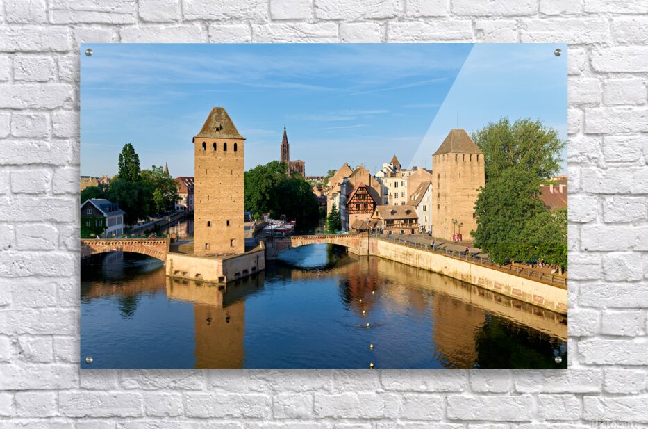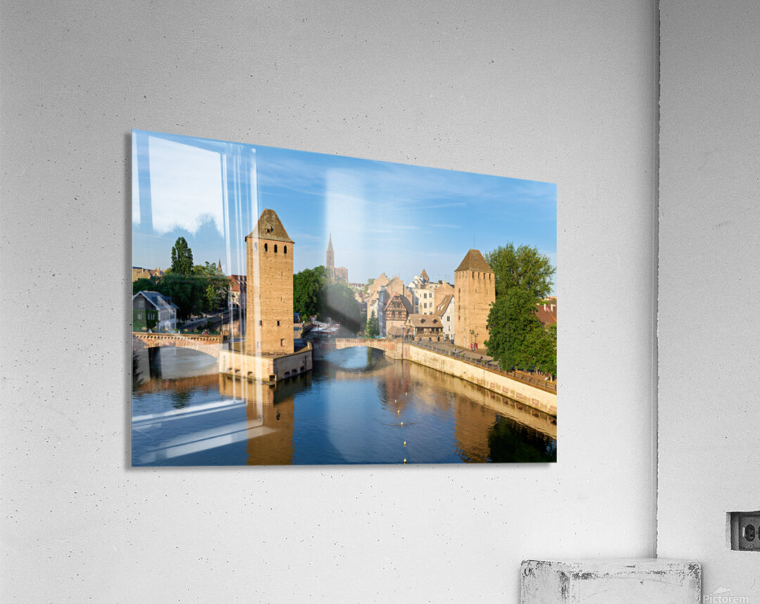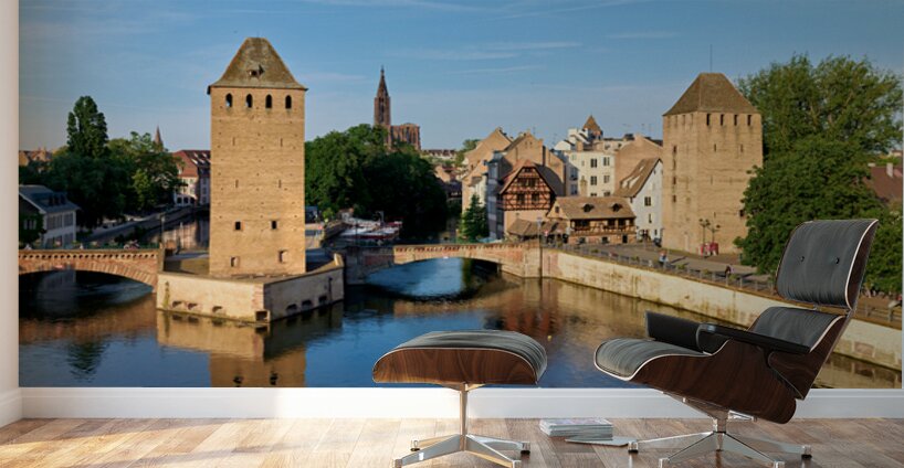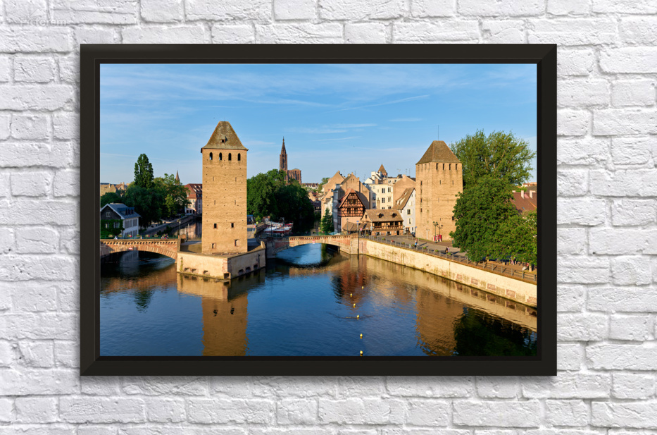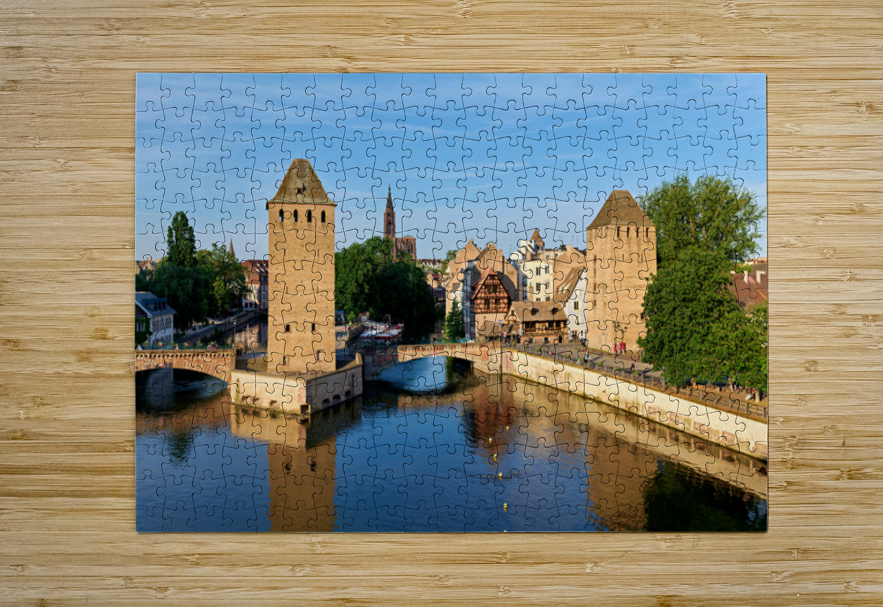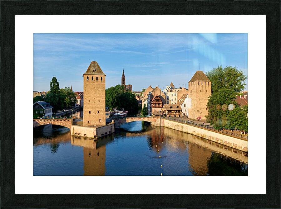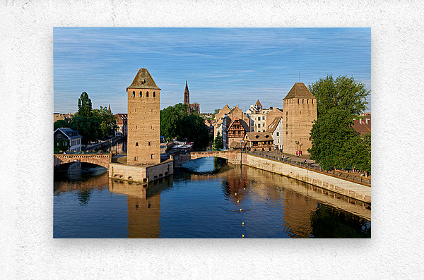 Bridges and towers stand in Strasbourg near the water during sunset. The buildings showcase the history of Alsace in this location.