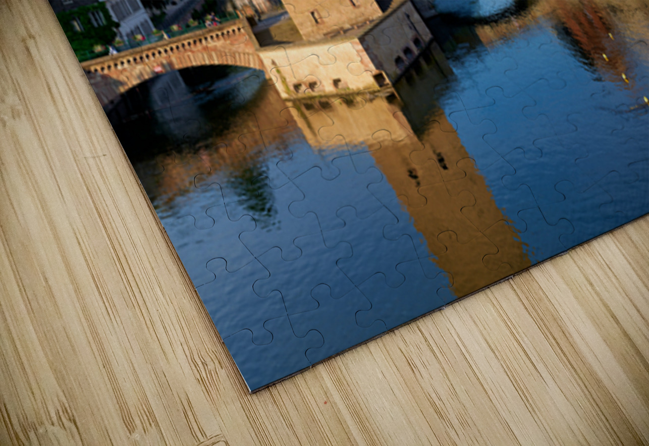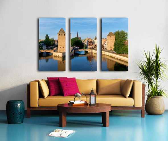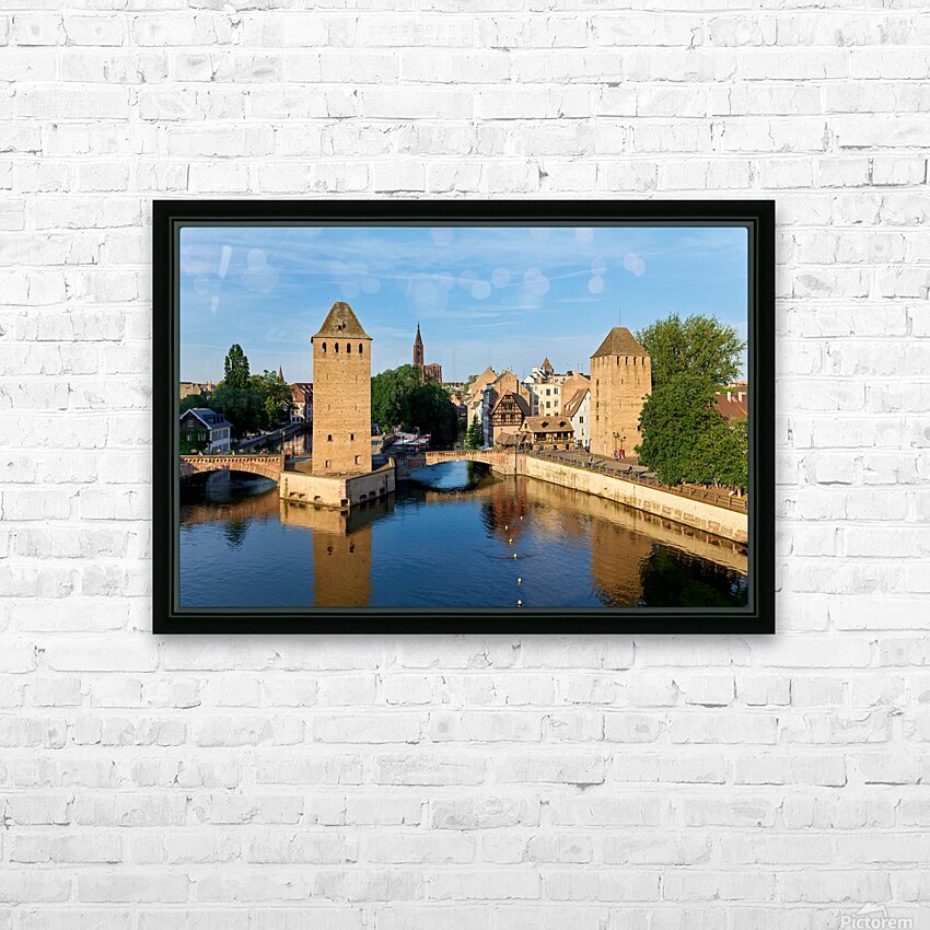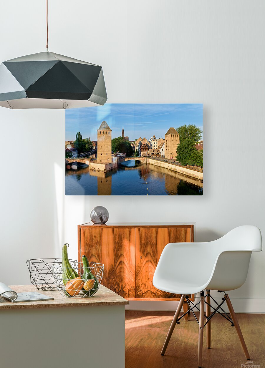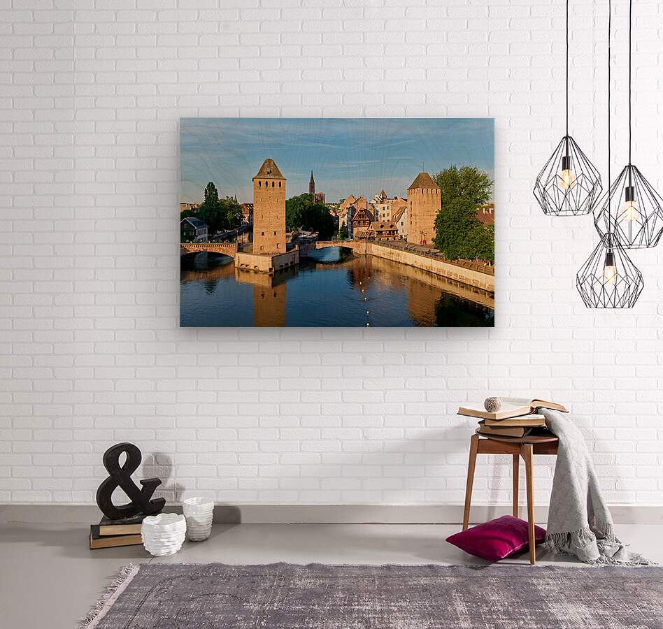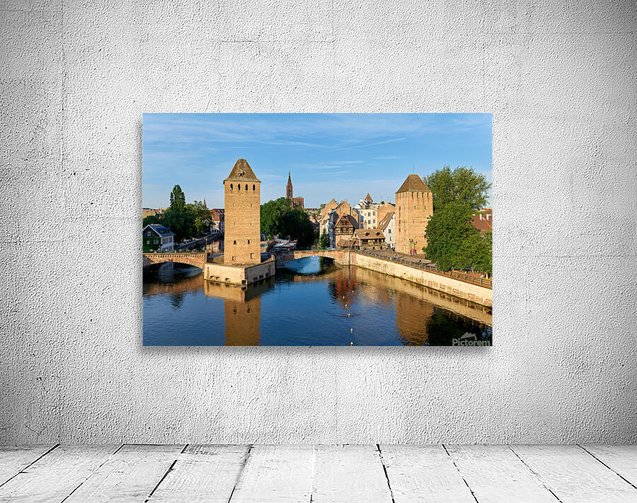 Bridges and towers stand in Strasbourg near the water during sunset. The buildings showcase the history of Alsace in this location.