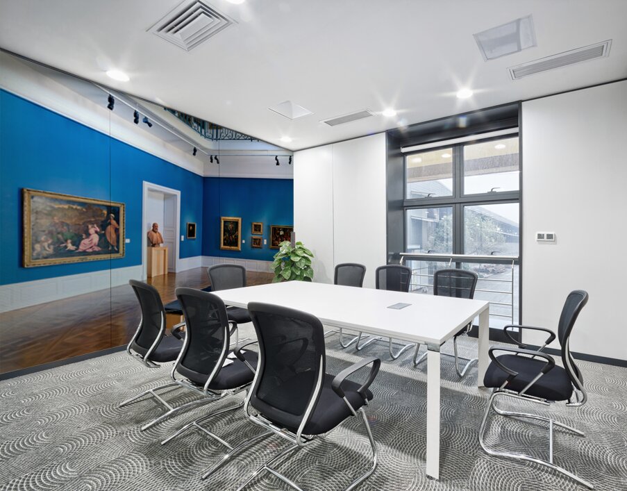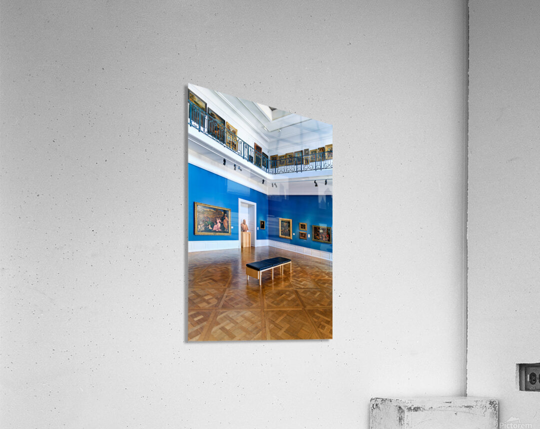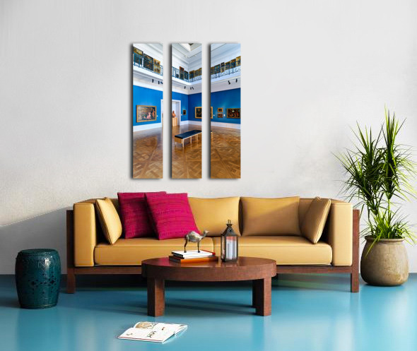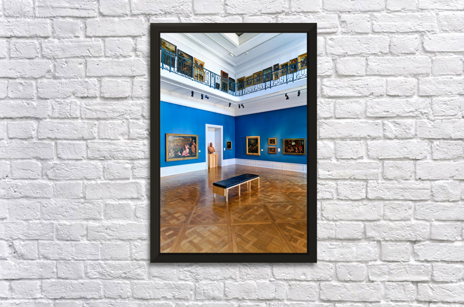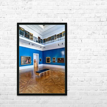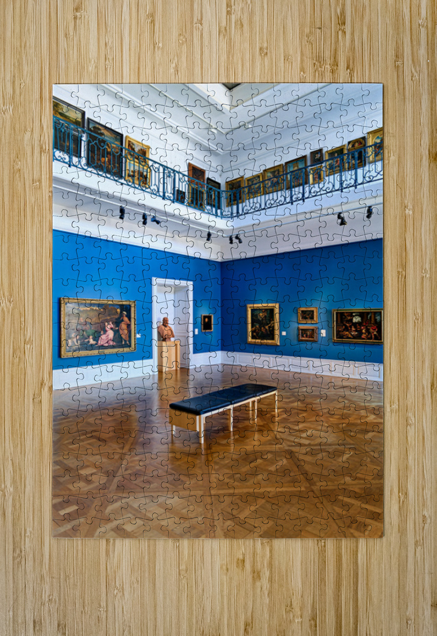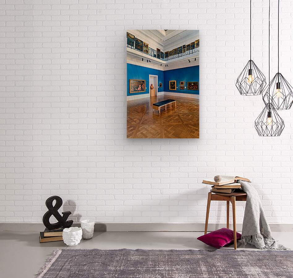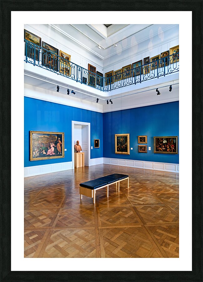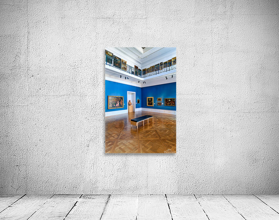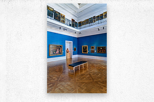 Visitors walk through a gallery in the Fine Arts Museum. Paintings hang on blue walls and a wooden bench is in the center of the room.