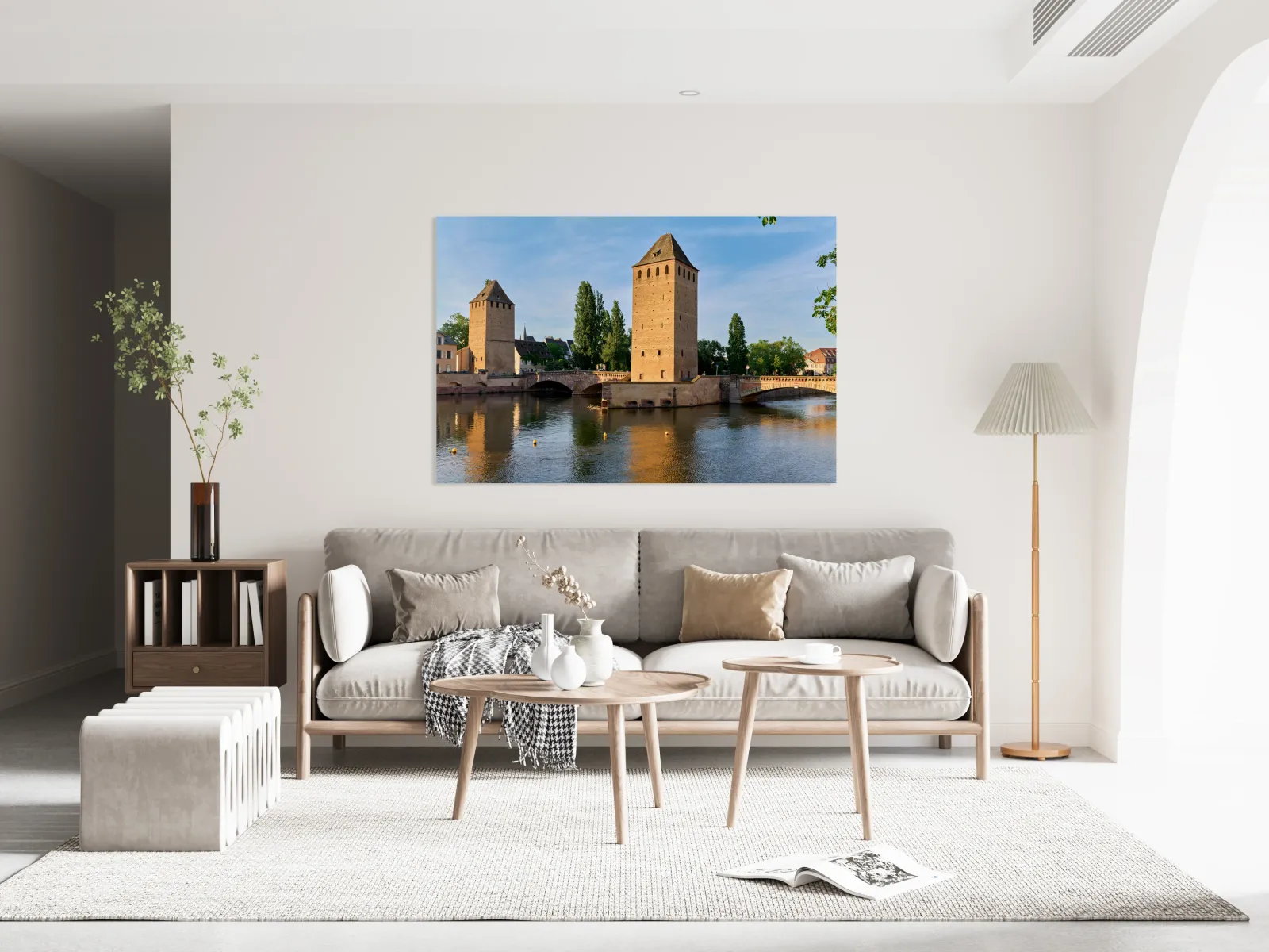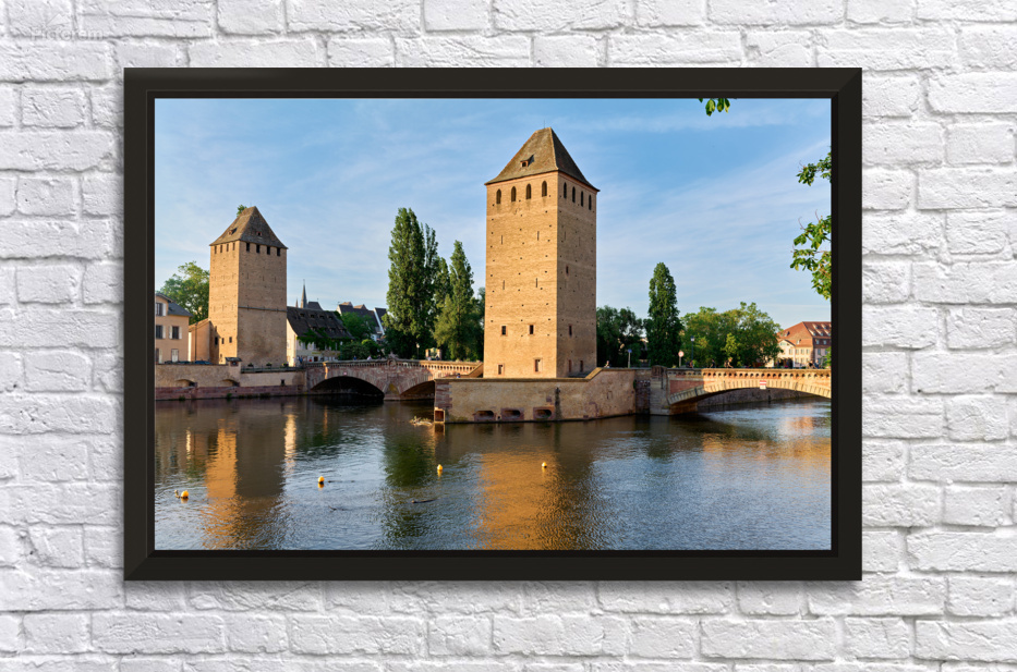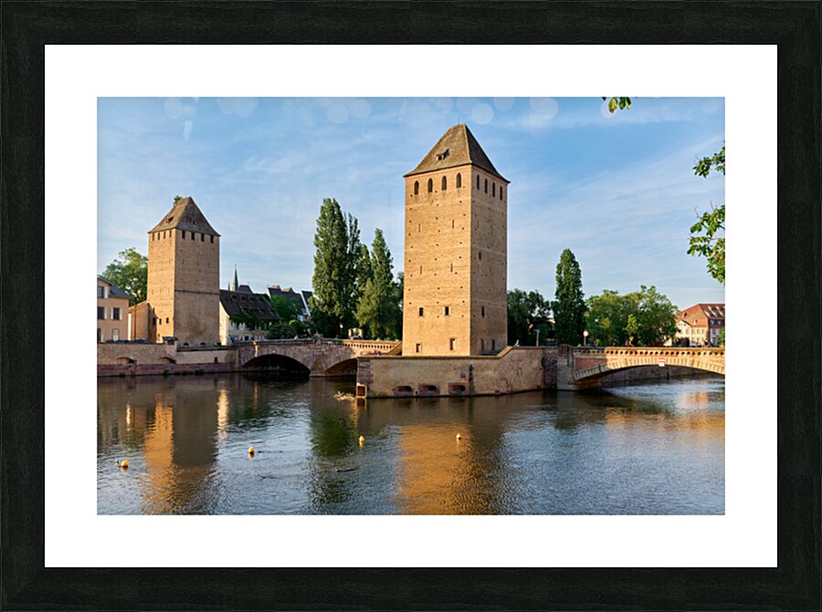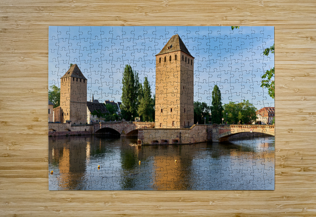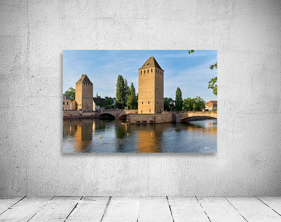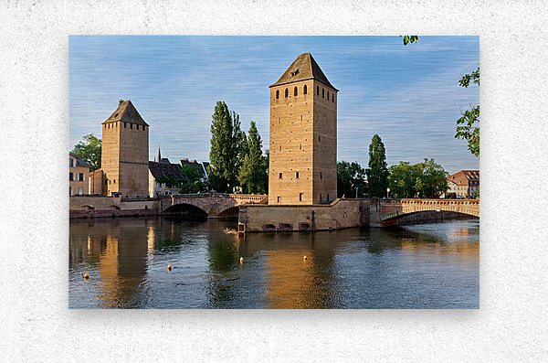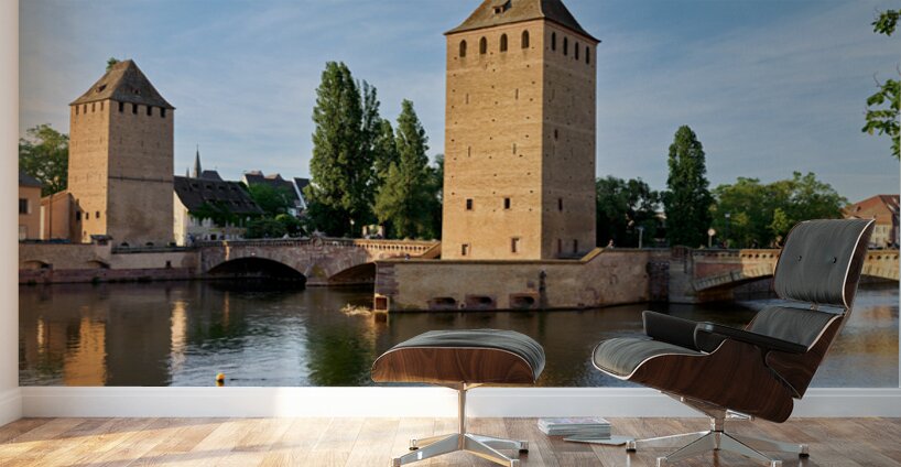Visitors view covered bridges in Strasbourg enjoying reflections on the water under a bright sky. The scene shows the charm of Alsace.