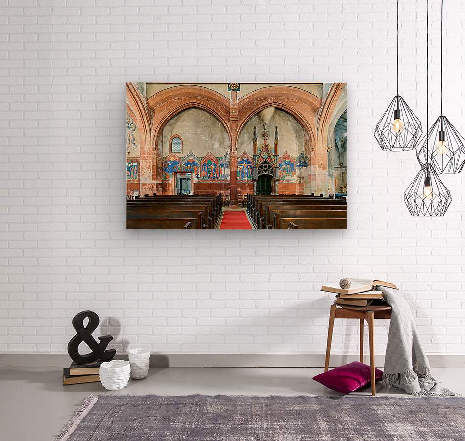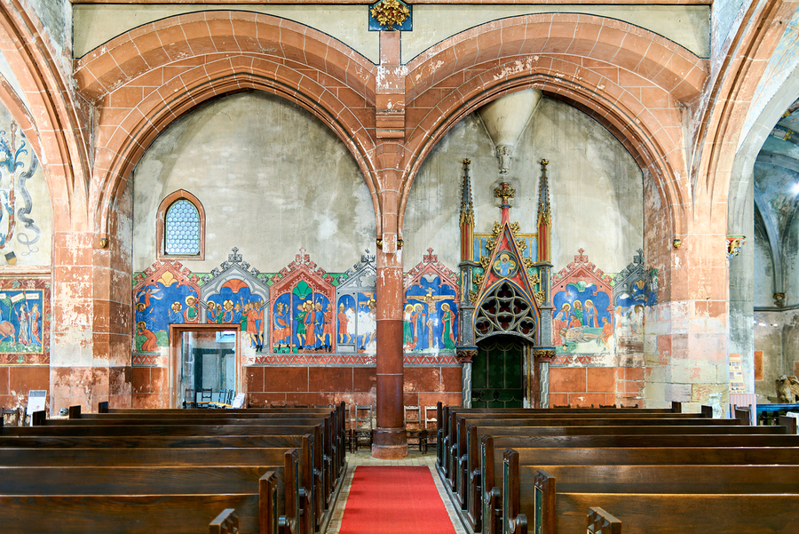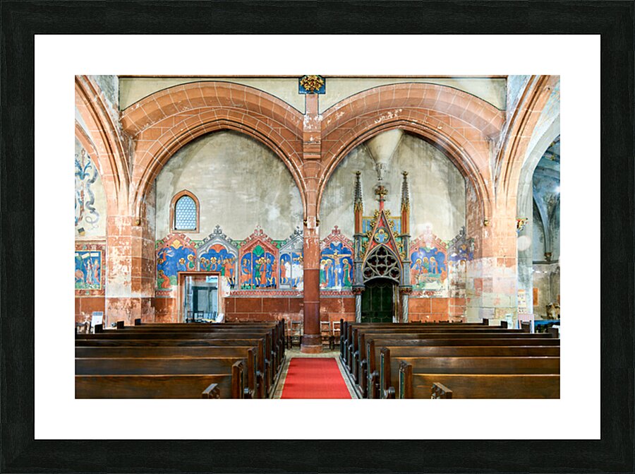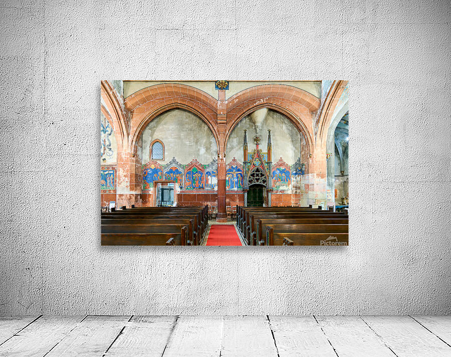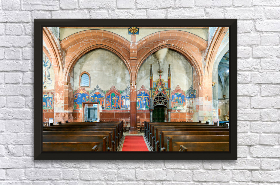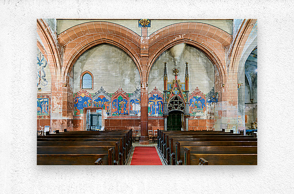 The interior of Saint Pierre le Jeune church shows the architecture and decoration. The space features wooden benches and wall art.