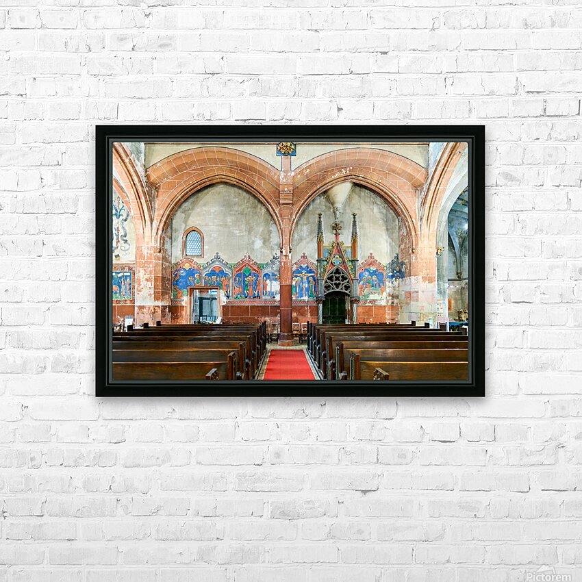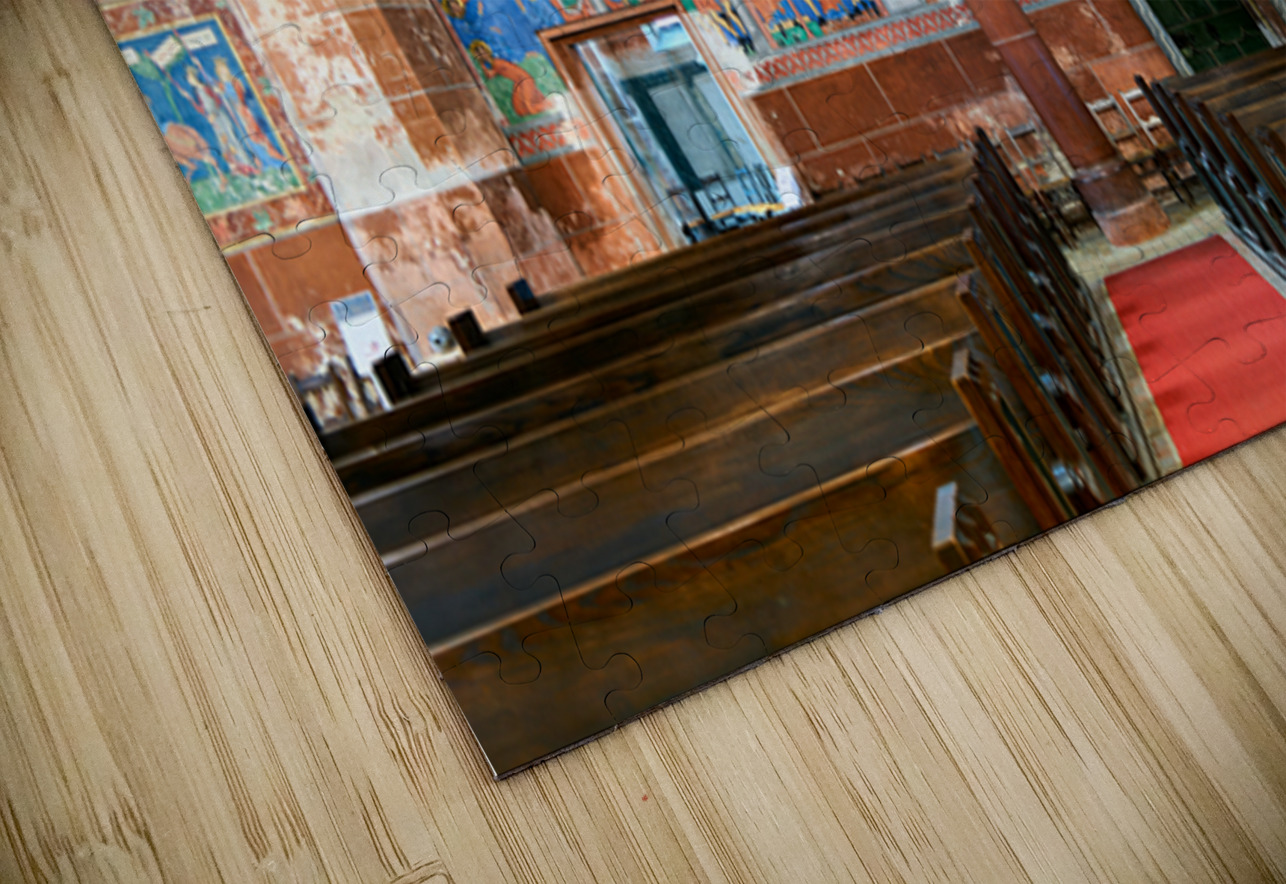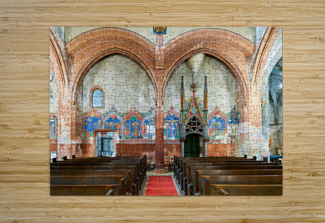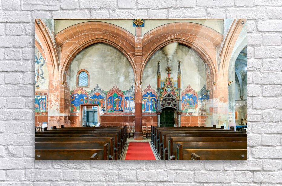 The interior of Saint Pierre le Jeune church shows the architecture and decoration. The space features wooden benches and wall art.