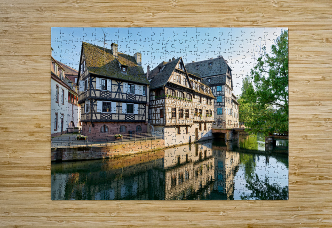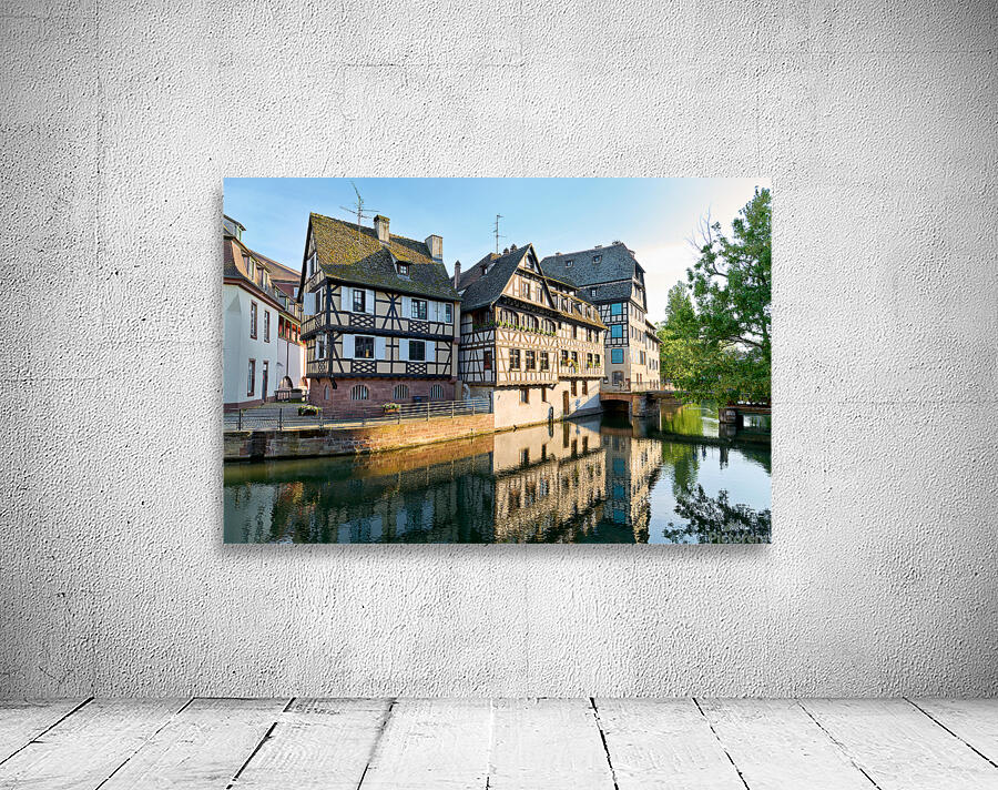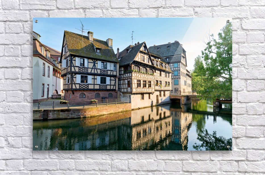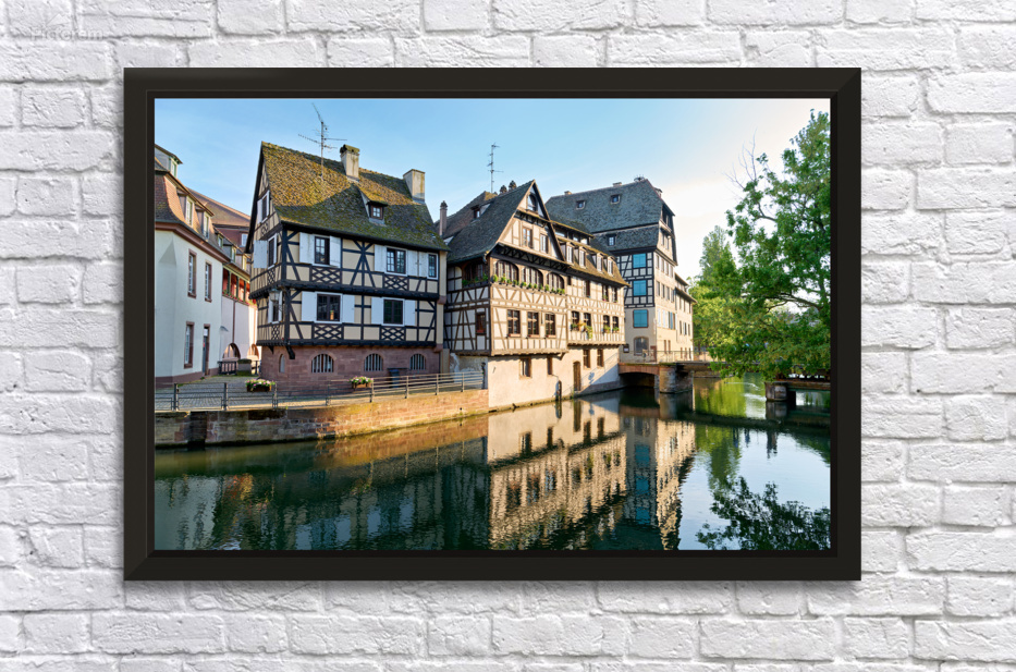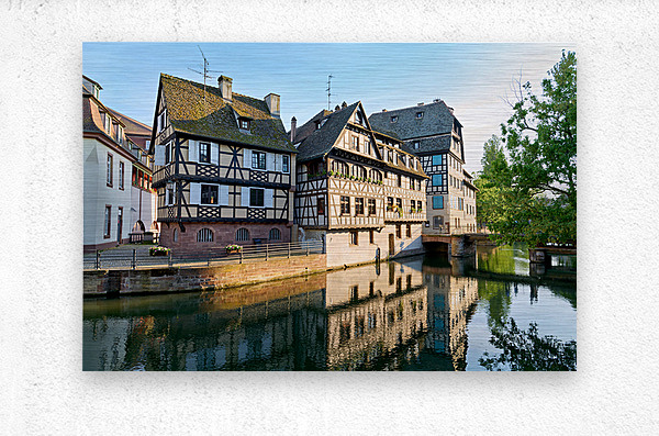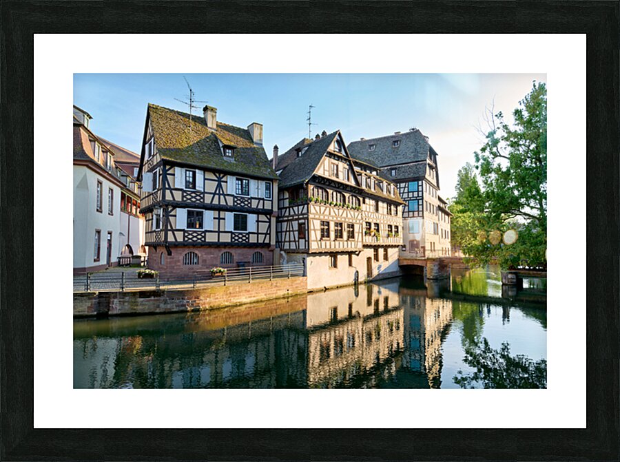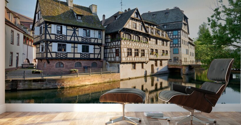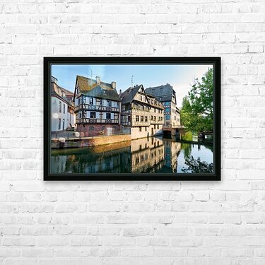 Timber framed houses stand by the river in Petit France district on a sunny day. The buildings reflect in the water.