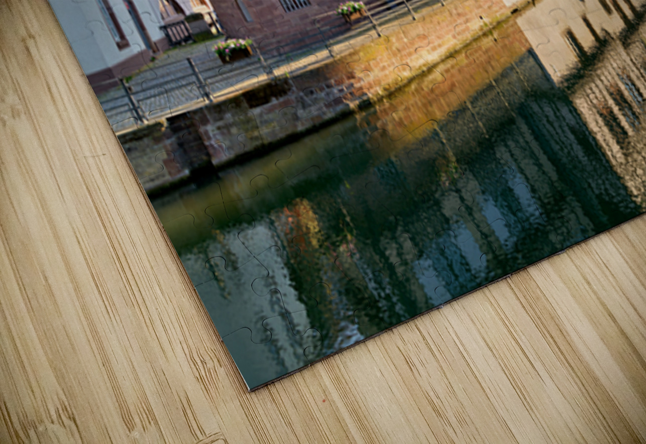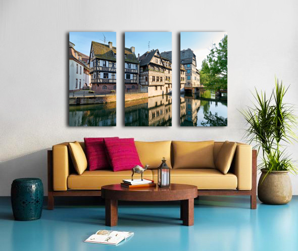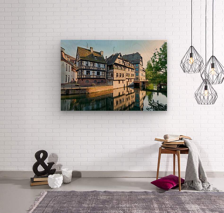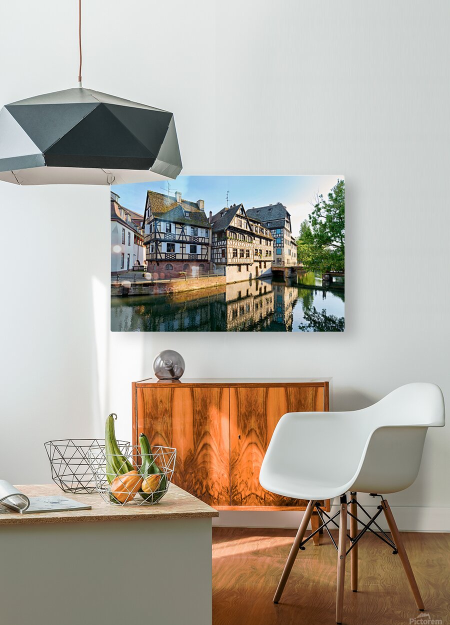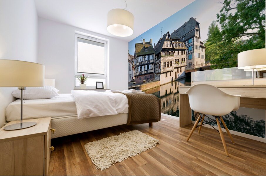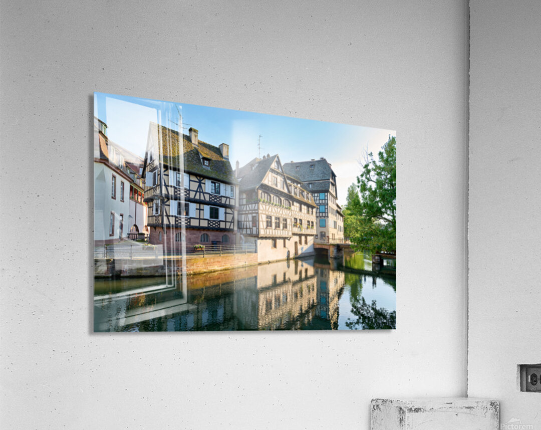 Timber framed houses stand by the river in Petit France district on a sunny day. The buildings reflect in the water.