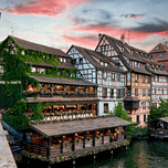 Timber framed houses stand by the waterway in Petit France Strasbourg. People eat dinner on the terrace while the sun sets.