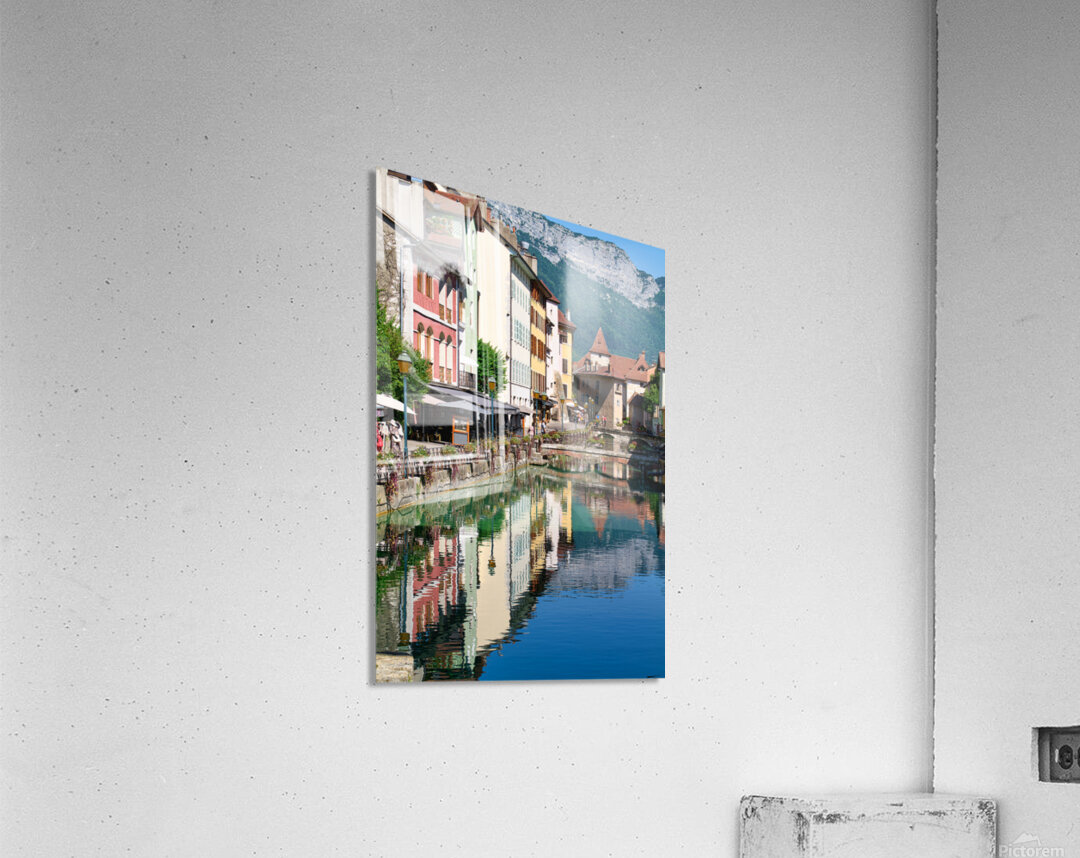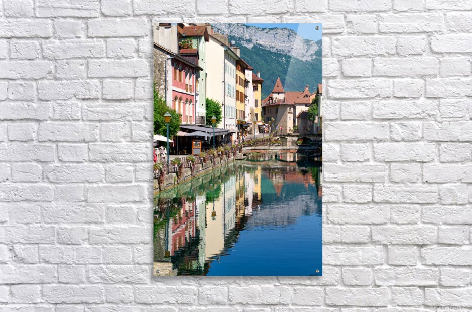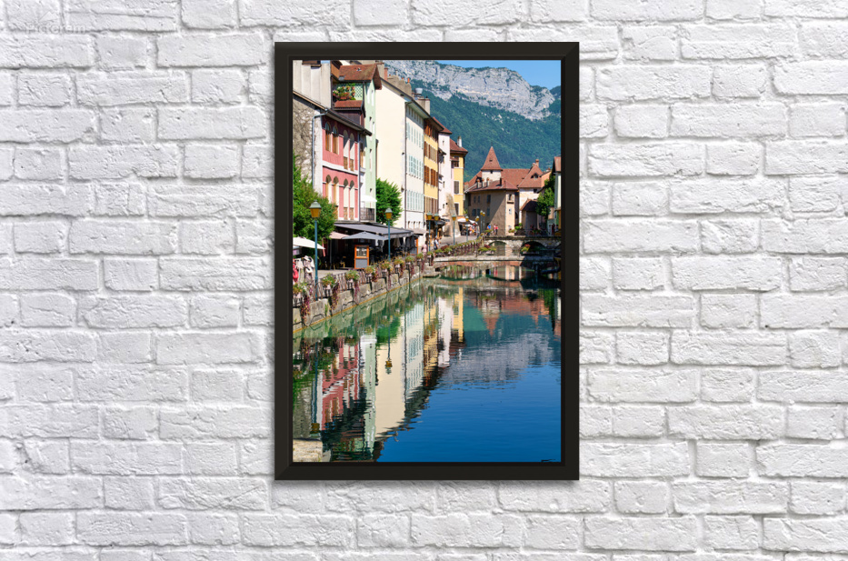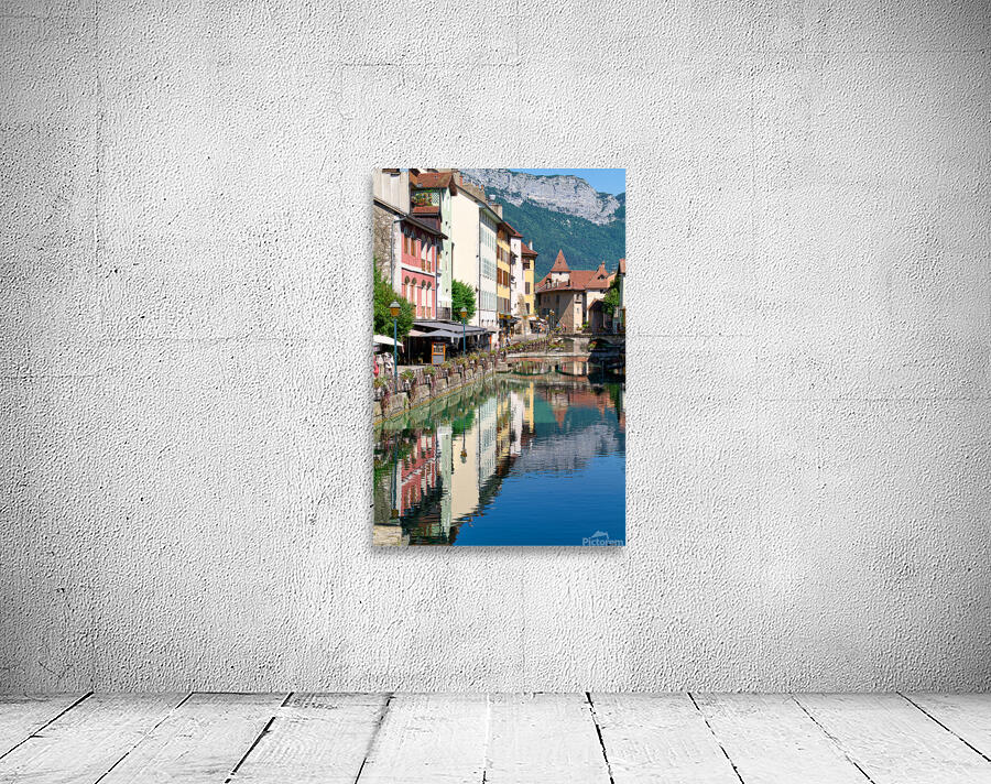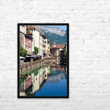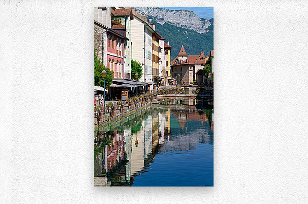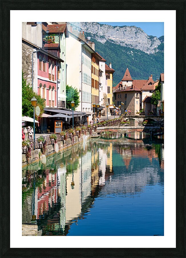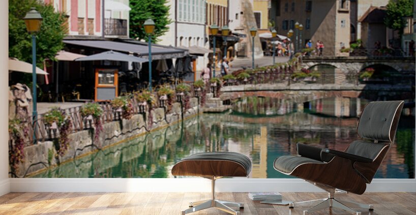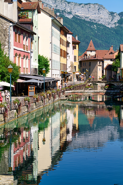 People stroll along the banks of the Thiou River in Annecy while buildings reflect in the water on a sunny day.