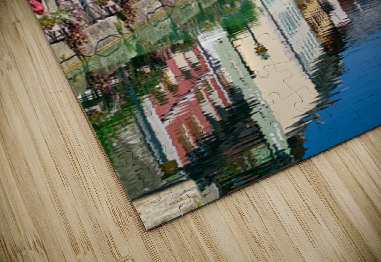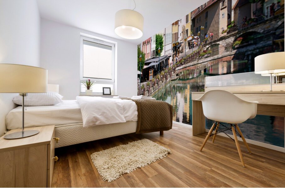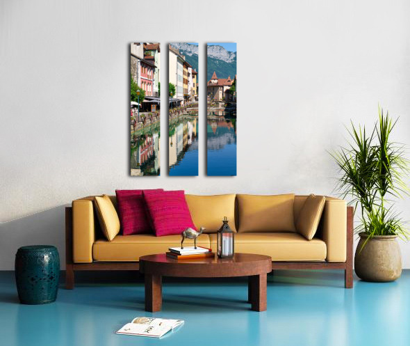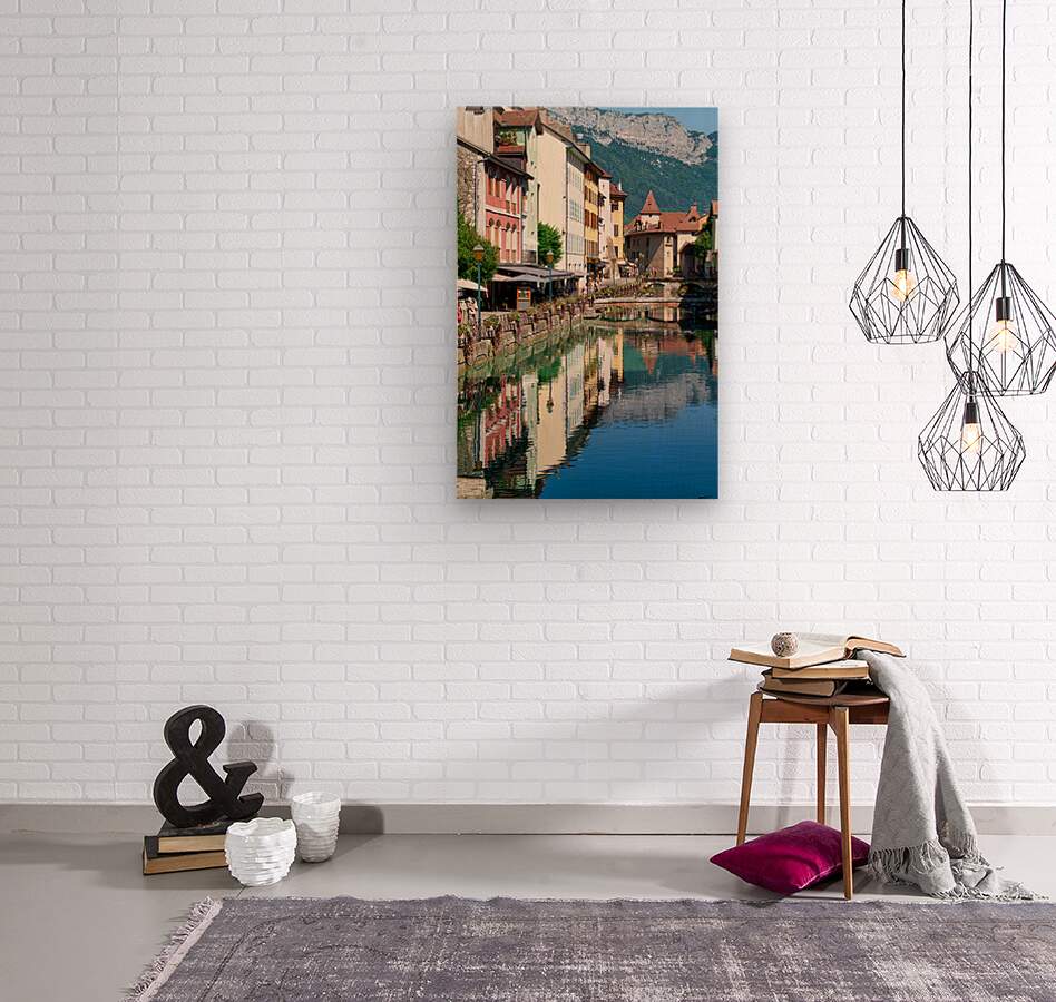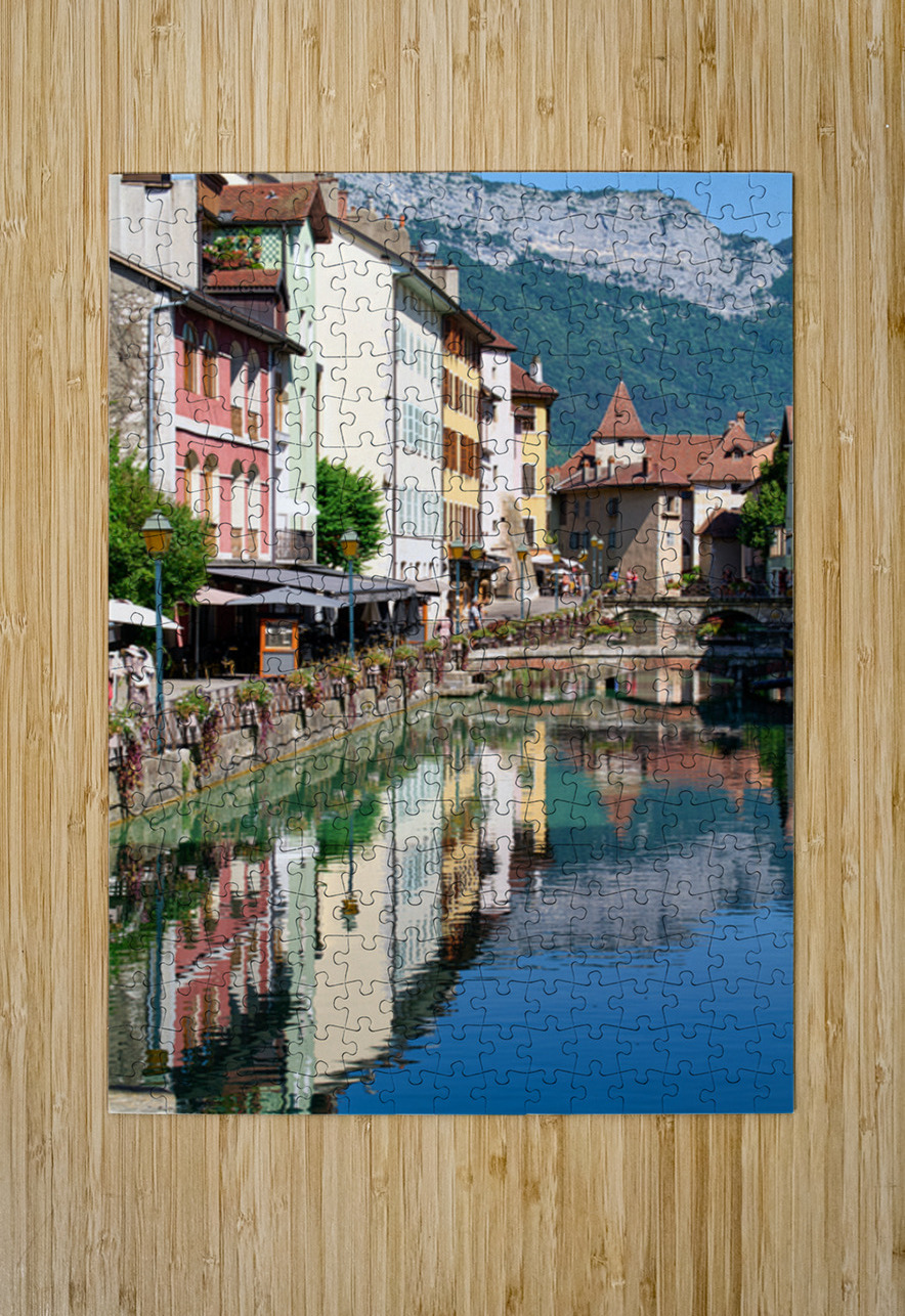 People stroll along the banks of the Thiou River in Annecy while buildings reflect in the water on a sunny day.