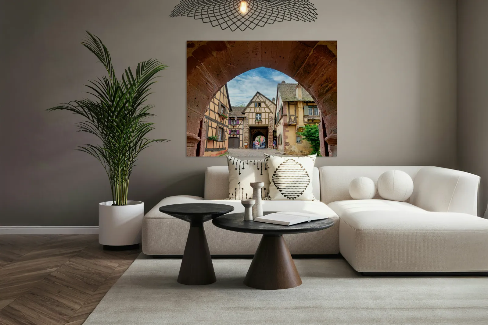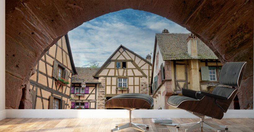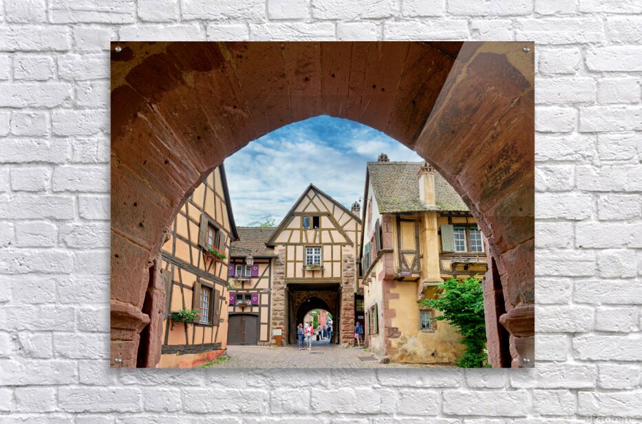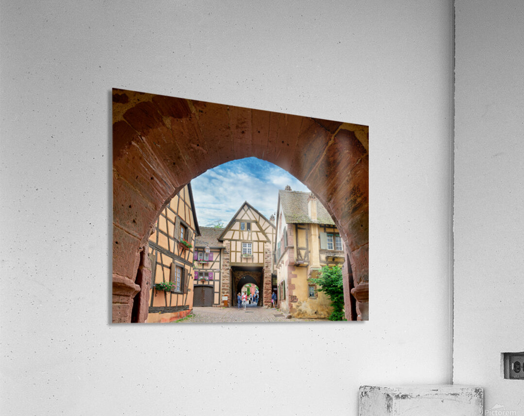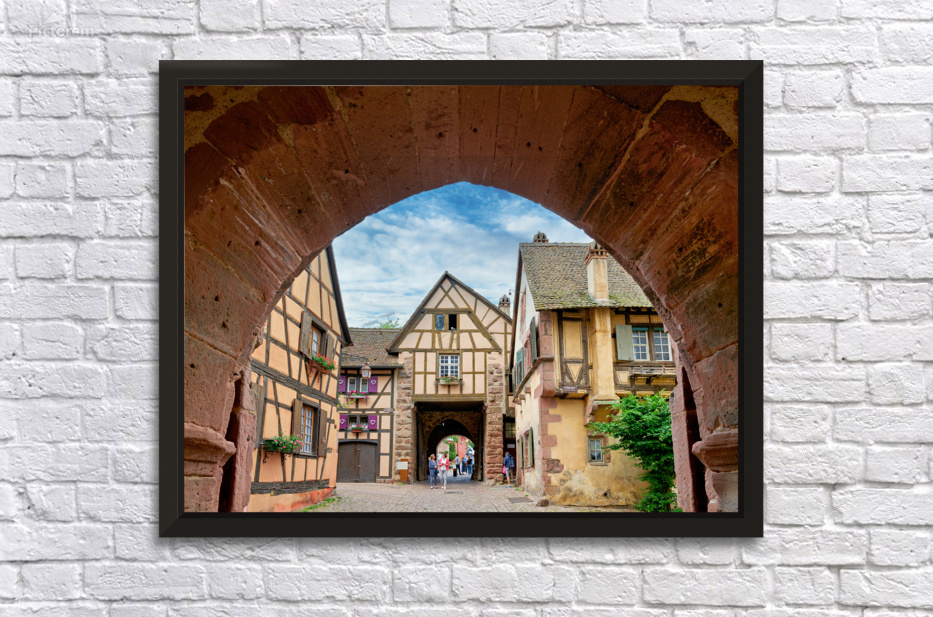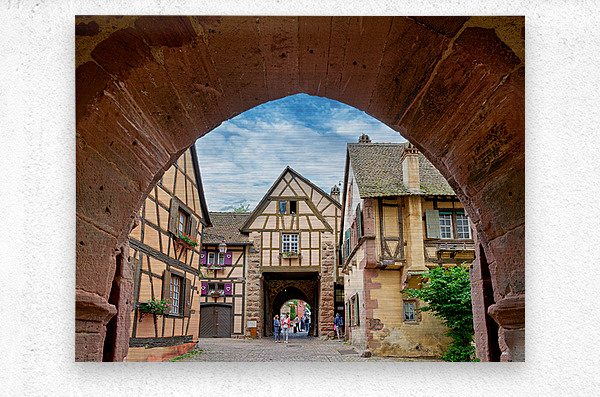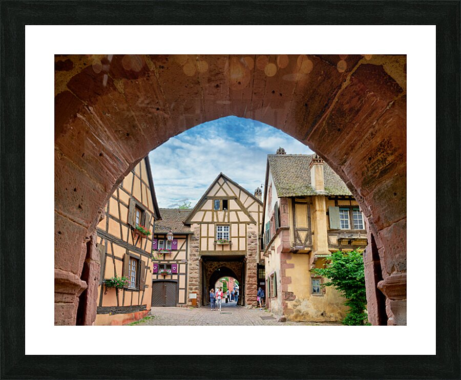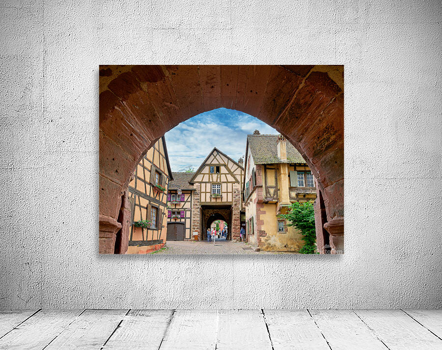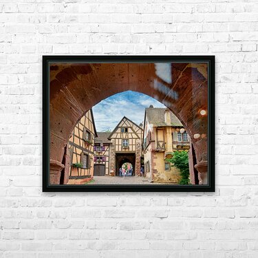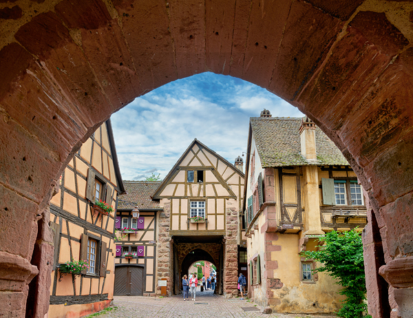 Visitors walk through an archway in Riquewihr. They explore timber framed houses and enjoy the charm of the Alsace town.