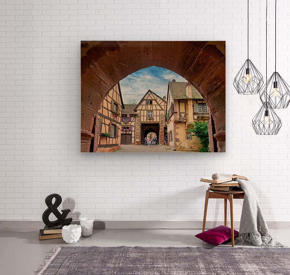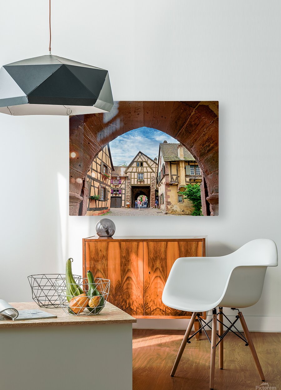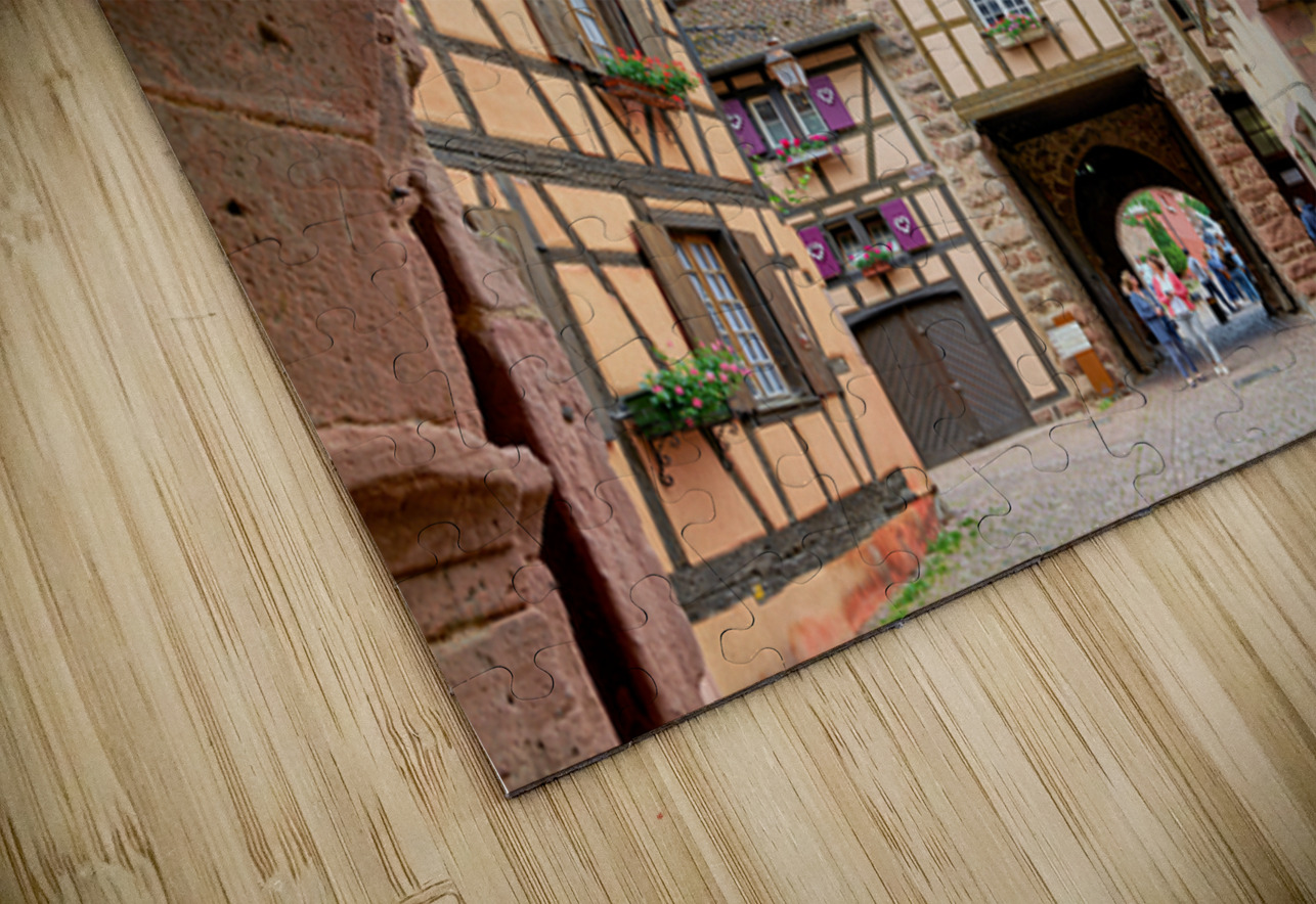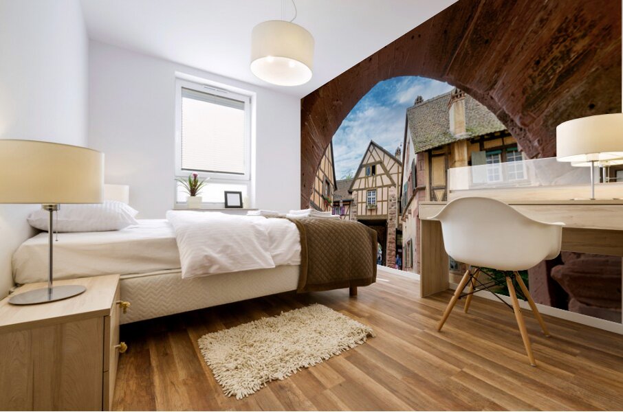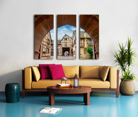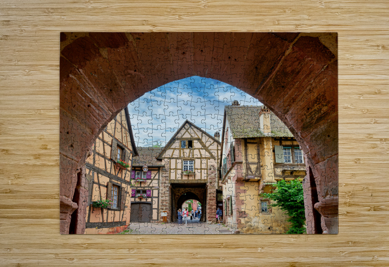 Visitors walk through an archway in Riquewihr. They explore timber framed houses and enjoy the charm of the Alsace town.