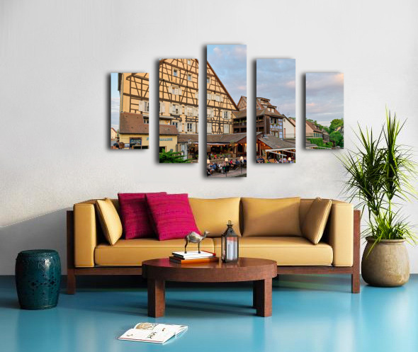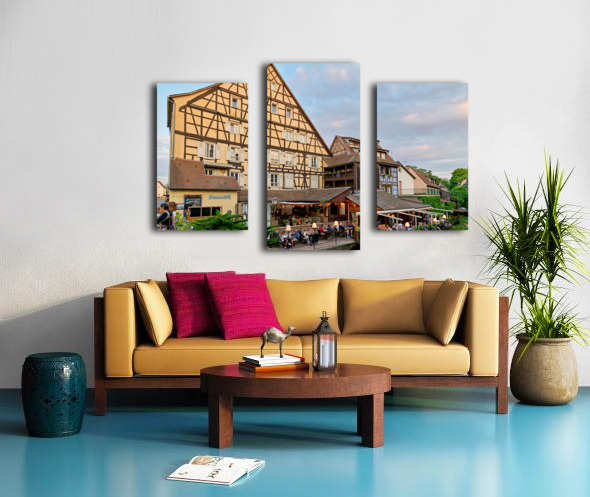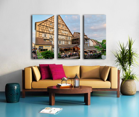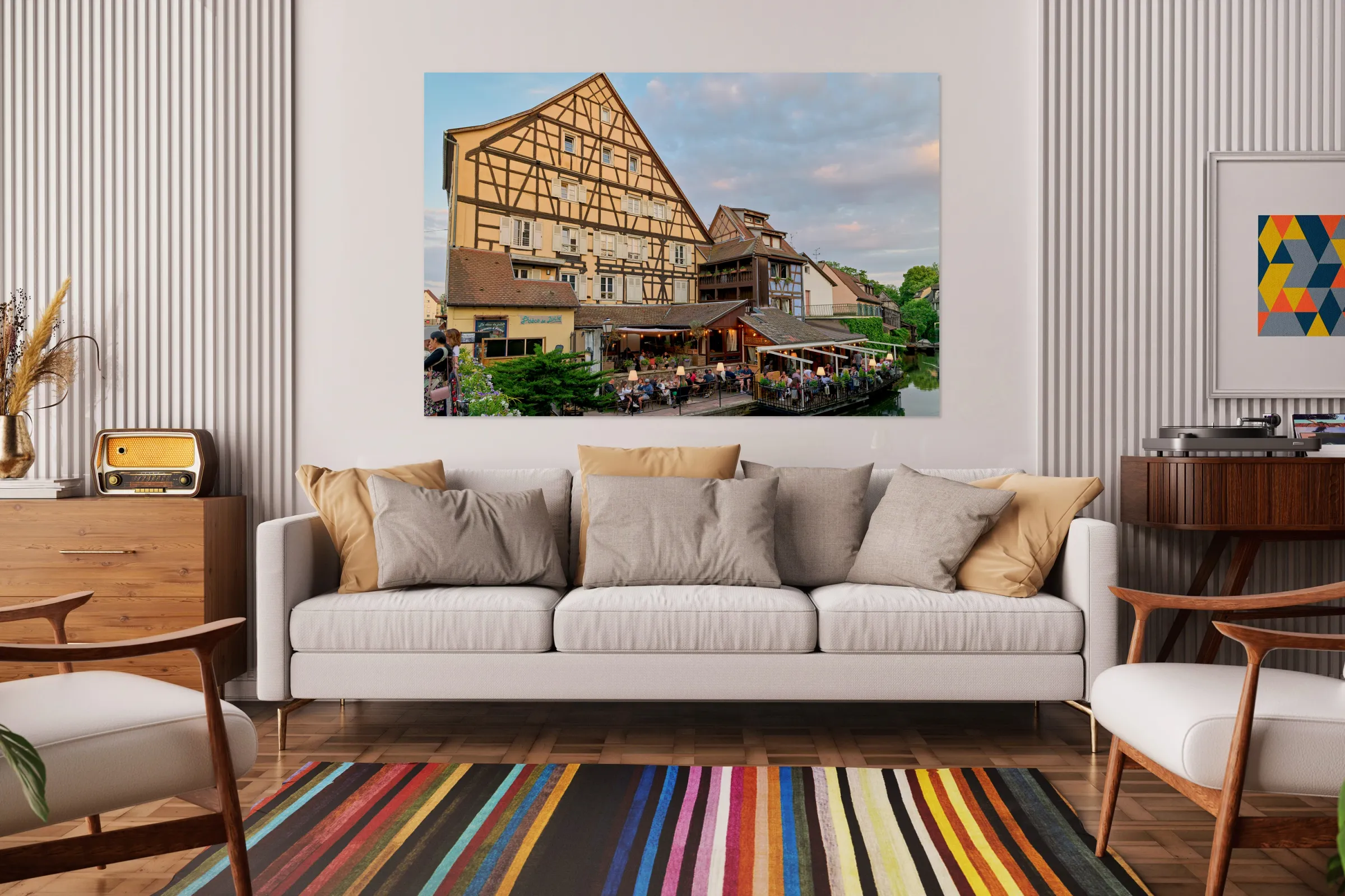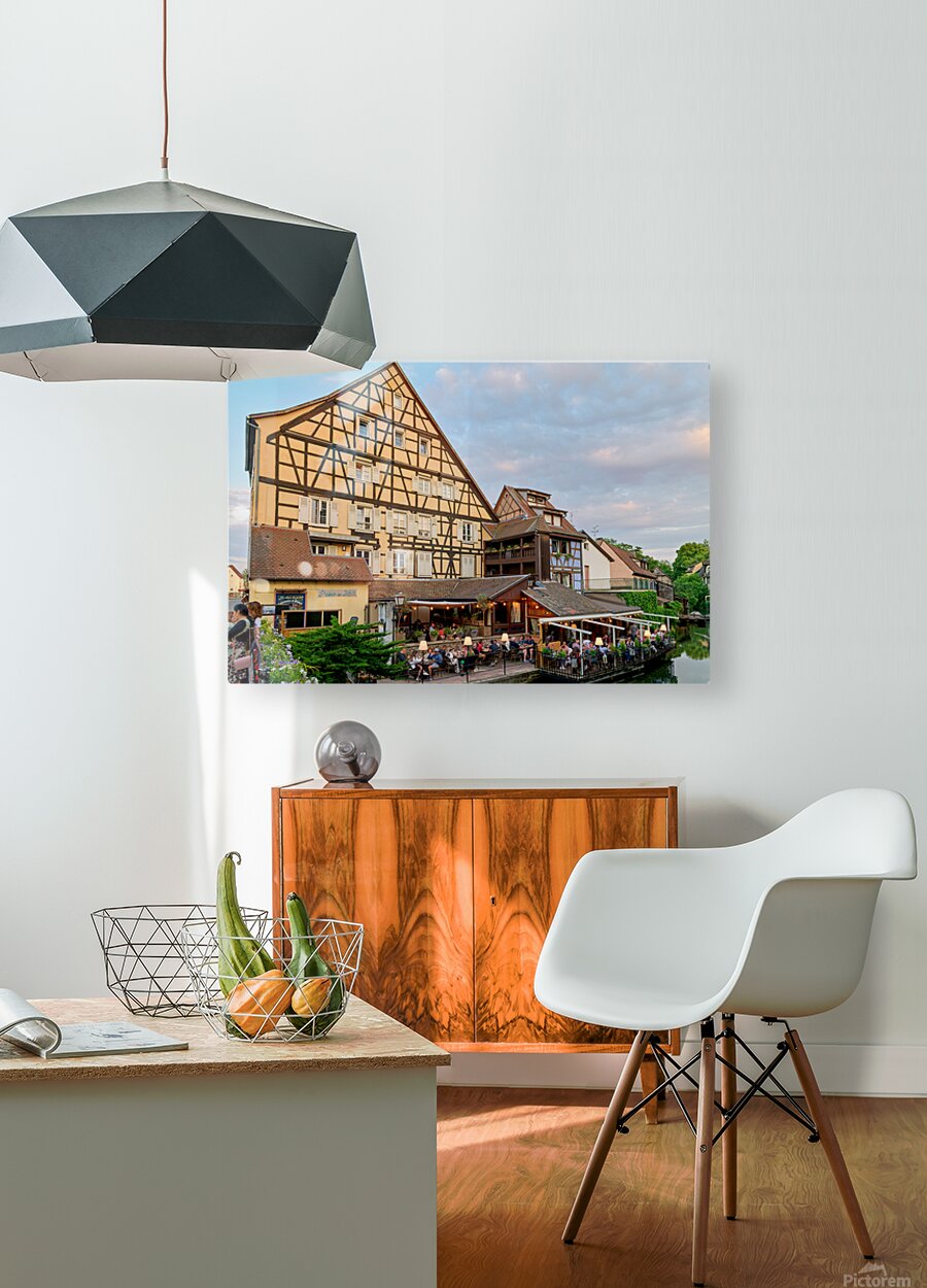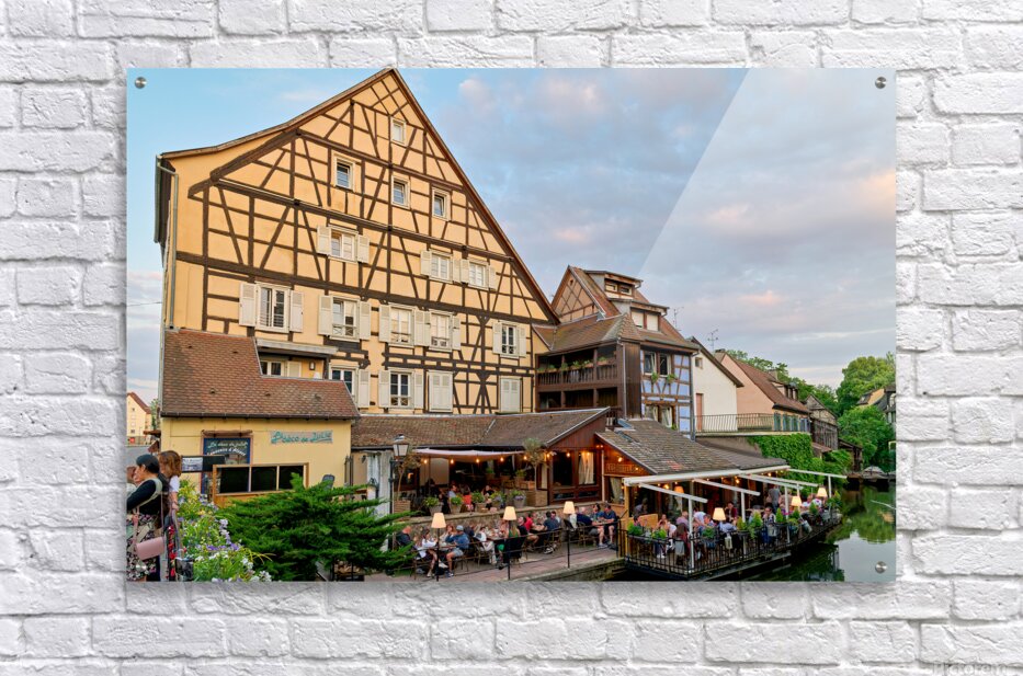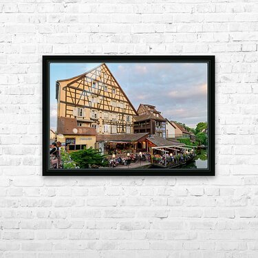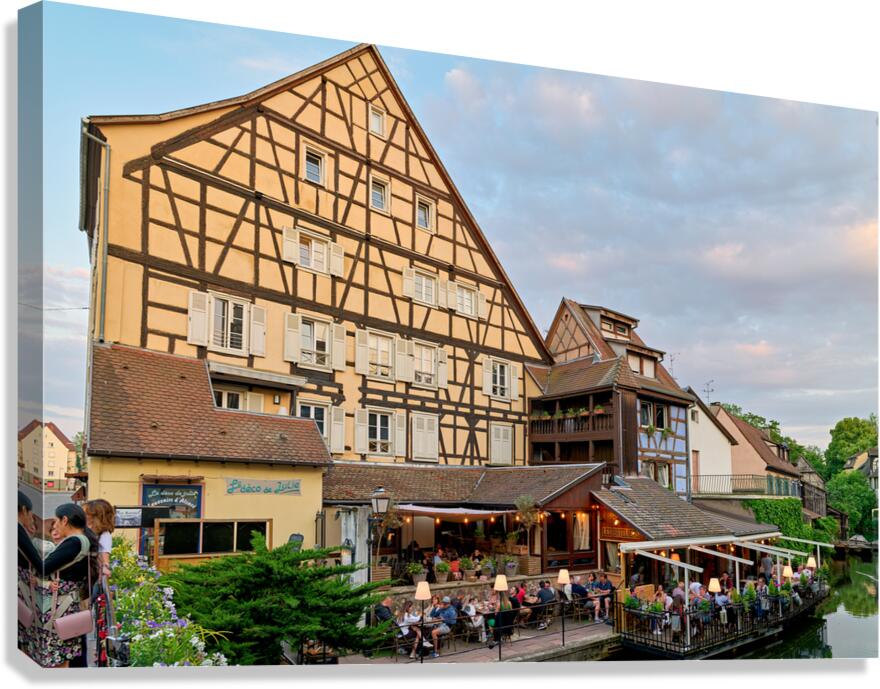 Get this artwork "Dining by the canal in Colmar with timber framed houses in view" in a framed print.