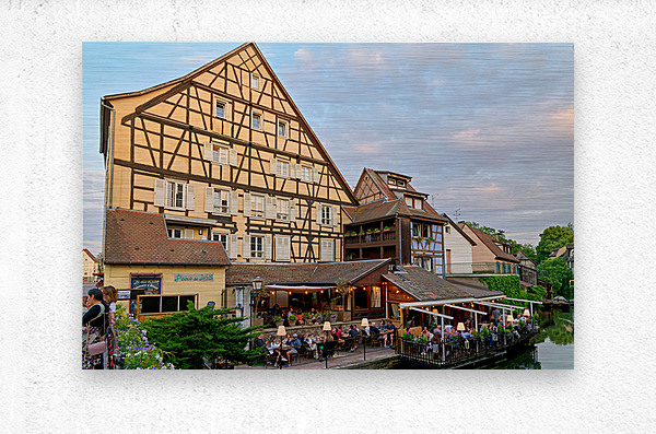 ABOUT THIS ARTWORK: DINING BY THE CANAL IN COLMAR WITH TIMBER FRAMED HOUSES IN VIEW