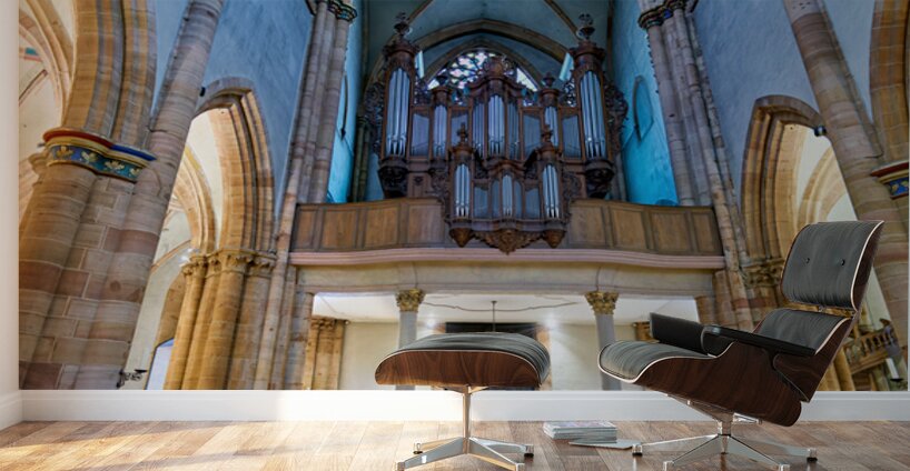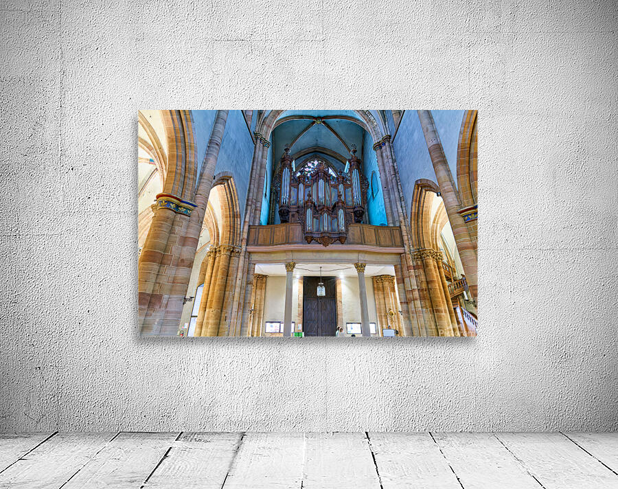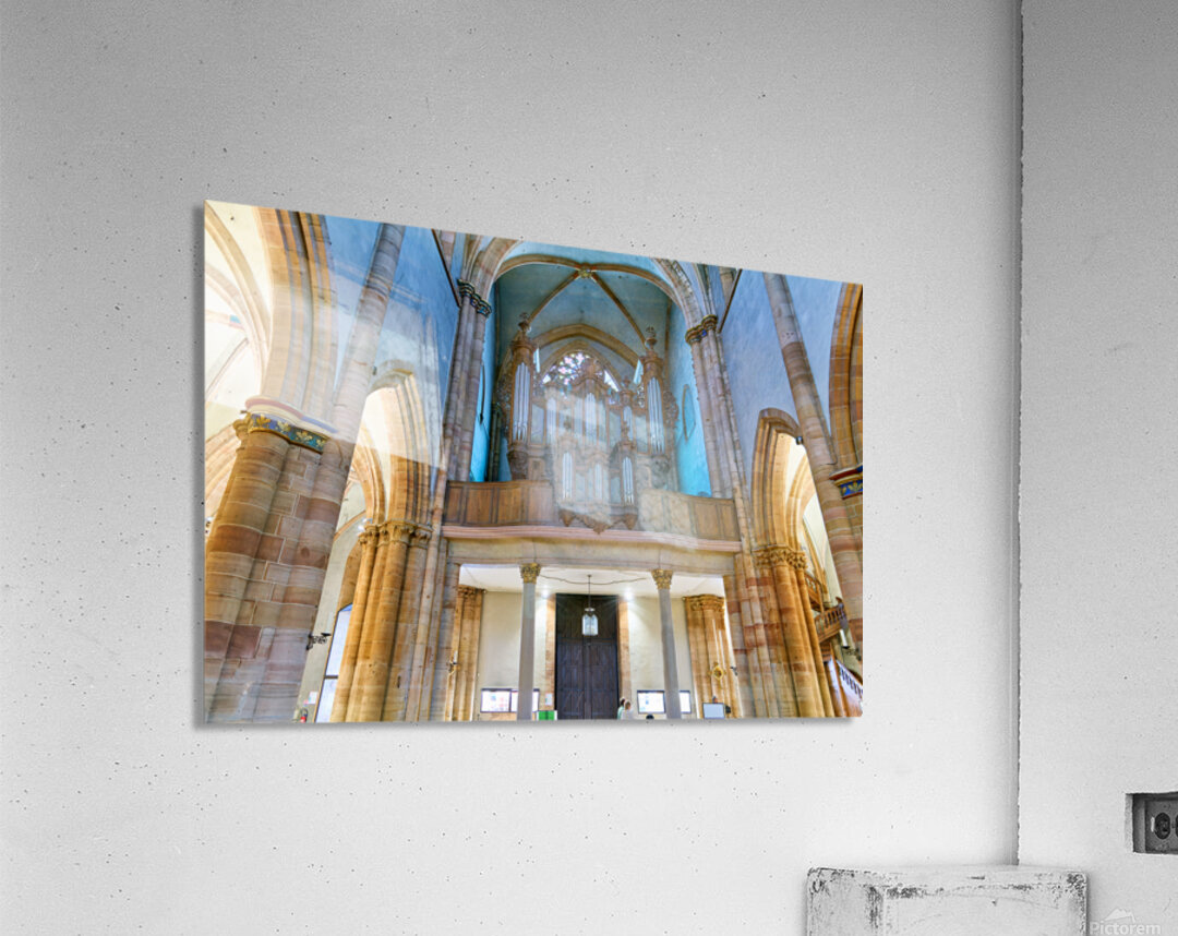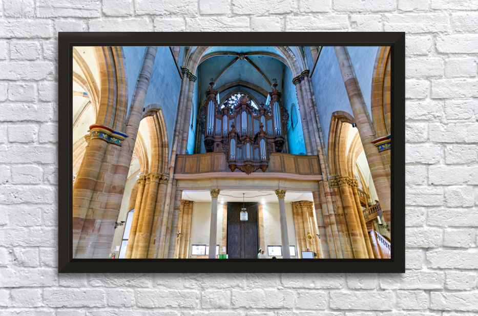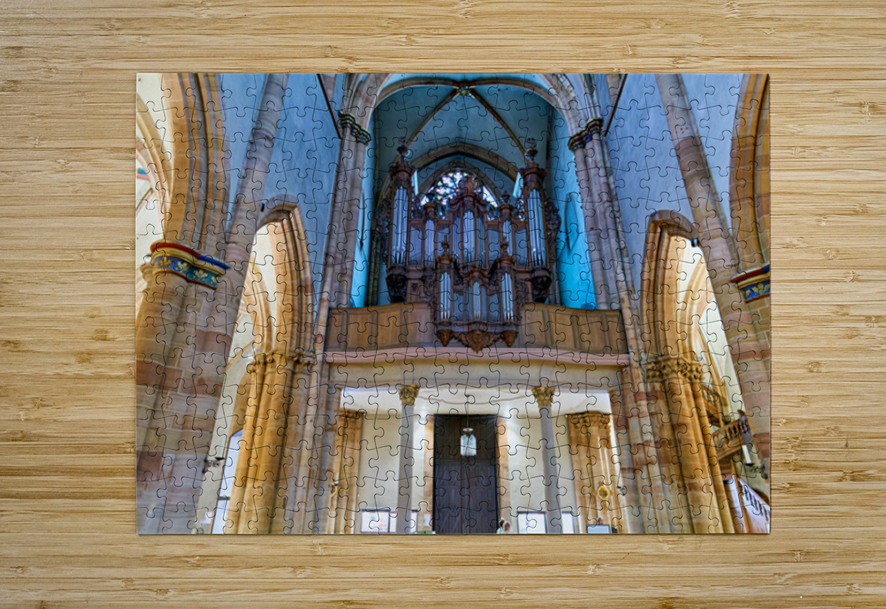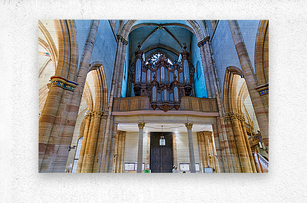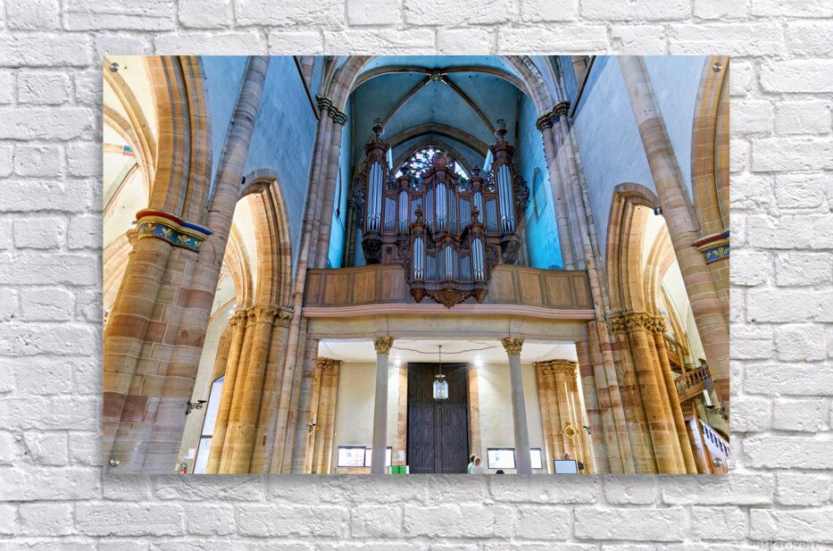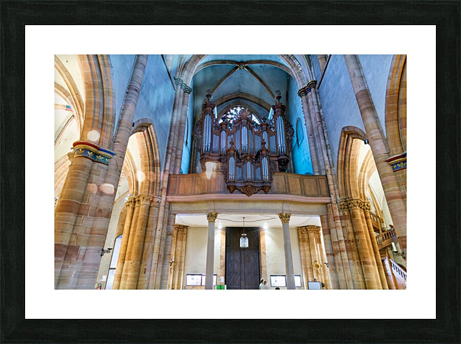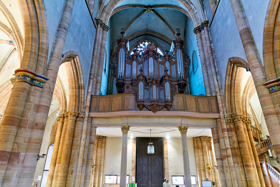 Visitors admire the tall organ pipe at St. Martin Church in Colmar Alsace. The structure showcases detailed architecture and history.