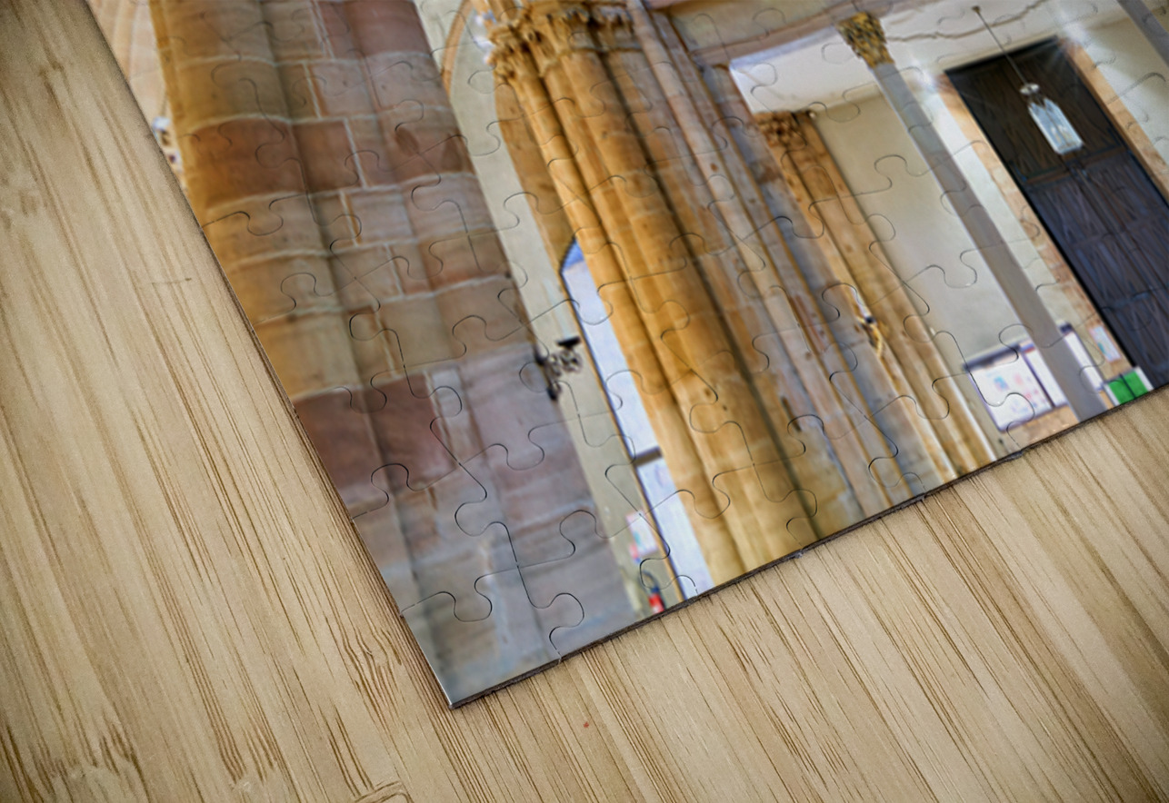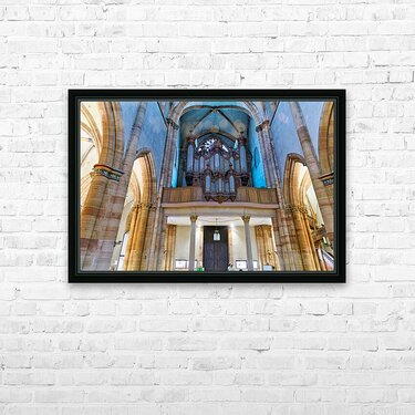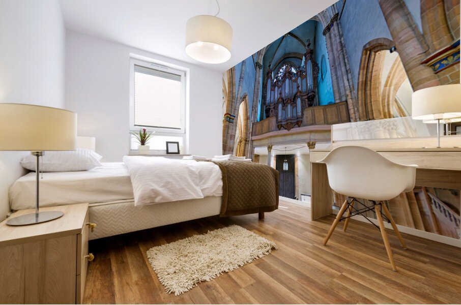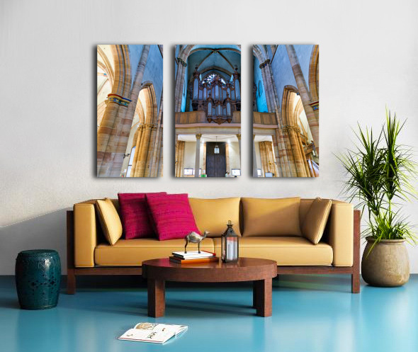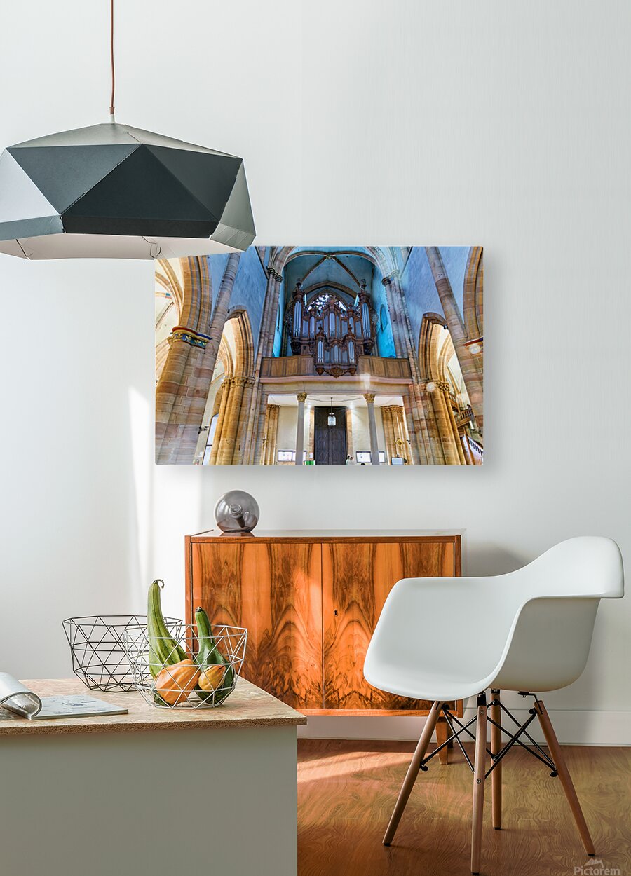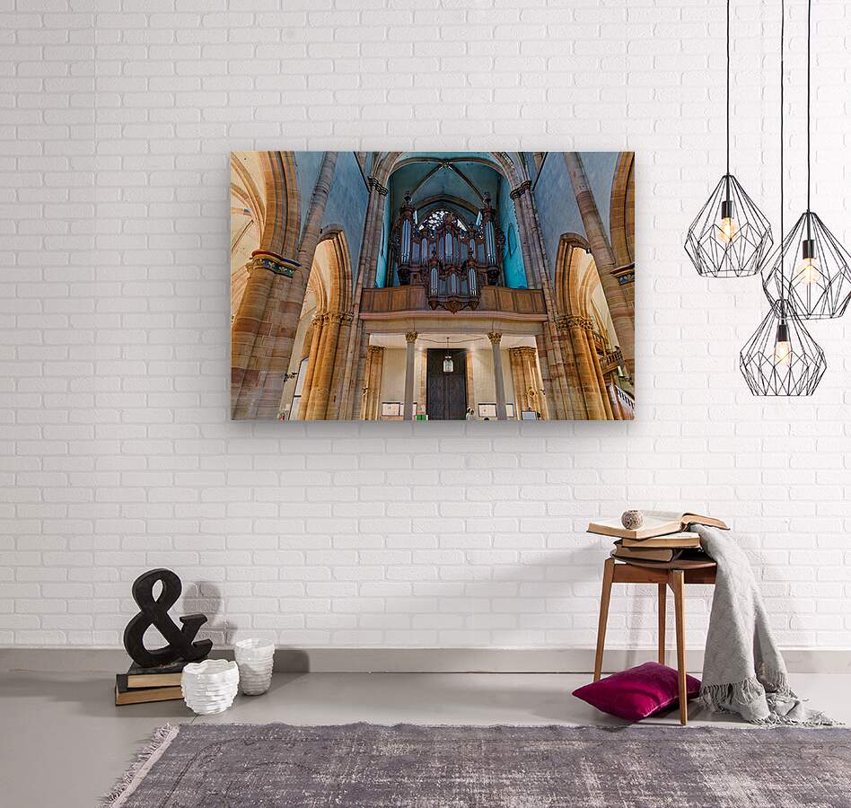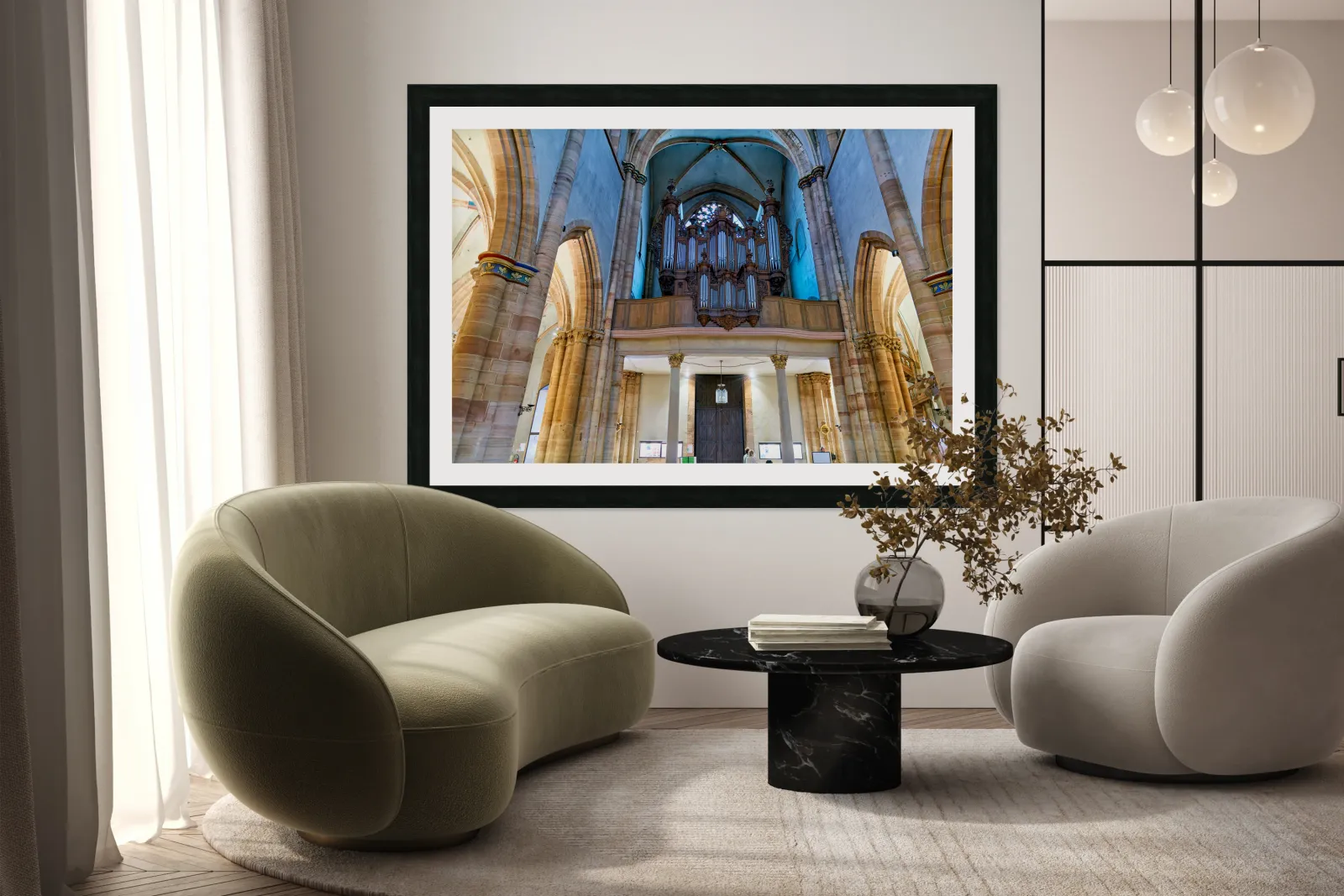 Visitors admire the tall organ pipe at St. Martin Church in Colmar Alsace. The structure showcases detailed architecture and history.