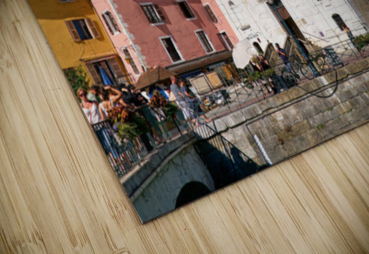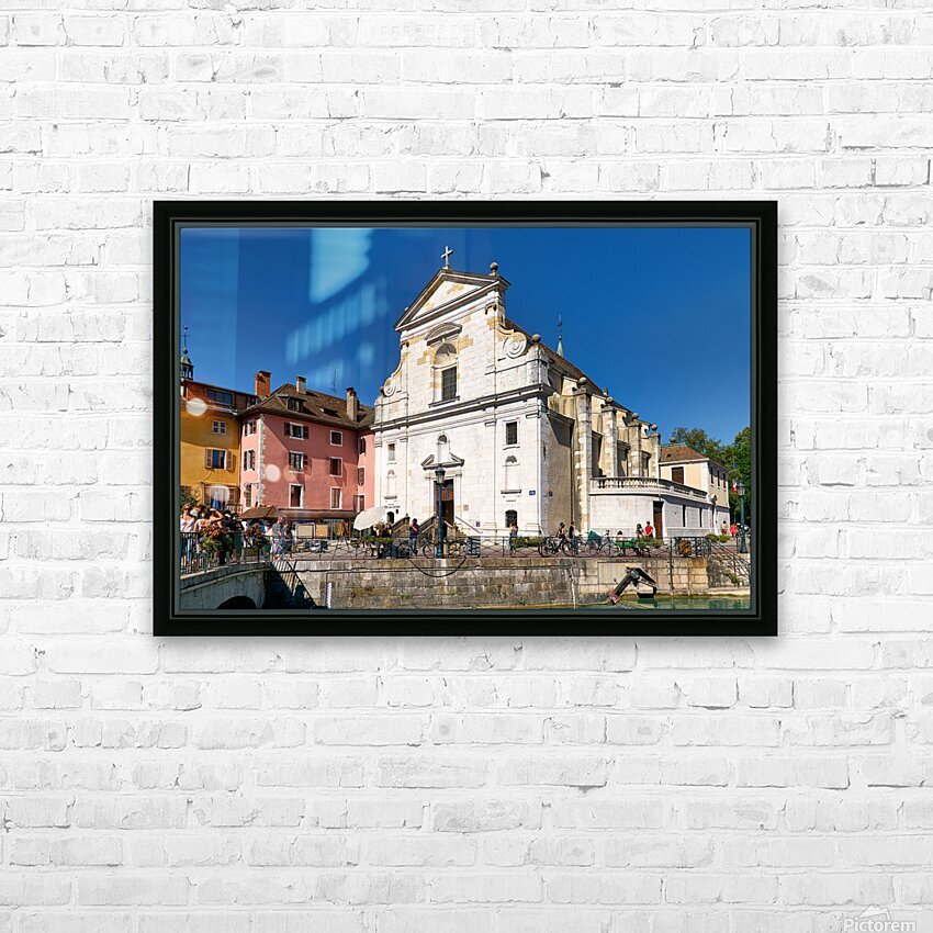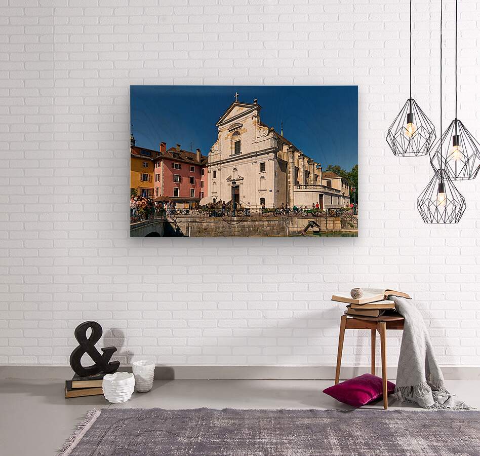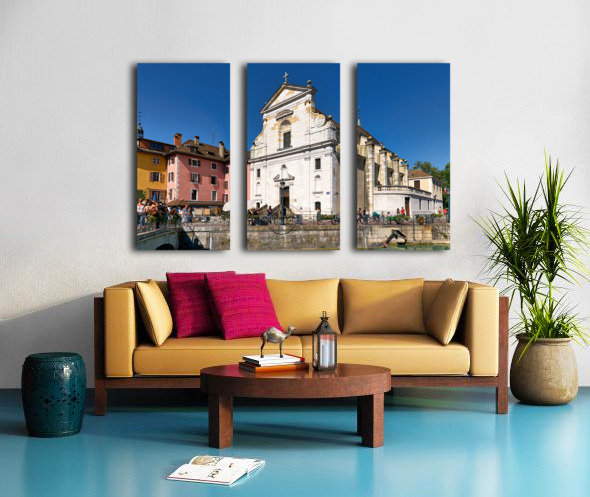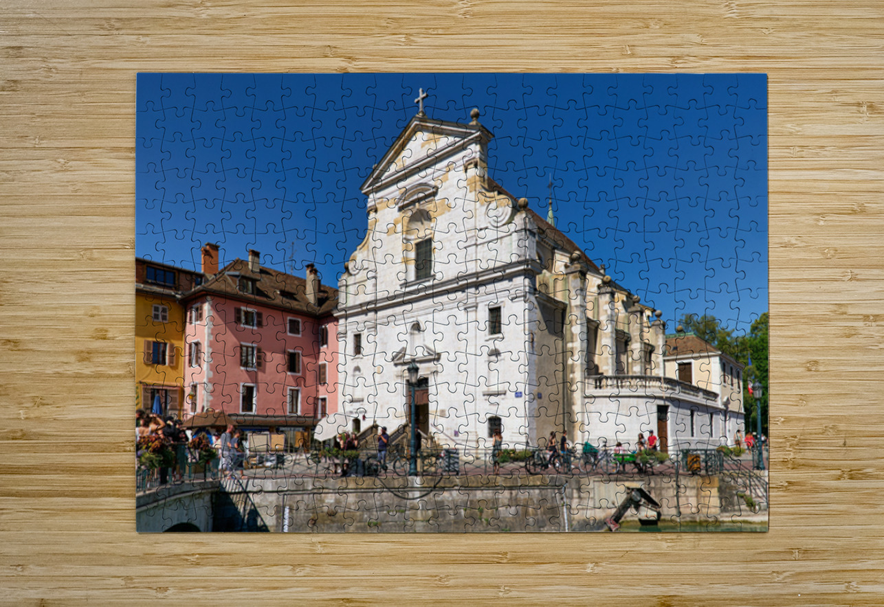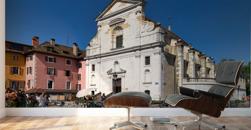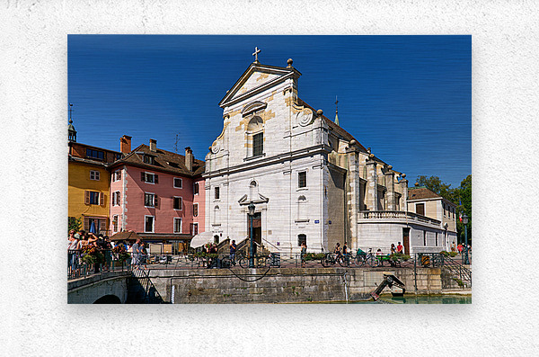 People gather near Saint Francis de Sales church in Annecy France. The sun shines on the white stone building by the water.