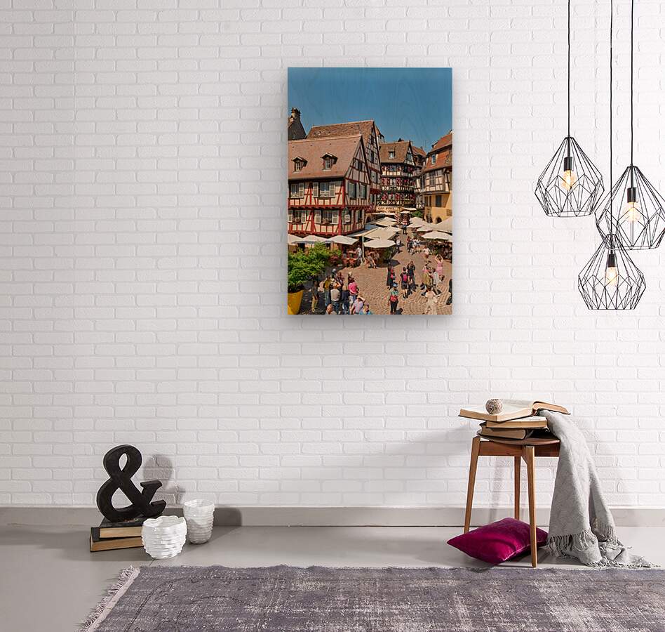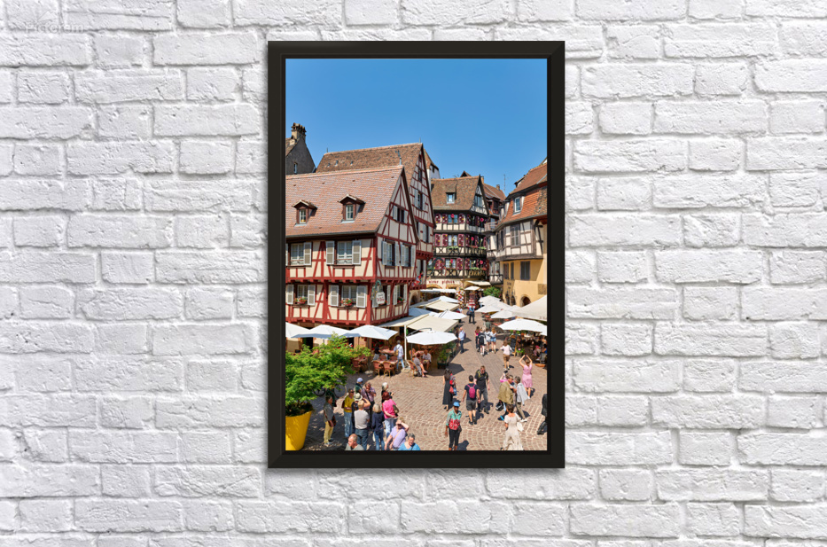 People explore the streets of Colmar in Alsace surrounded by timber framed houses under clear blue sky on a sunny day.