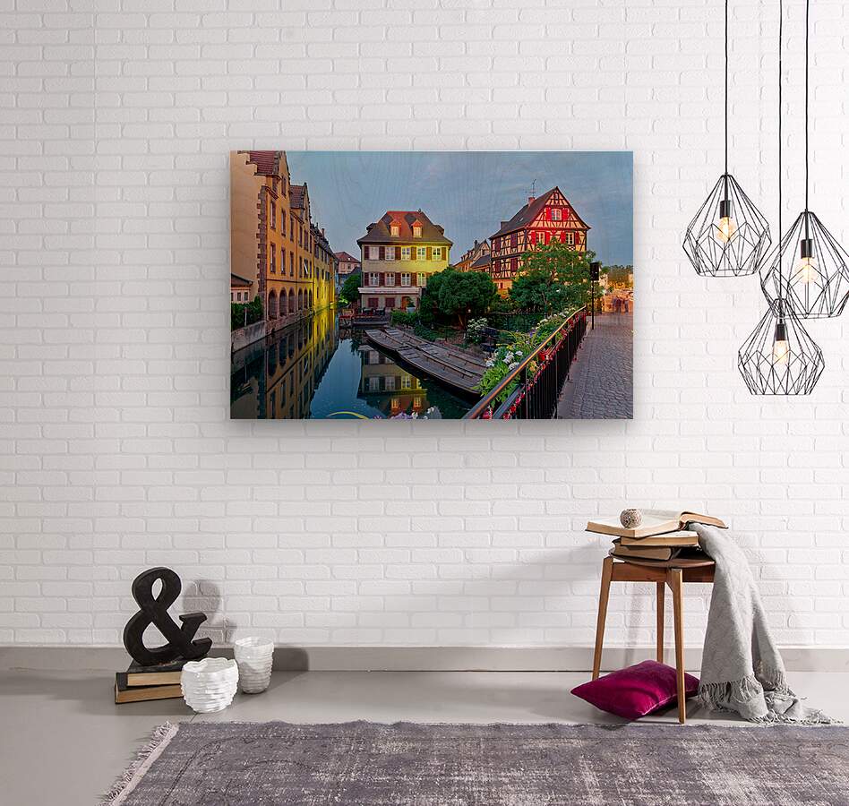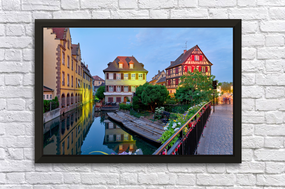 Visitors stroll along the canal in Petite Venise enjoying timber framed houses and evening lights in Colmar Alsace during dusk.