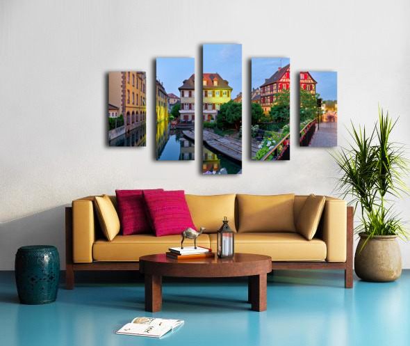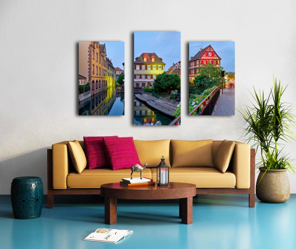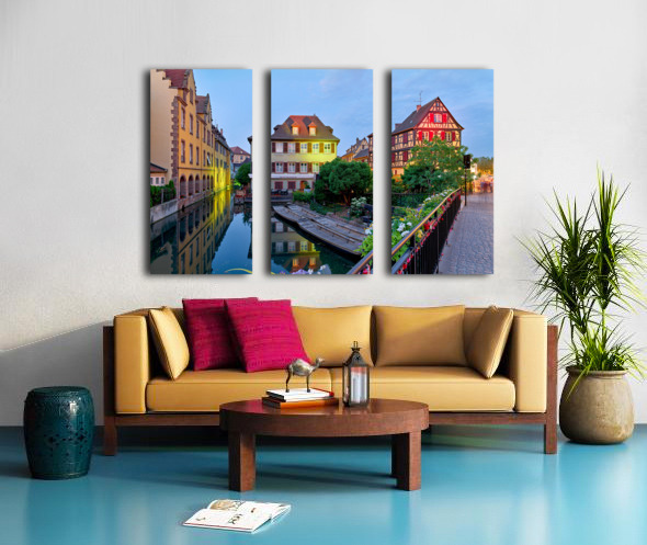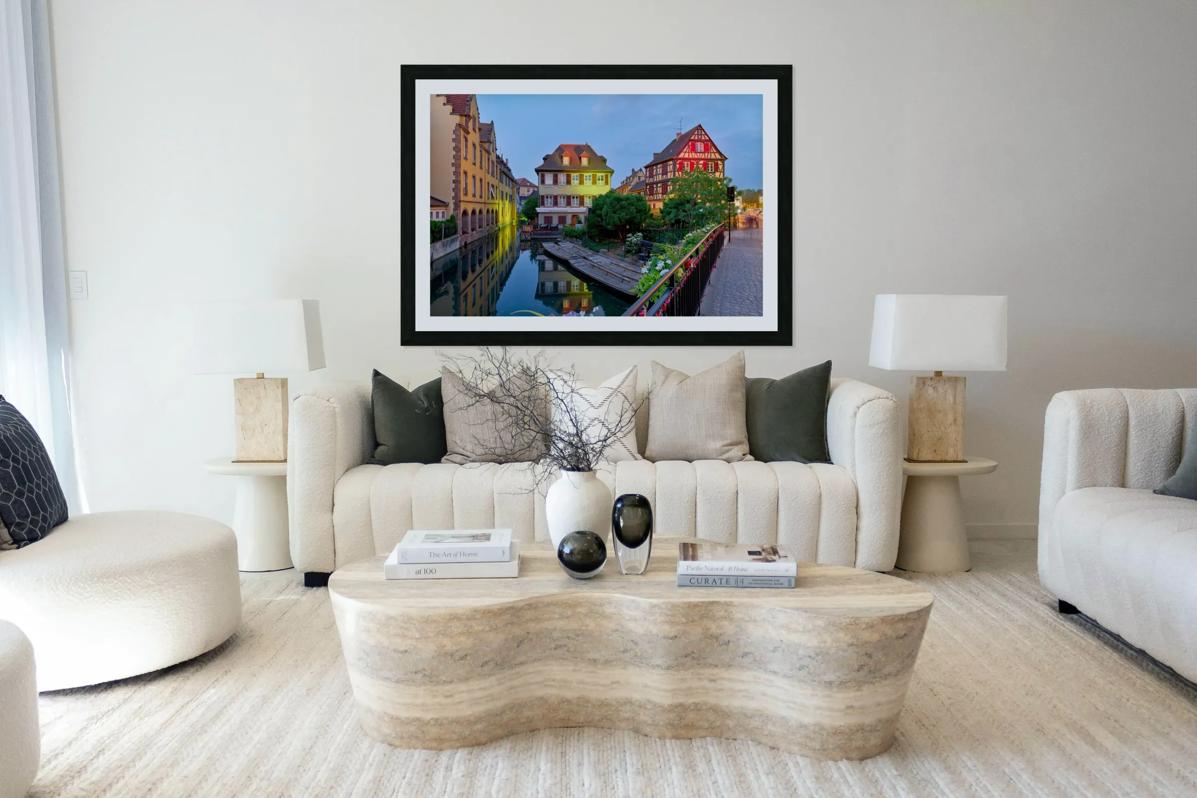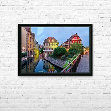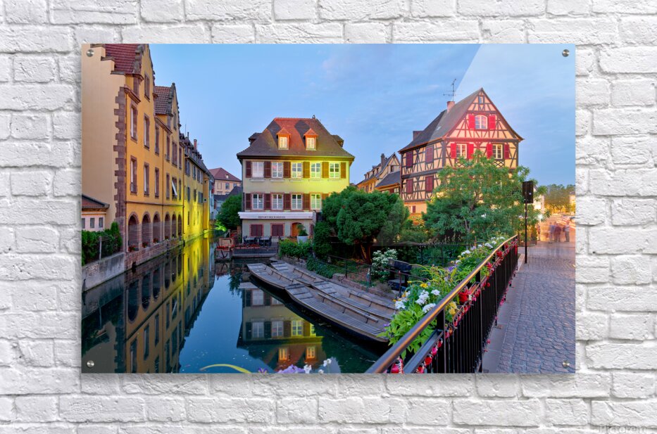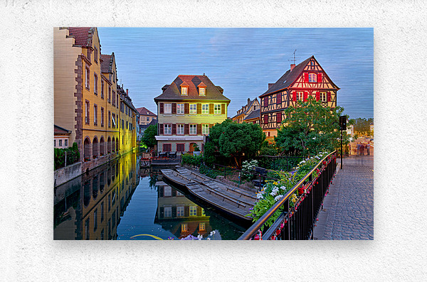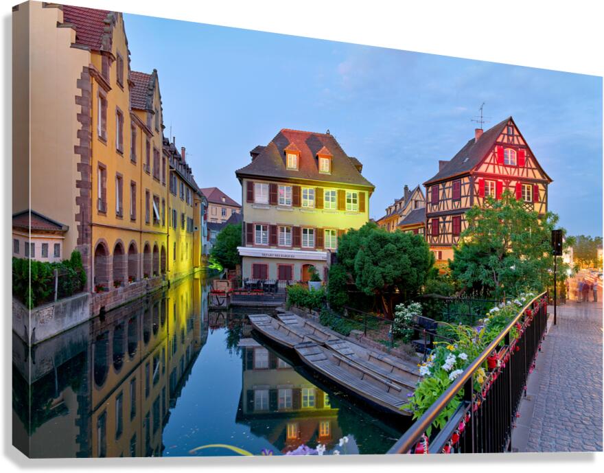 Get this artwork "Timber framed houses and visitors in Colmar canals at dusk" in a framed print.