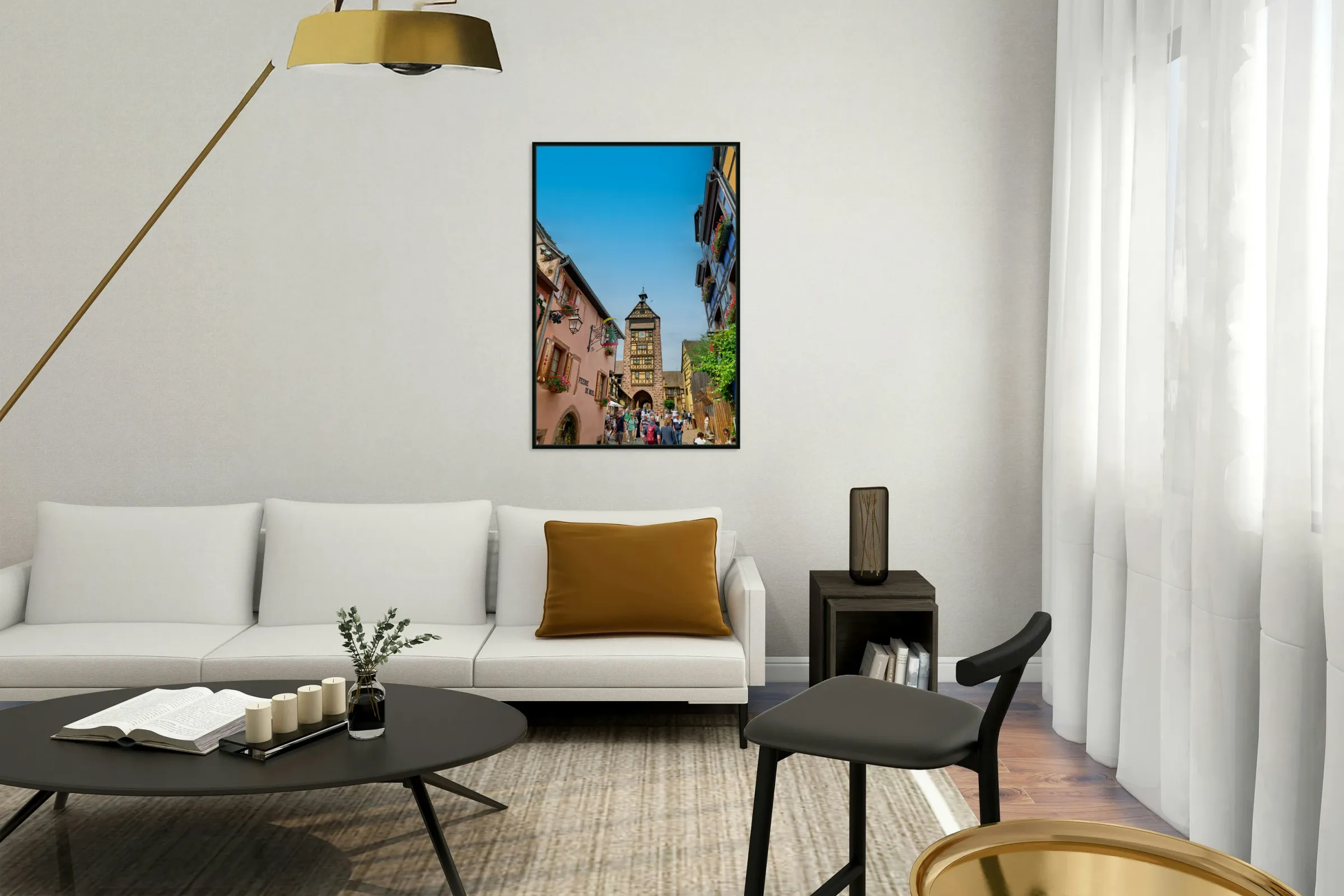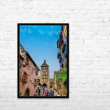 Tourists stroll through historic streets in Riquewihr Alsace Frame print