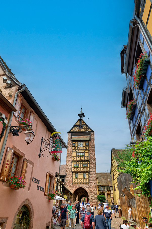 Visitors explore the historic streets of Riquewihr enjoying local shops and views of the tower on a sunny day in Alsace.