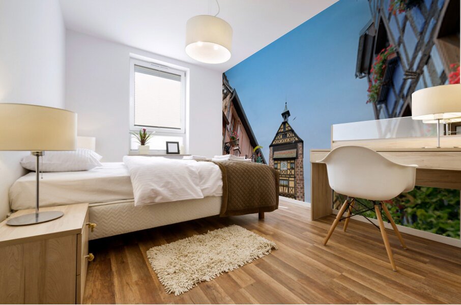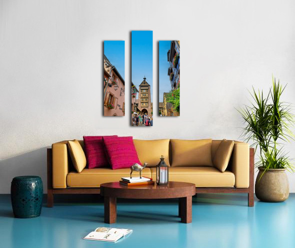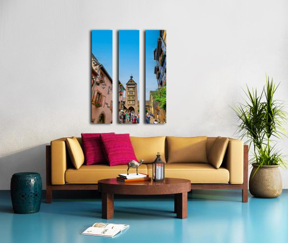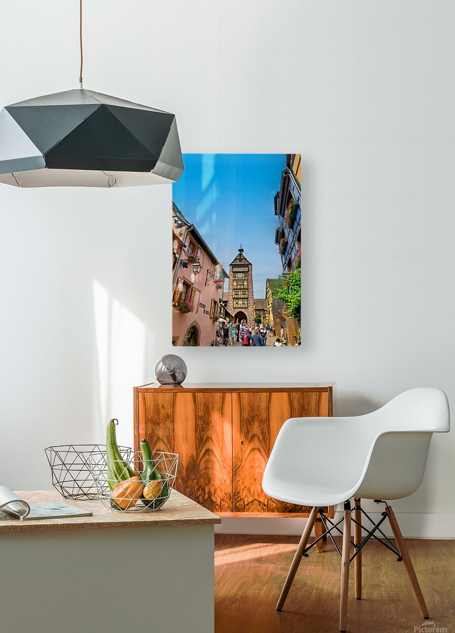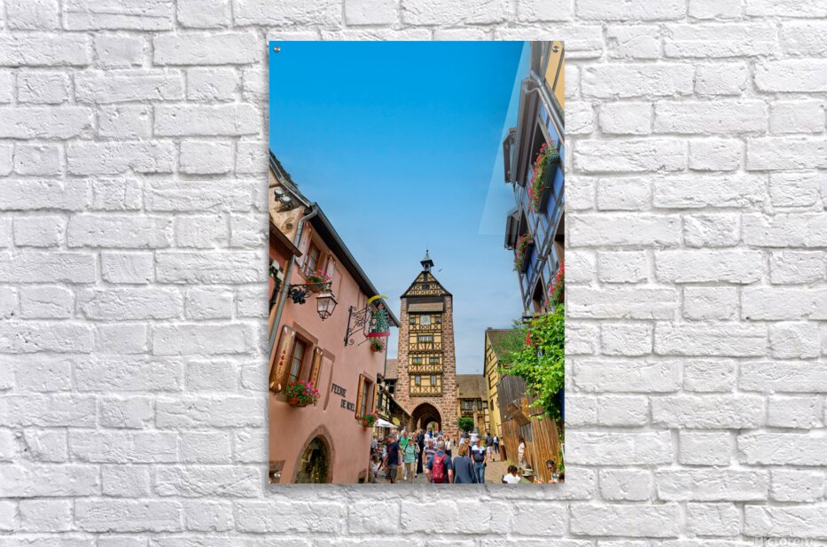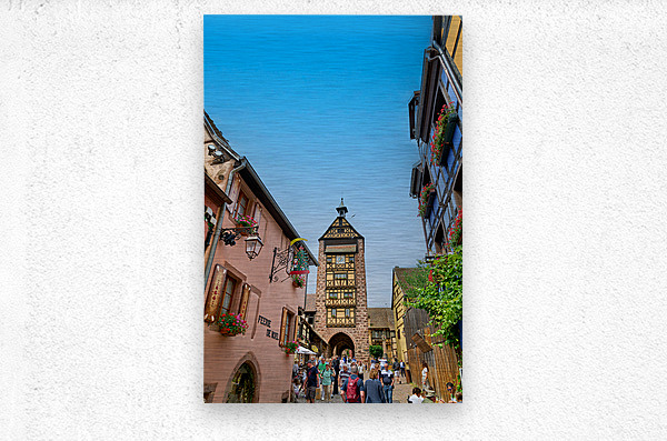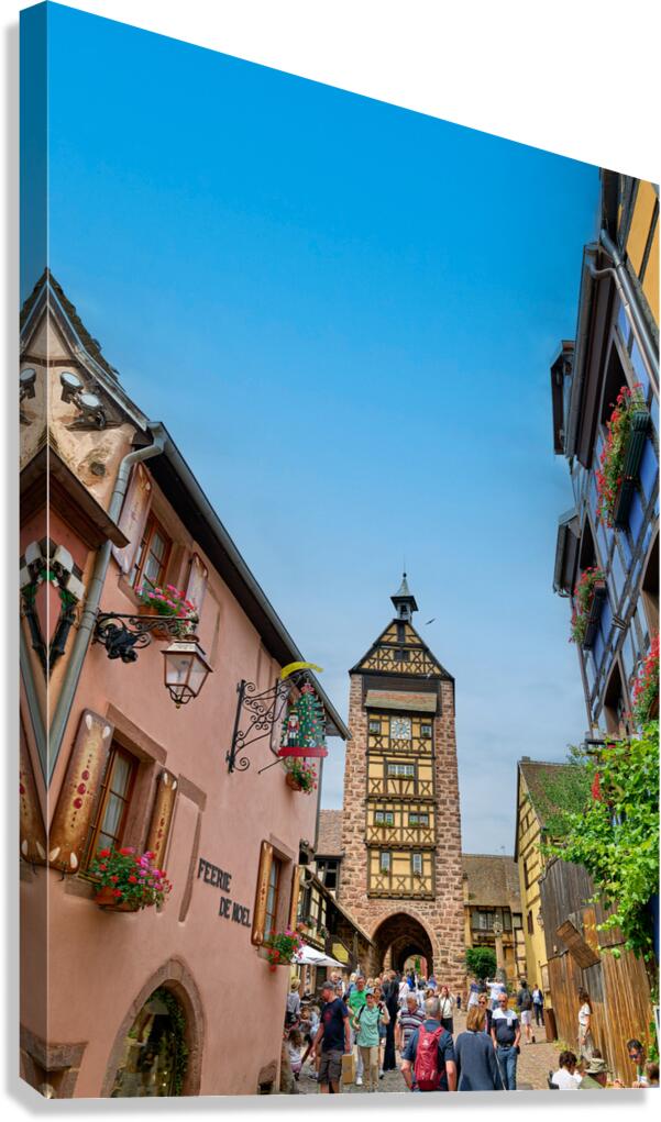 ABOUT THIS ARTWORK: TOURISTS STROLL THROUGH HISTORIC STREETS IN RIQUEWIHR ALSACE