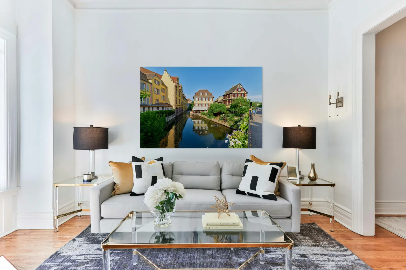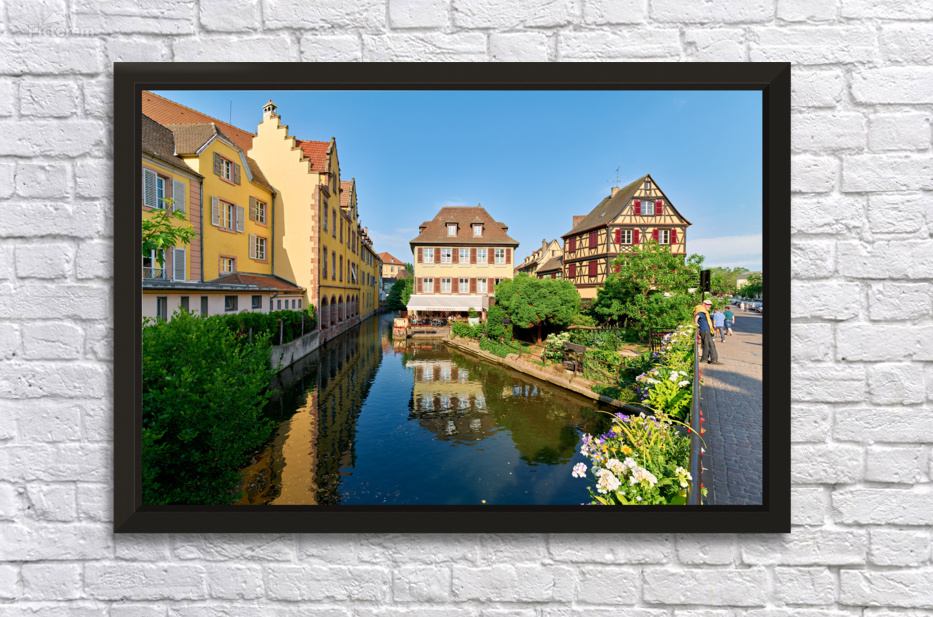 Visitors walk along the canals of Petite Venise in Colmar. Timber framed houses reflect in the water under a clear blue sky.