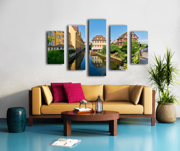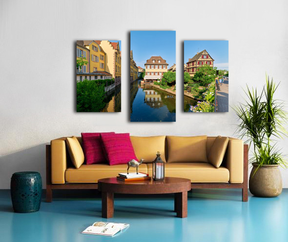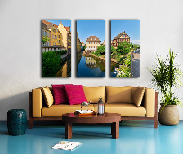 Get this artwork "Visitors enjoy sunny day by canals in Colmar France" in a framed print.
