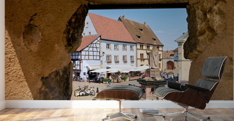 ABOUT THIS ARTWORK: VISITORS ENJOY SAINT LEON SQUARE IN EGUISHEIM ALSACE ON WINE ROU