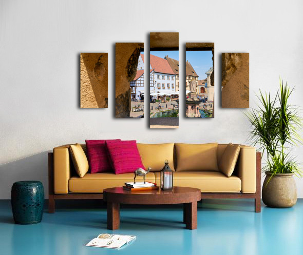 Visitors enjoy Saint Leon square in Eguisheim Alsace on wine rou Frame print