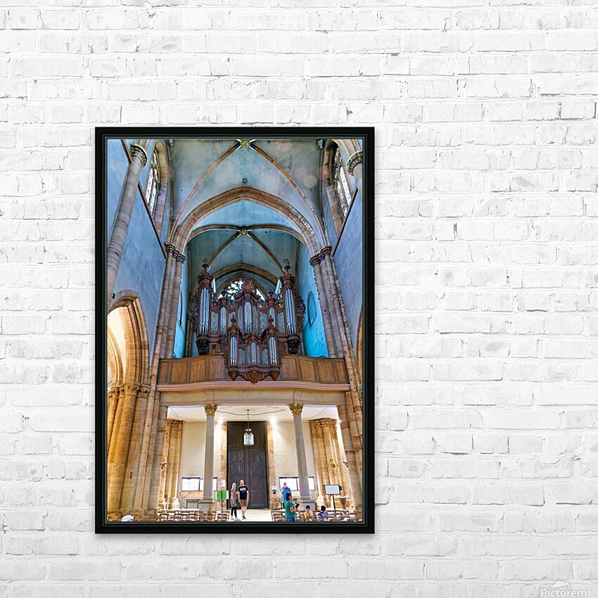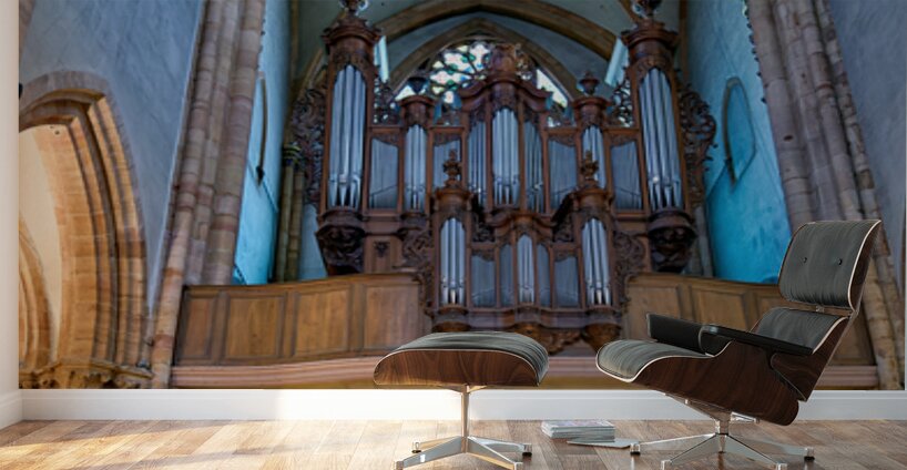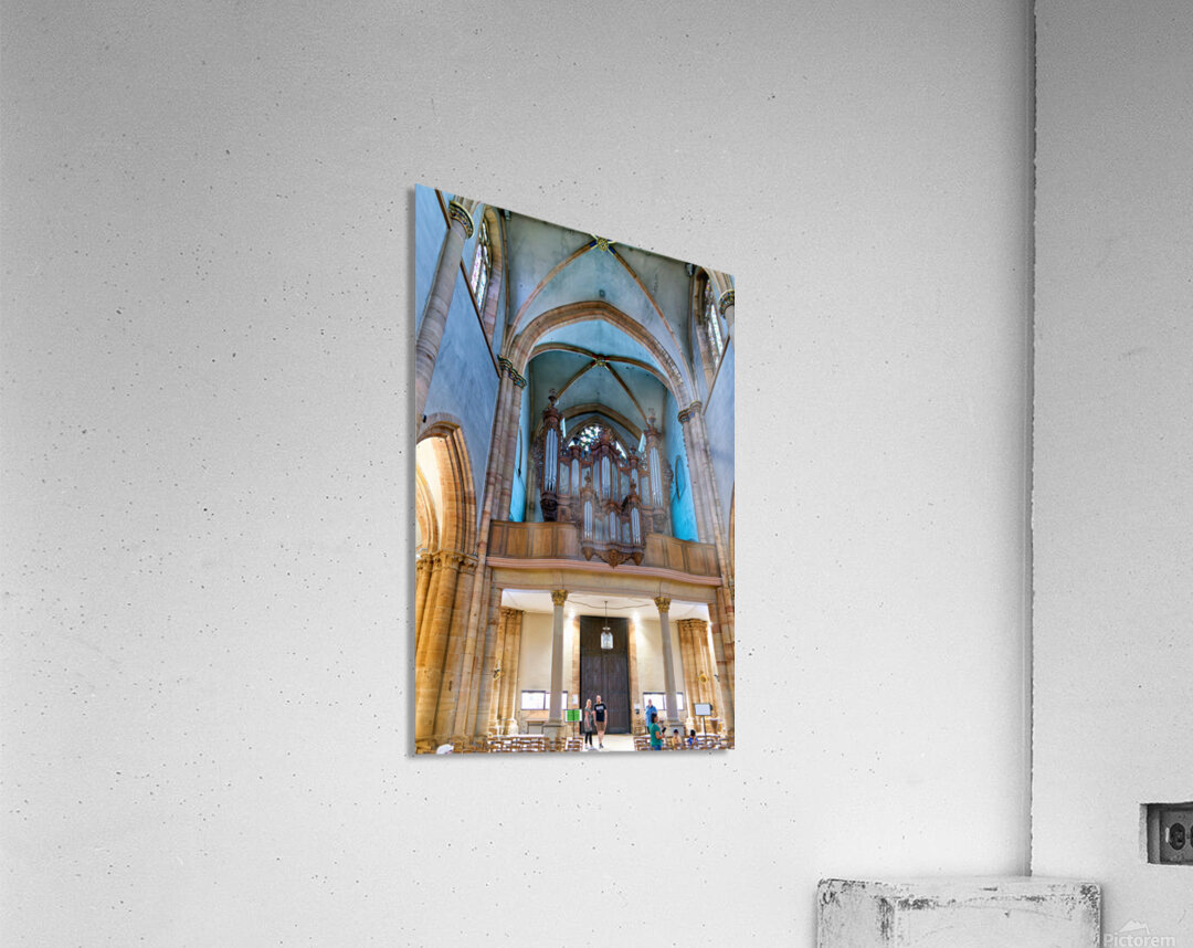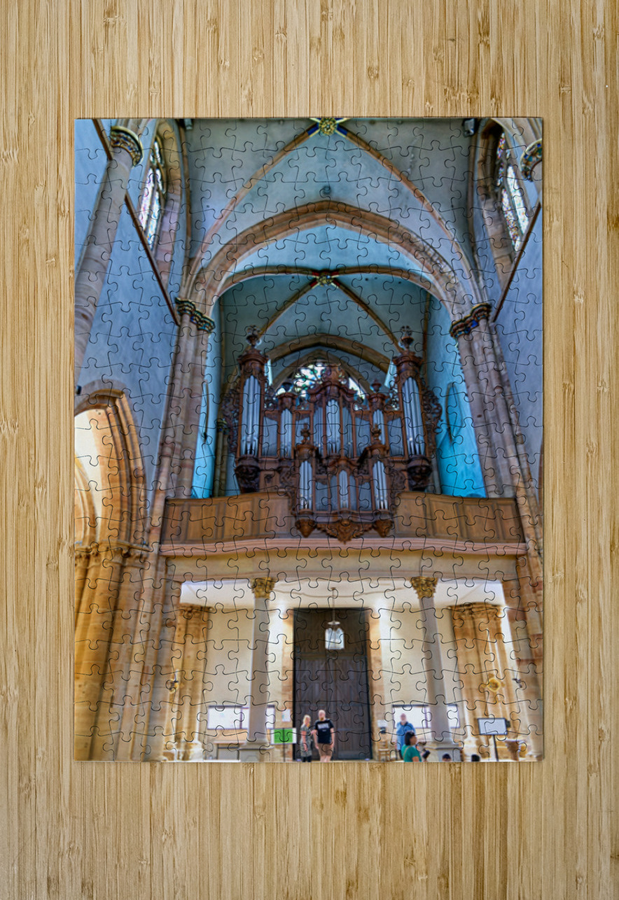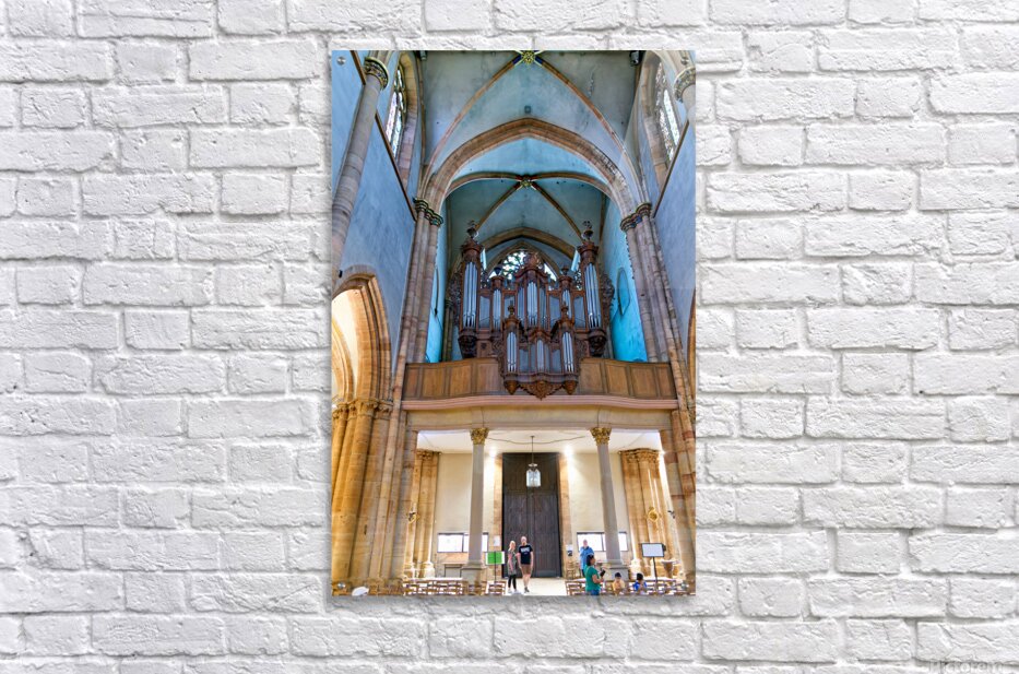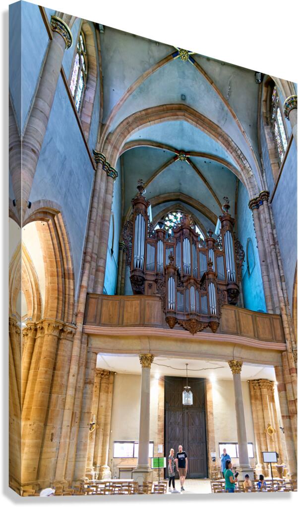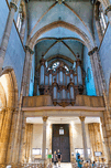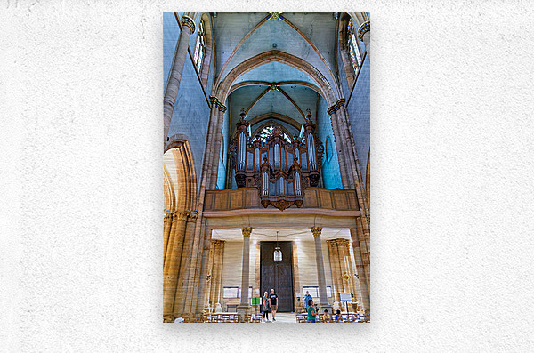 People appreciate the architecture and history of St. Martin Church in Colmar Alsace. The organ pipe stands out in the background.