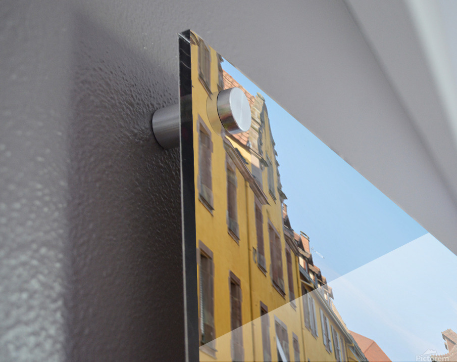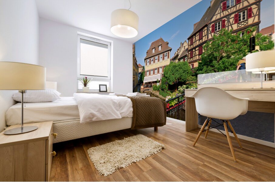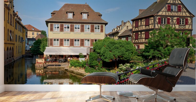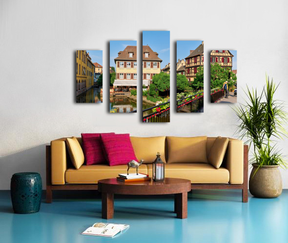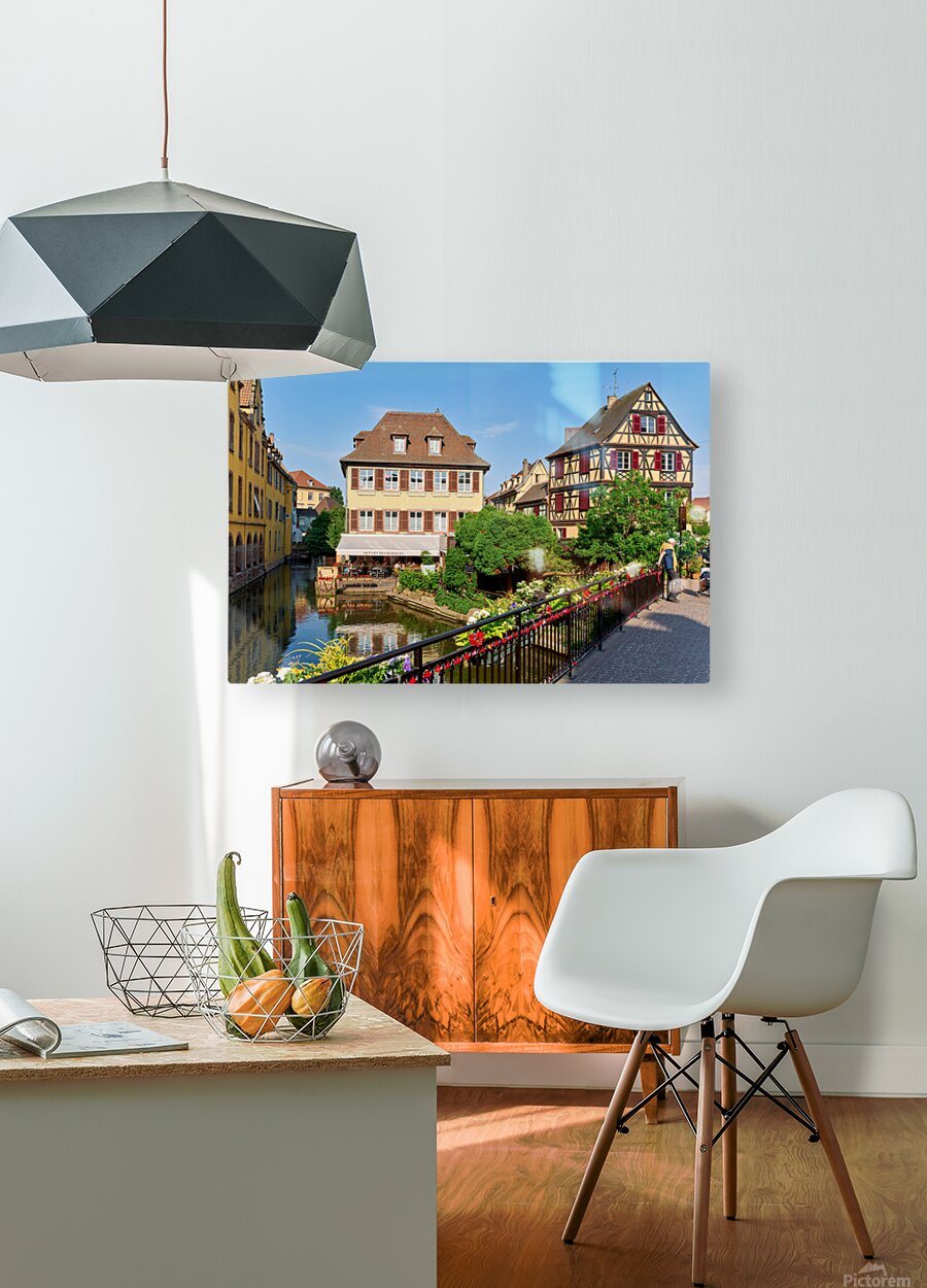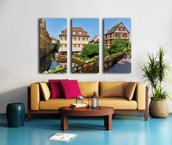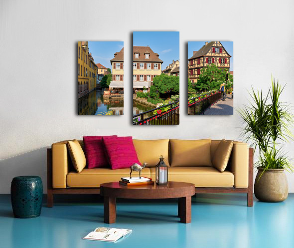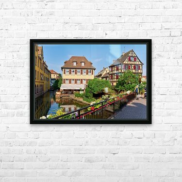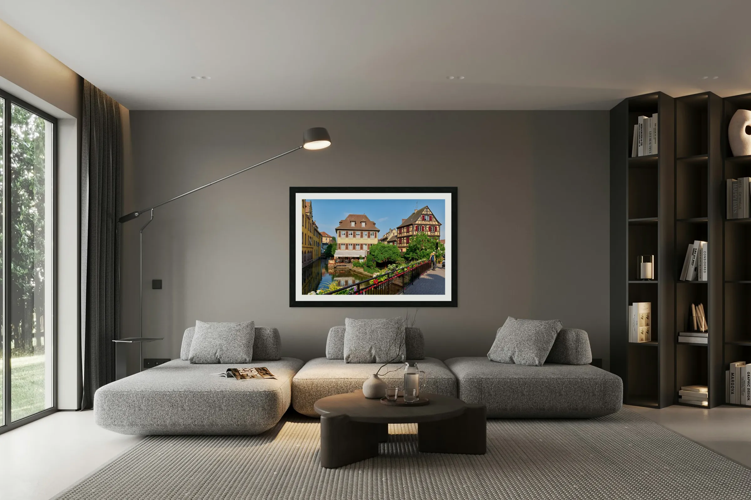 Visitors stroll by timber framed houses along the canal in Colma Frame print