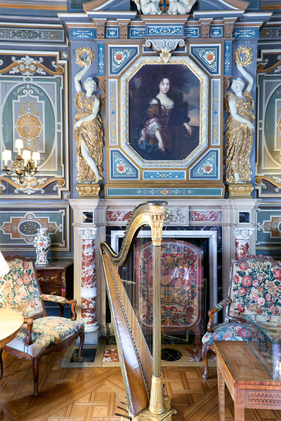 A harp stands in front of a colorful wall with statues and artwork in Chateau de Cheverny. The room shows luxury and design in France.