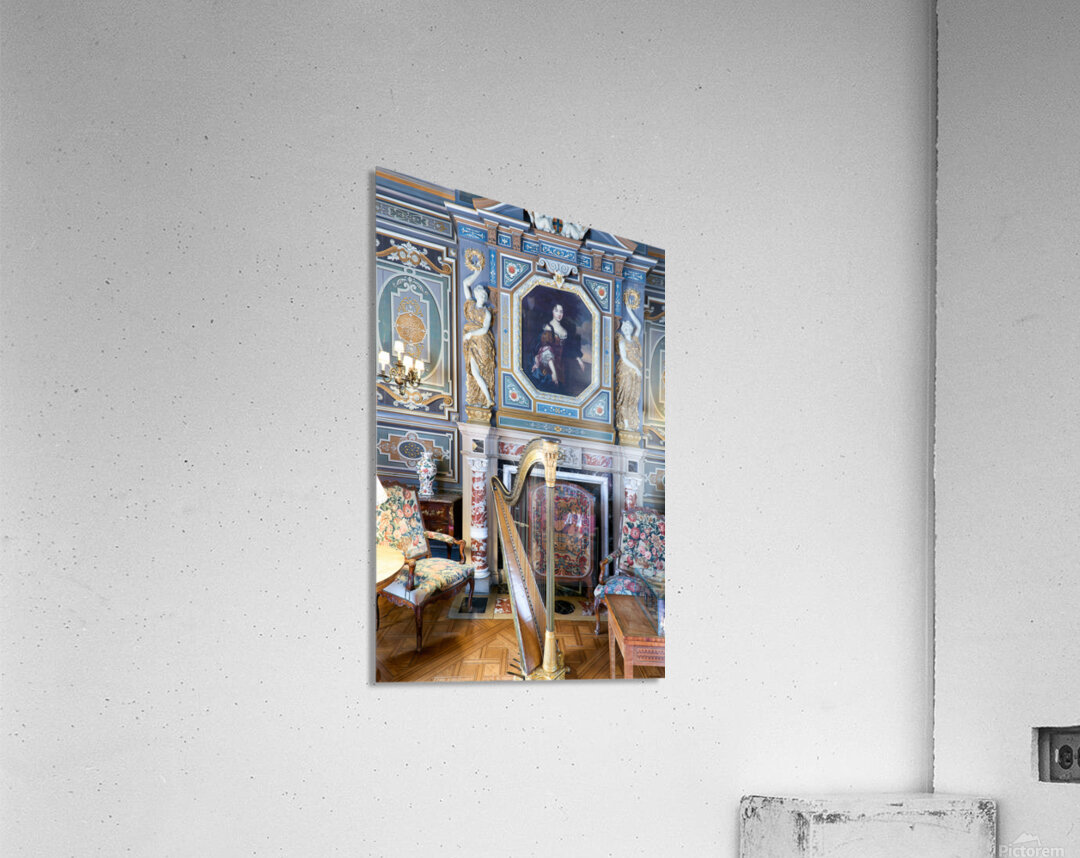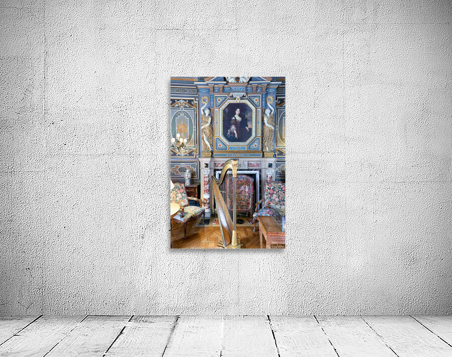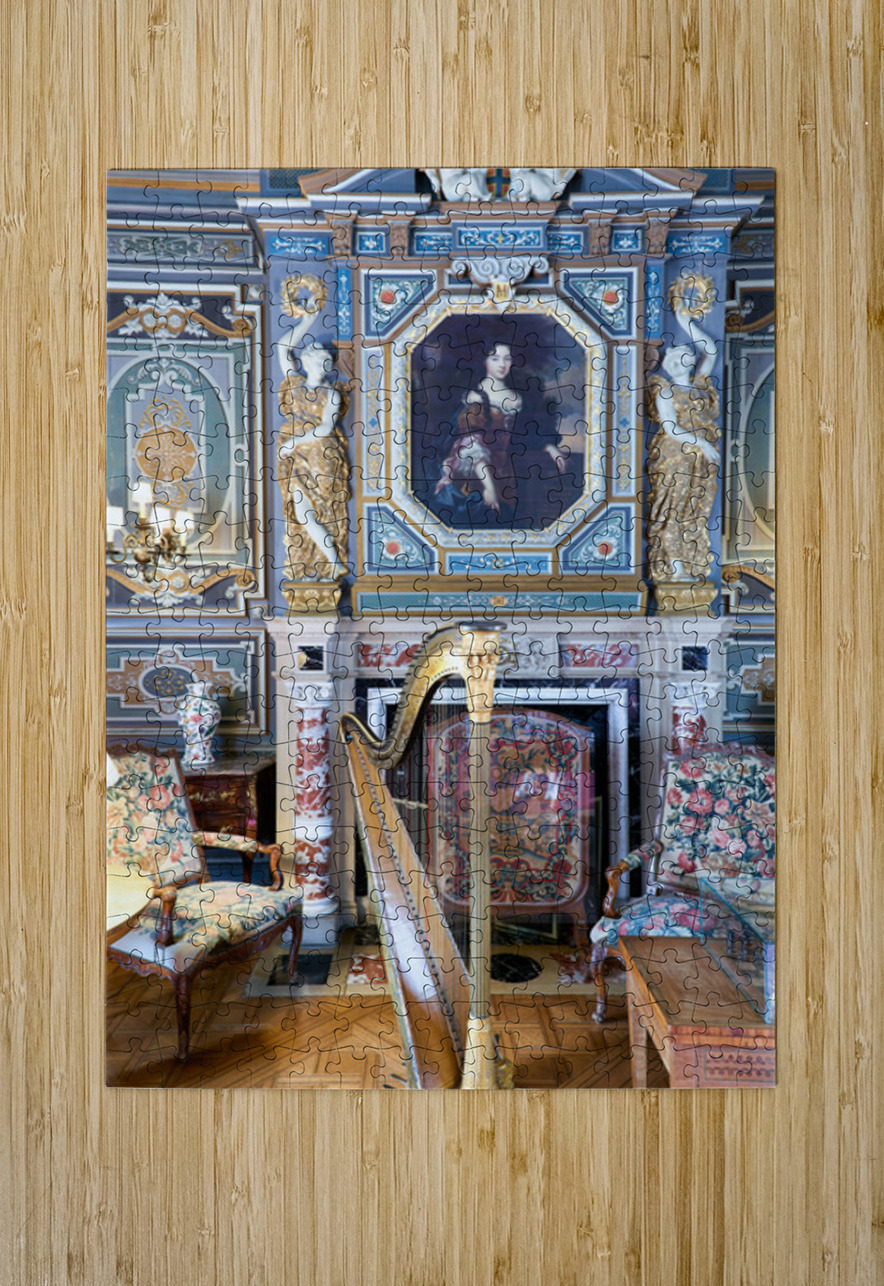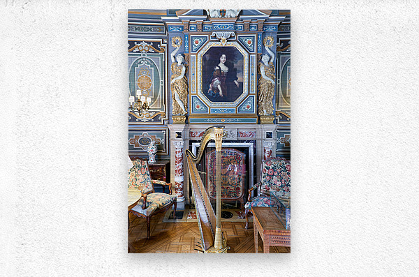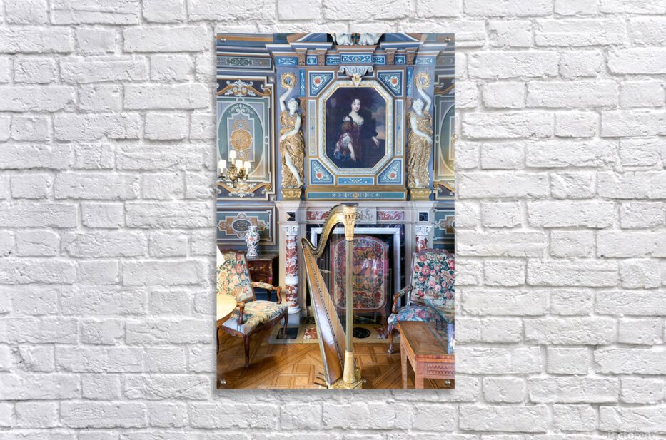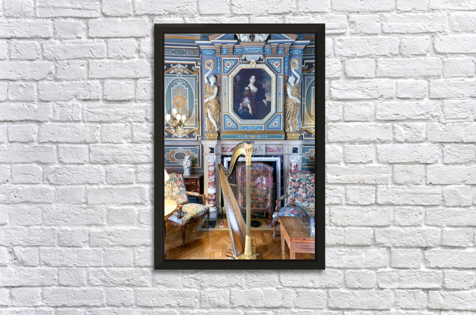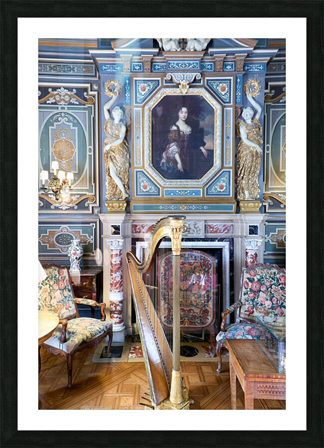 "Harp and elegant decor in the Chateau de Cheverny France" in a framed print.