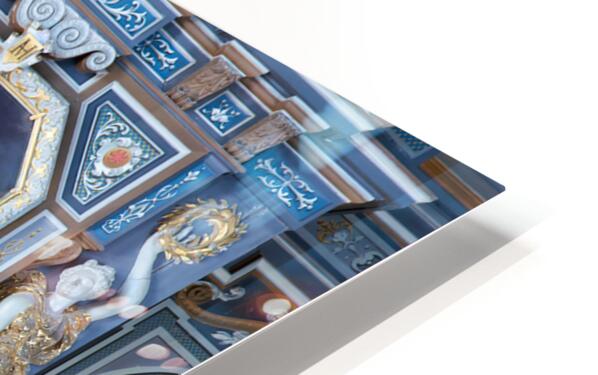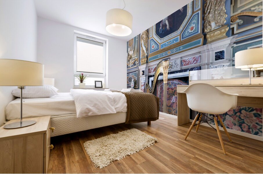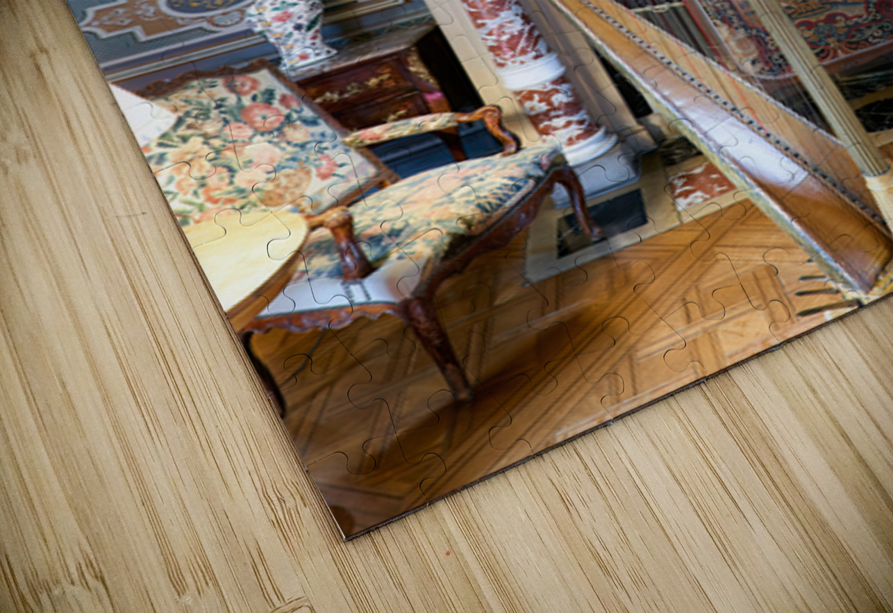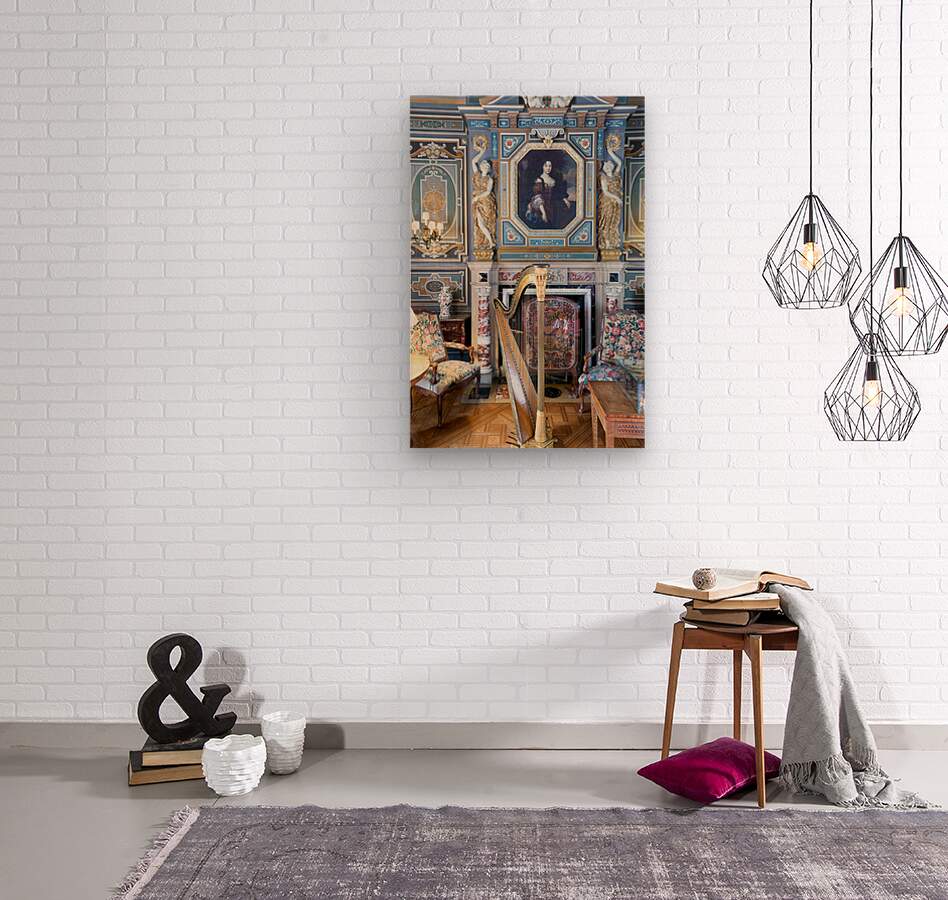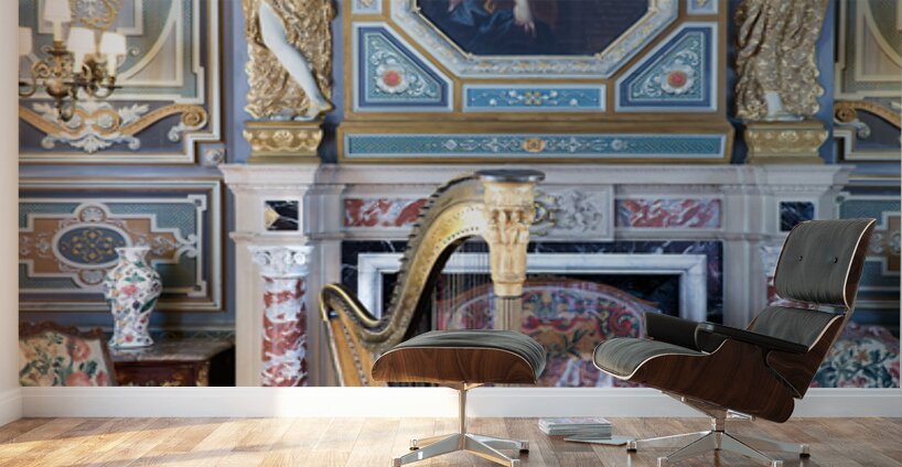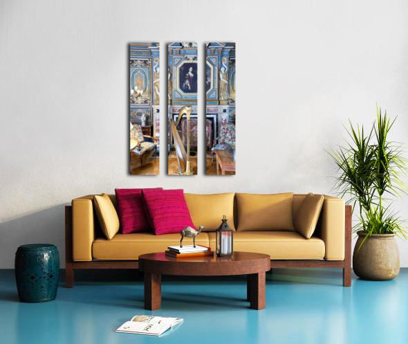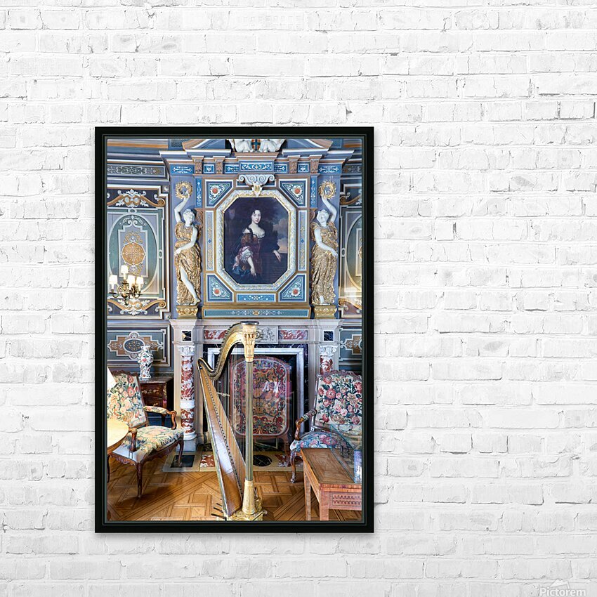 "Harp and elegant decor in the Chateau de Cheverny France" in a framed print.