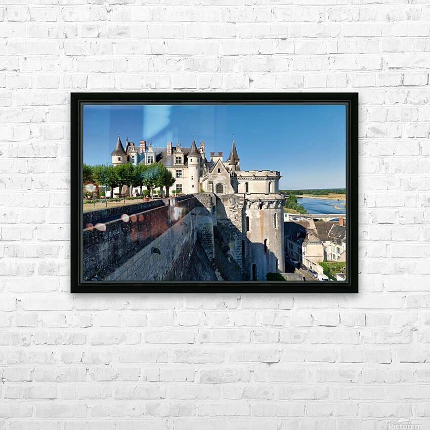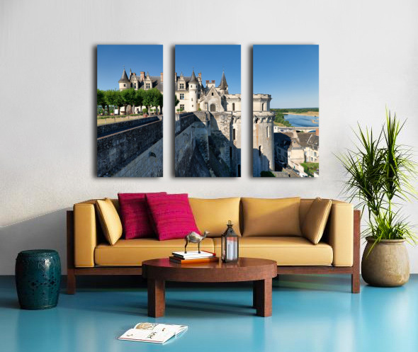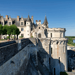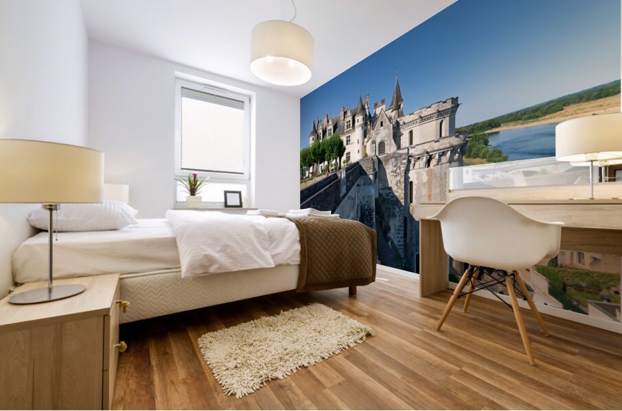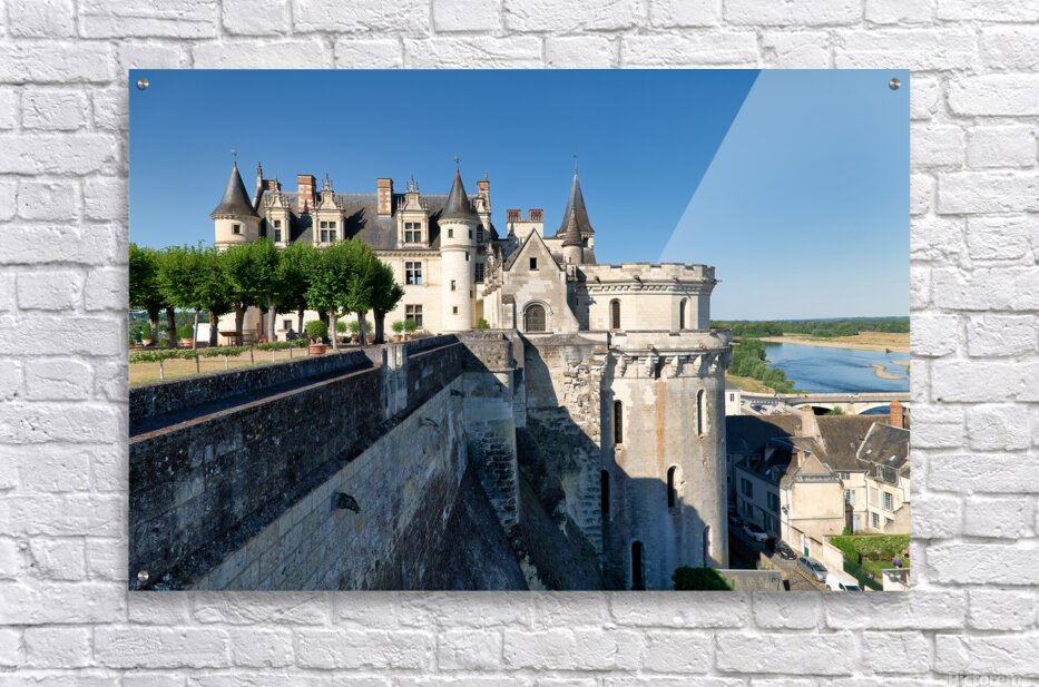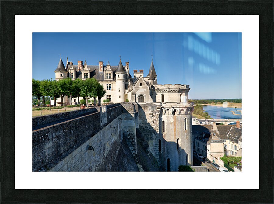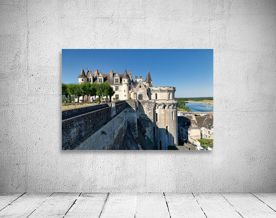 Chateau dAmboise is located in France near the Loire River. The castle is surrounded by trees. The sky is clear and bright.