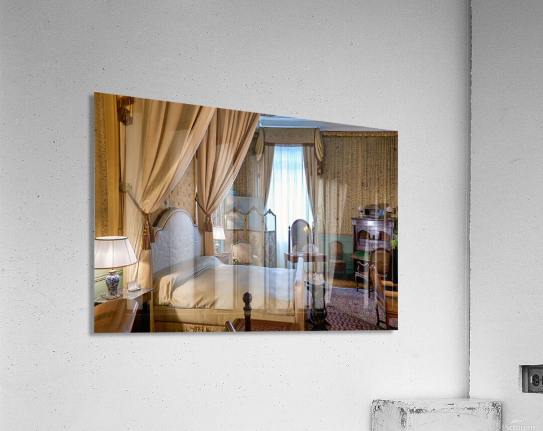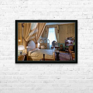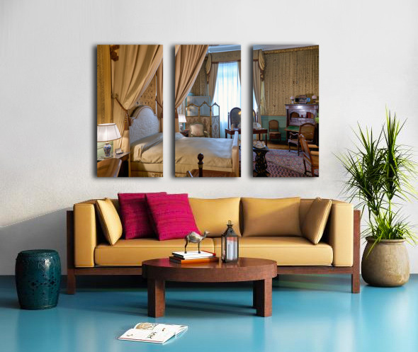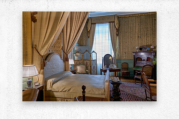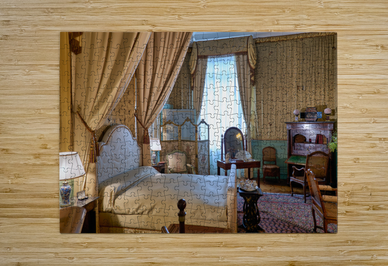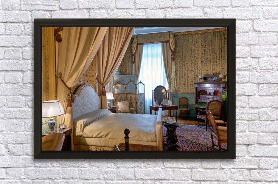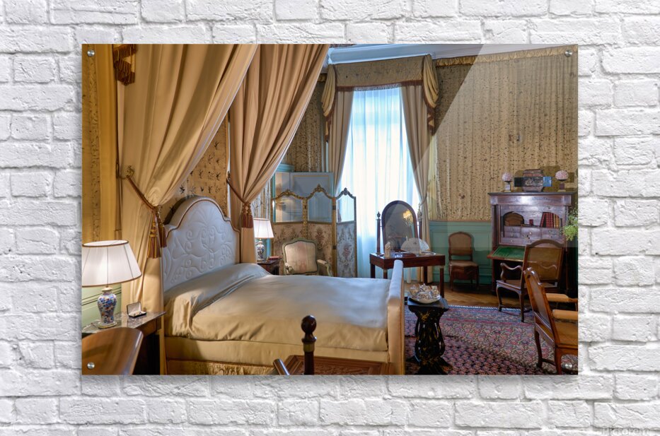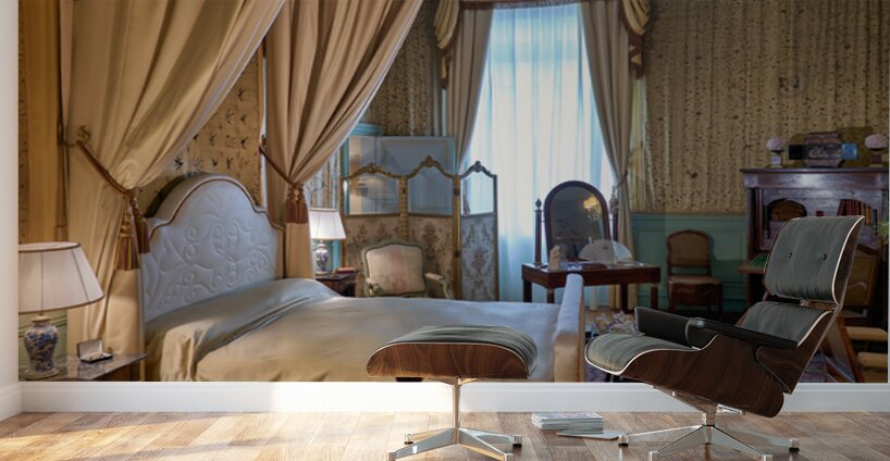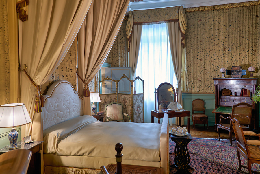 The bedroom in Cheverny Chateau shows a bed furniture mirrors and decor. Light comes through the window and brightens the room.