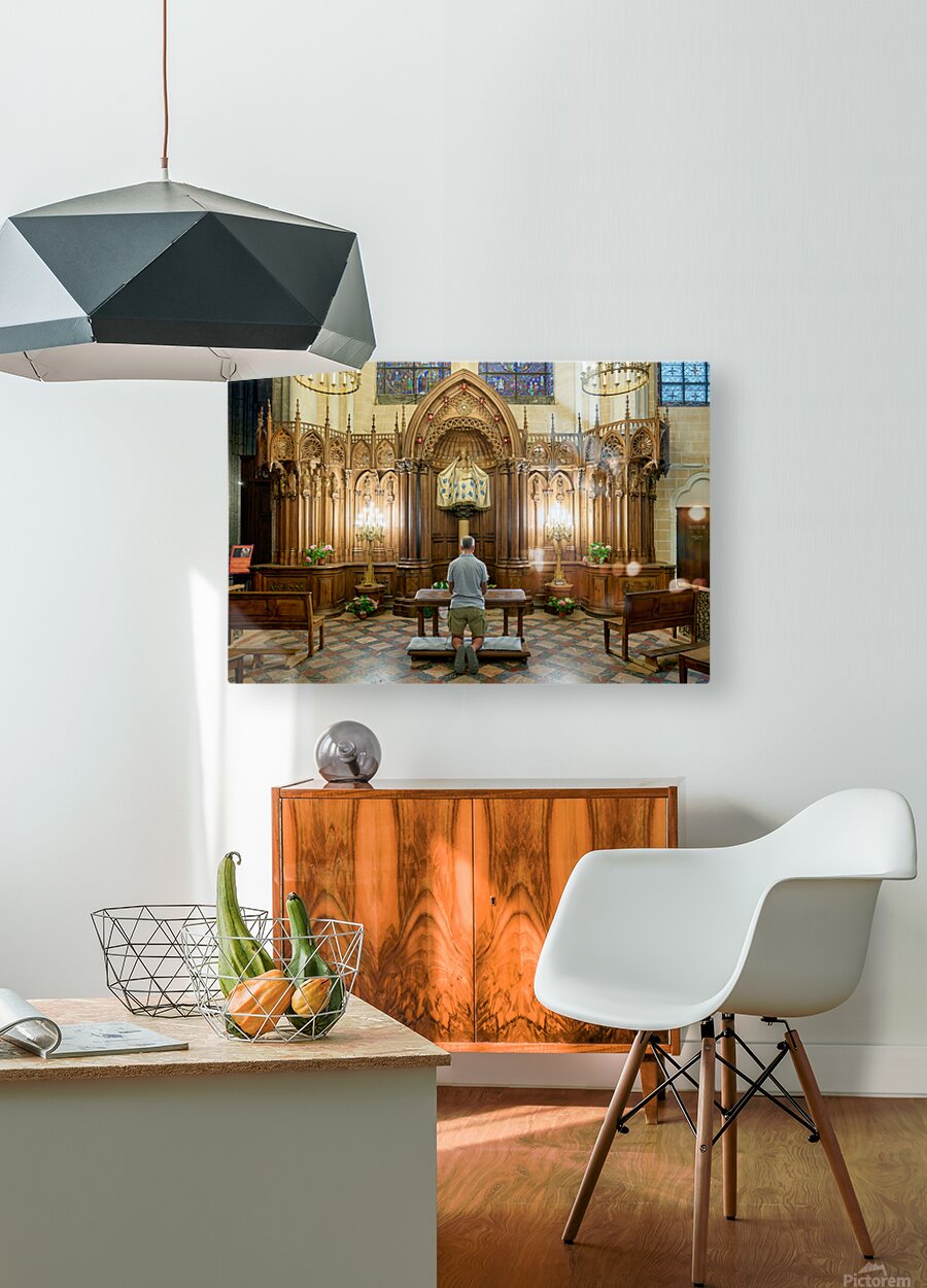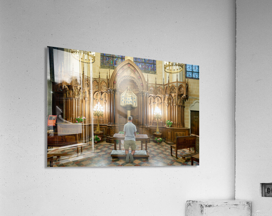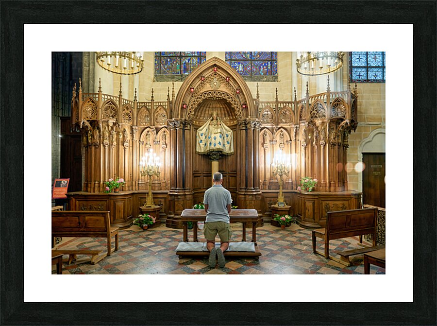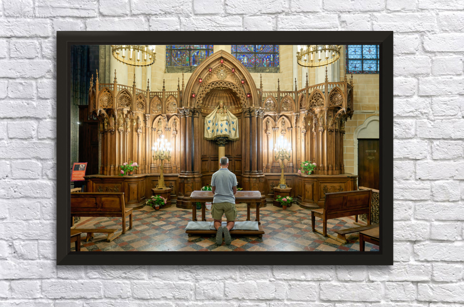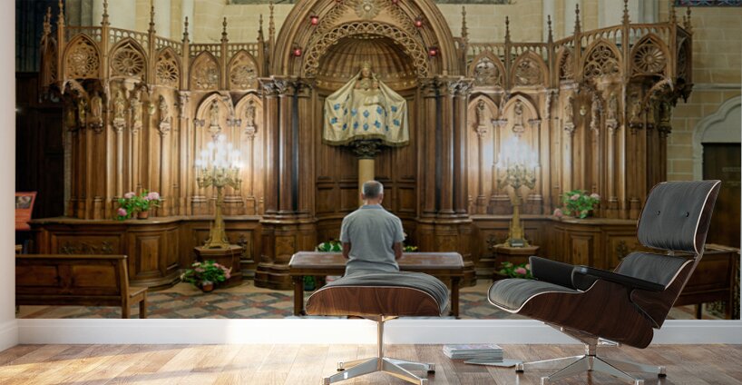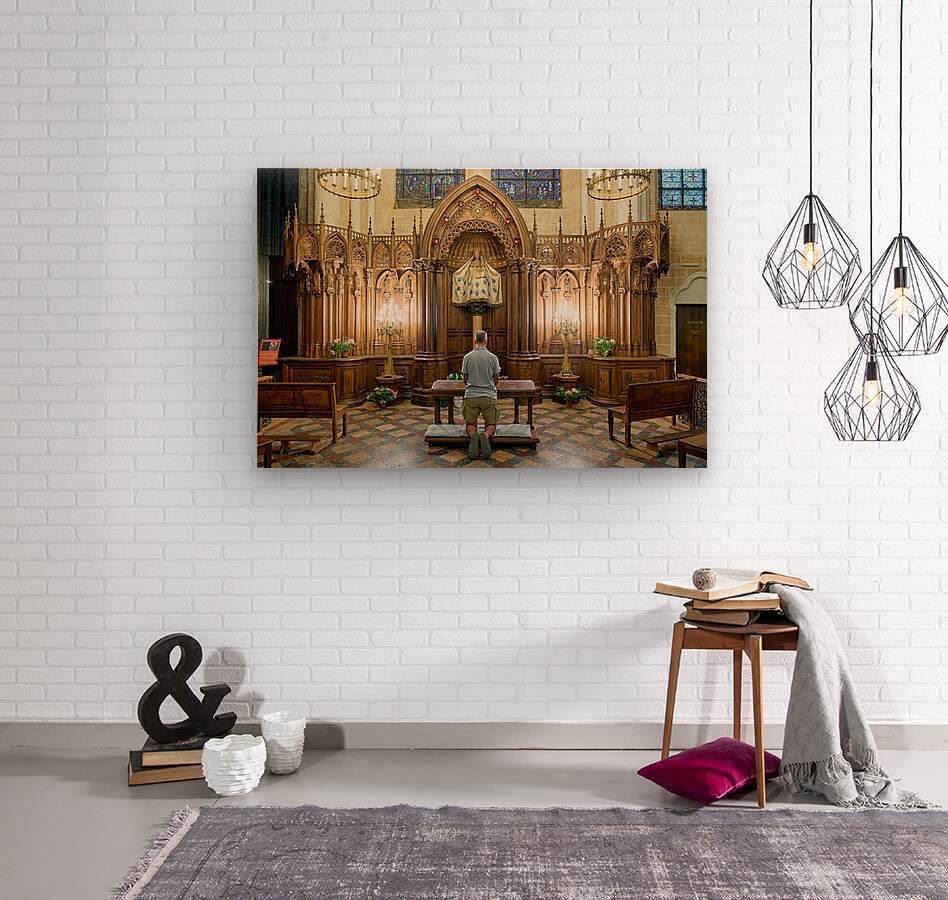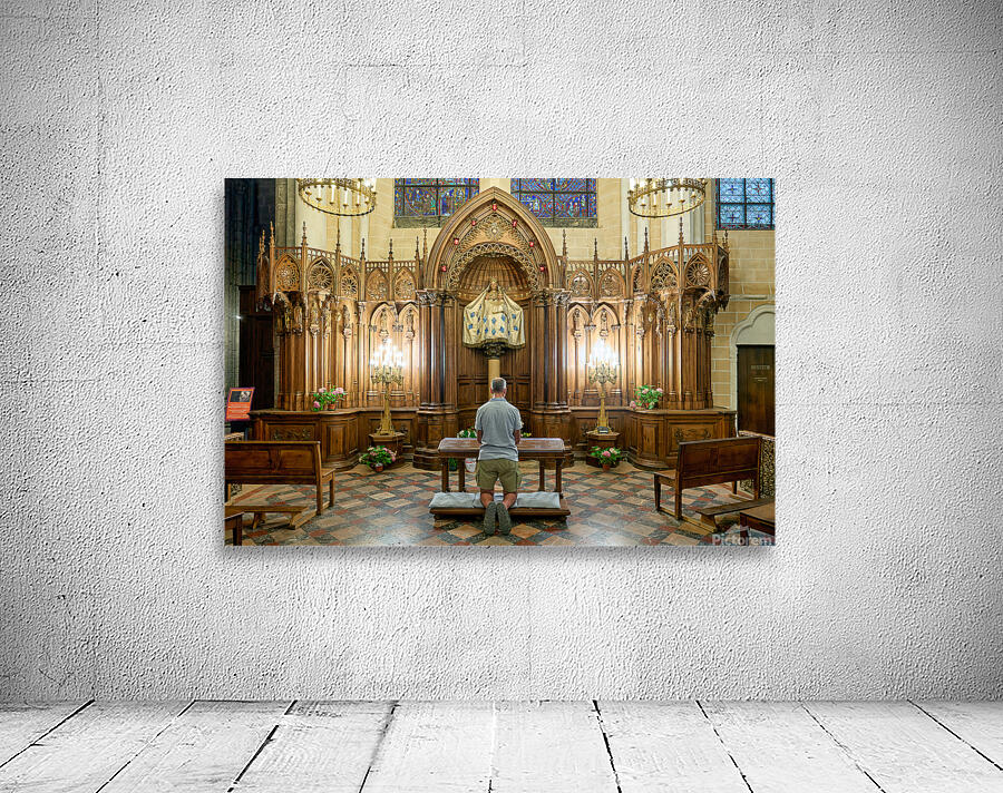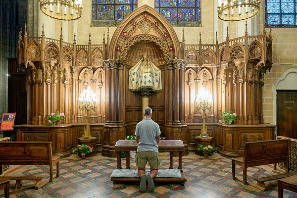 A person is kneeling and praying in a chapel of Chartres Cathedral in France. The woodwork and light create a warm atmosphere.