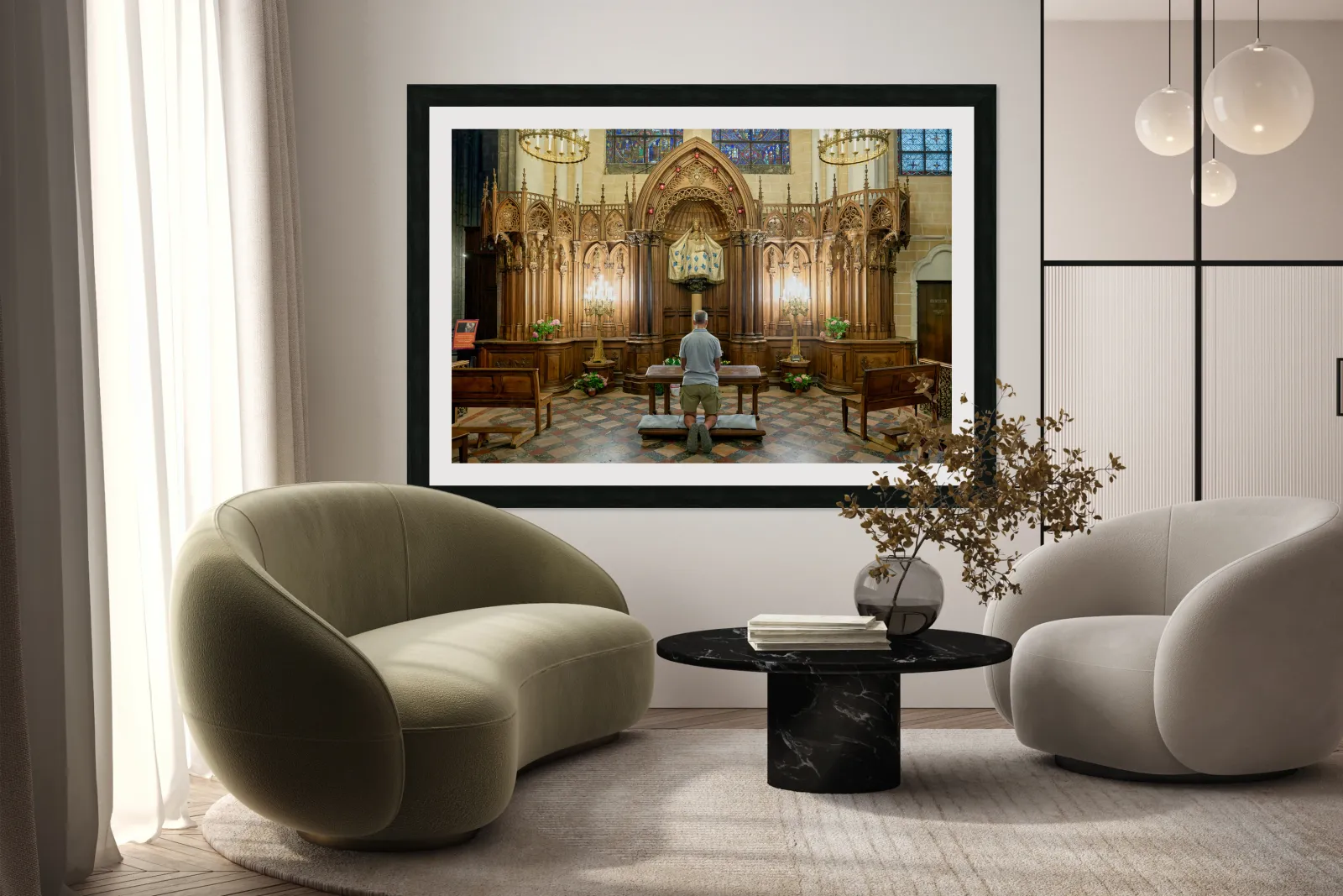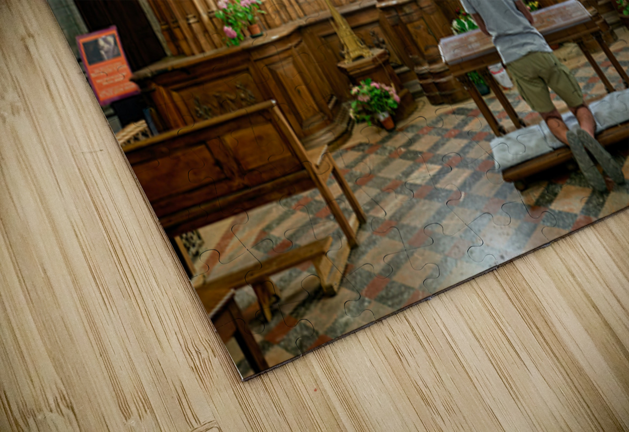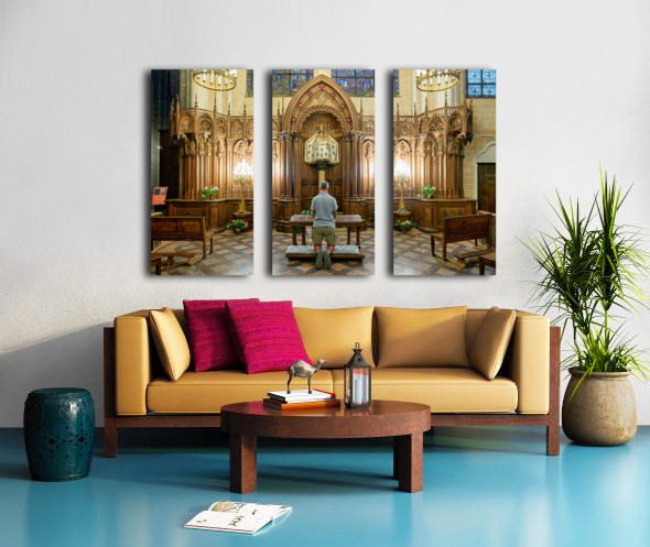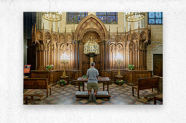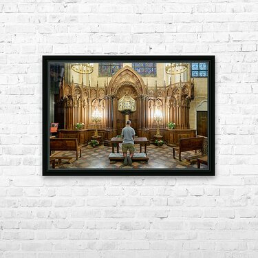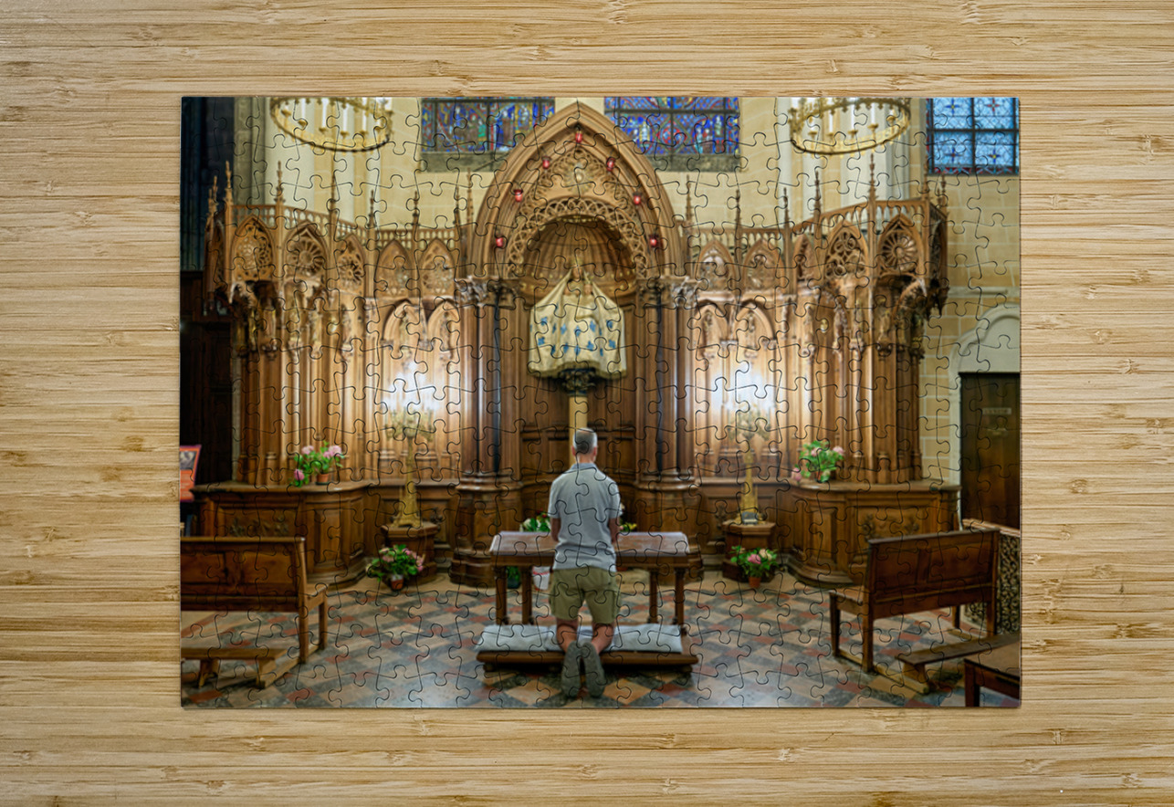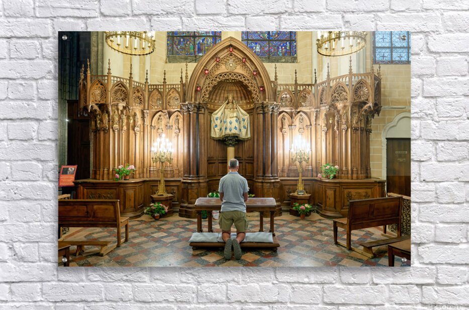 A person is kneeling and praying in a chapel of Chartres Cathedral in France. The woodwork and light create a warm atmosphere.
