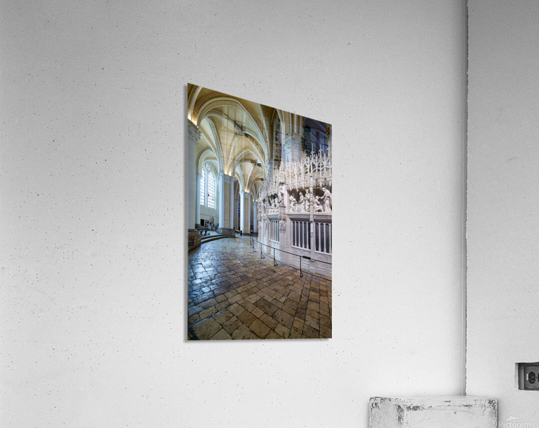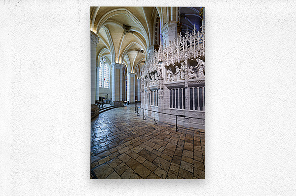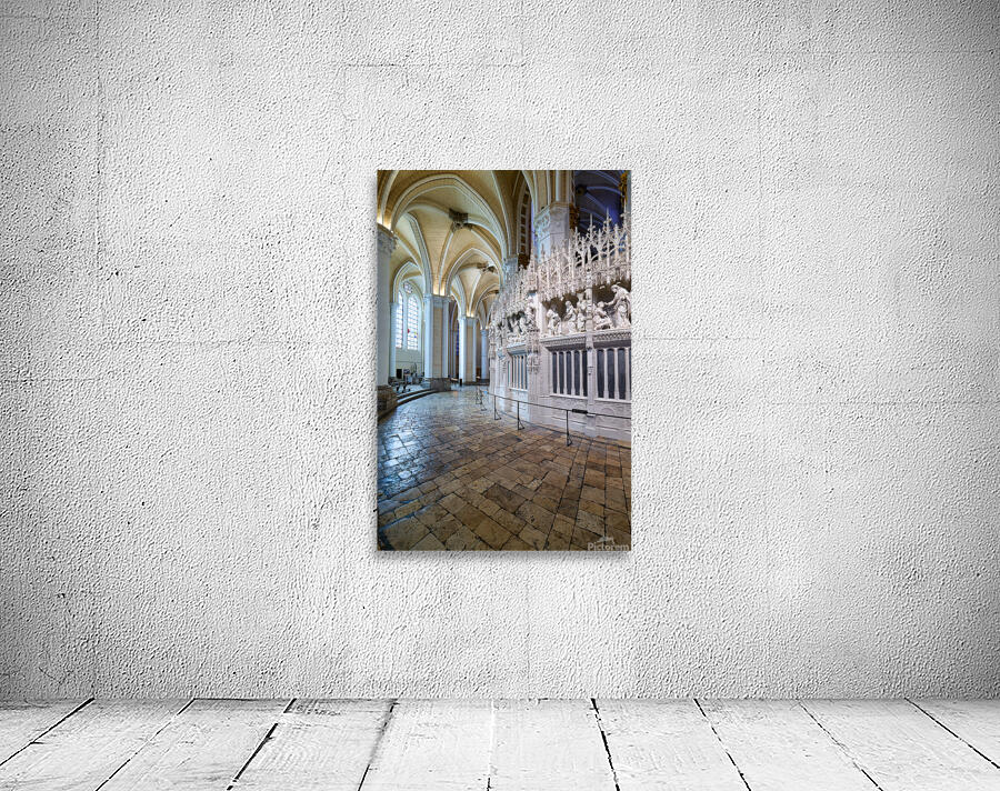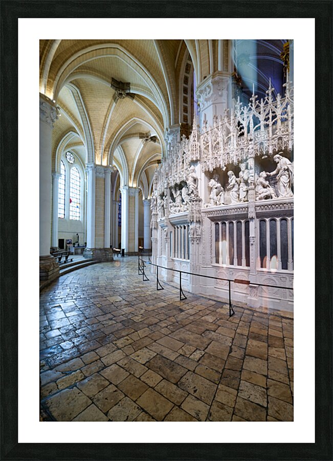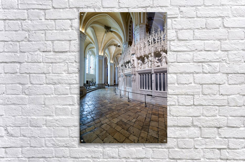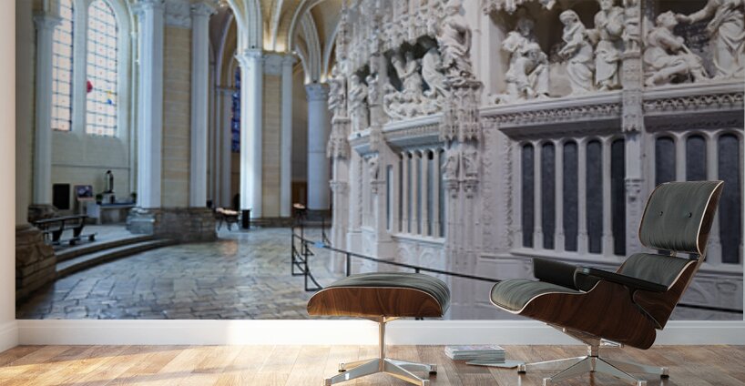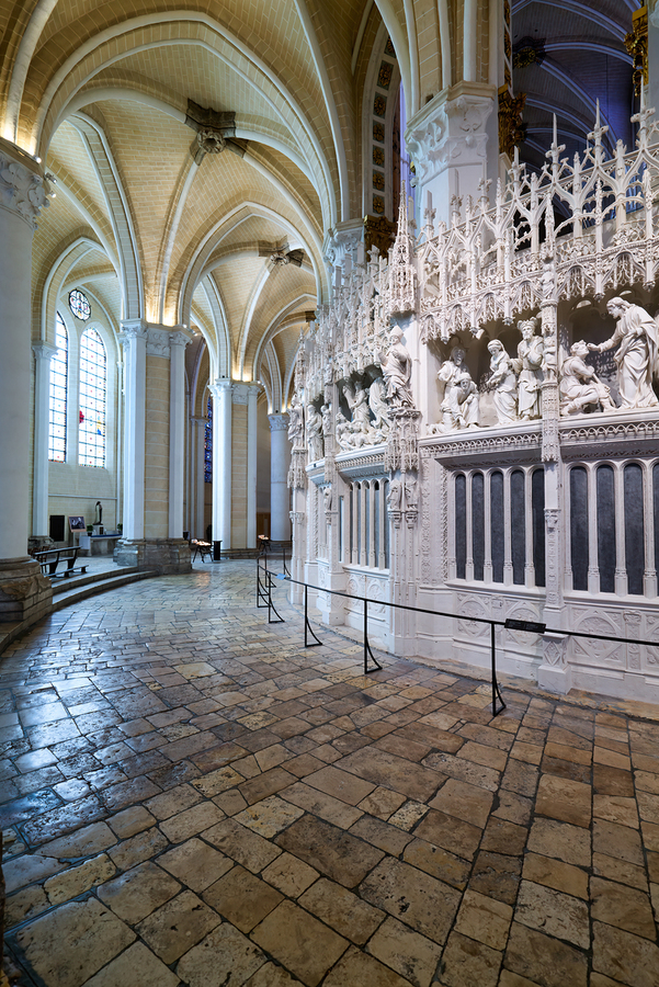 Inside Chartres Cathedral people visit and admire the tall arches and stone floor while taking in the artwork and carvings around them.
