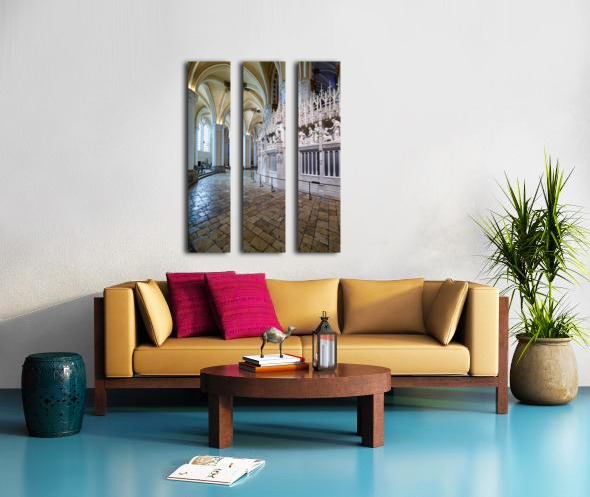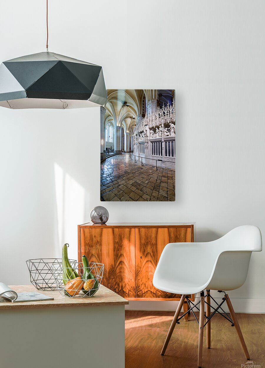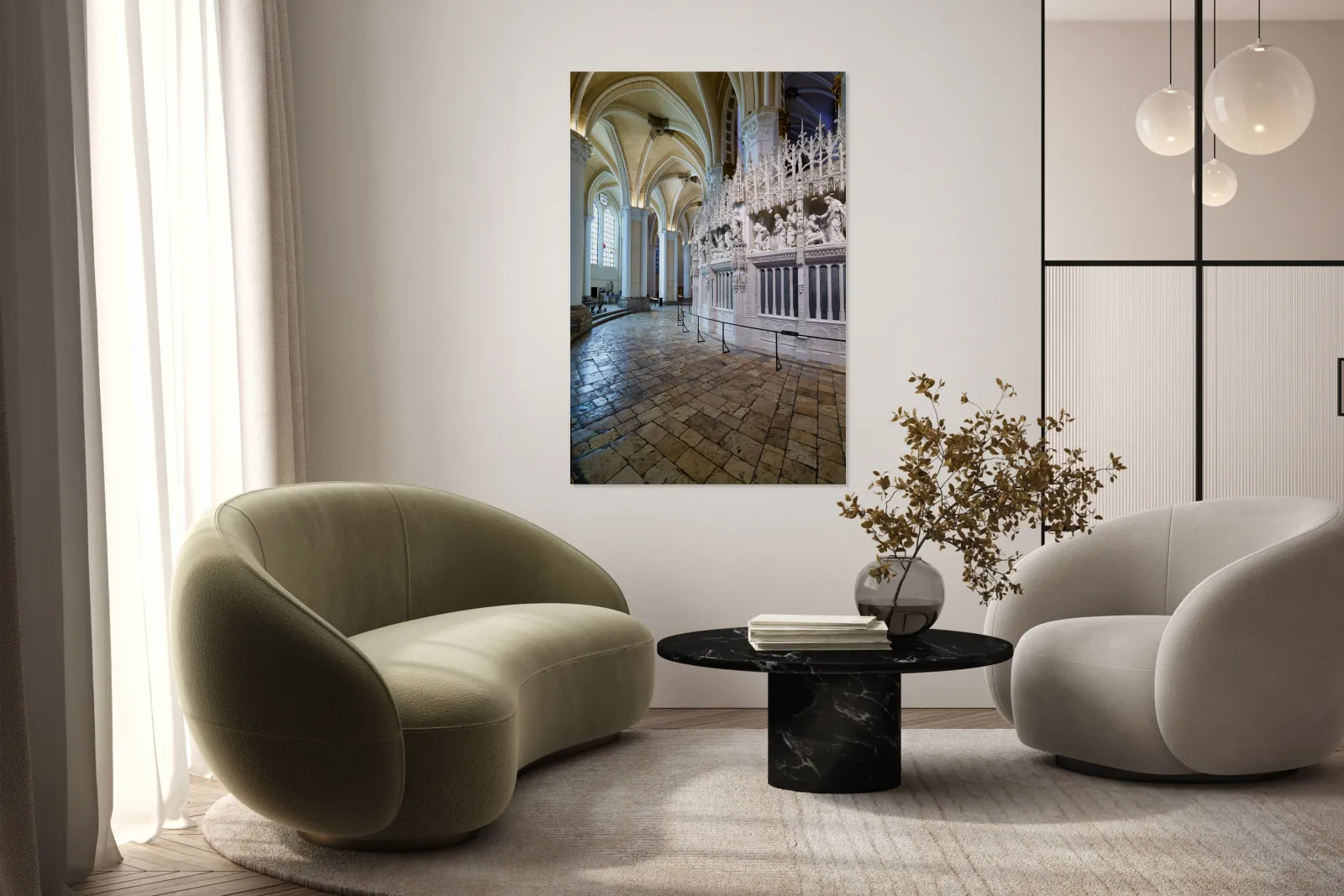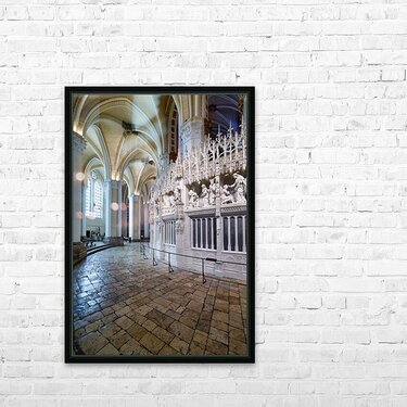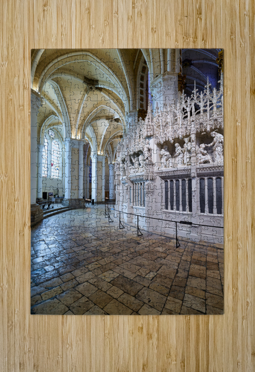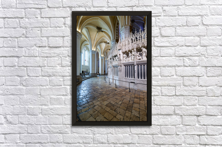 Inside Chartres Cathedral people visit and admire the tall arches and stone floor while taking in the artwork and carvings around them.