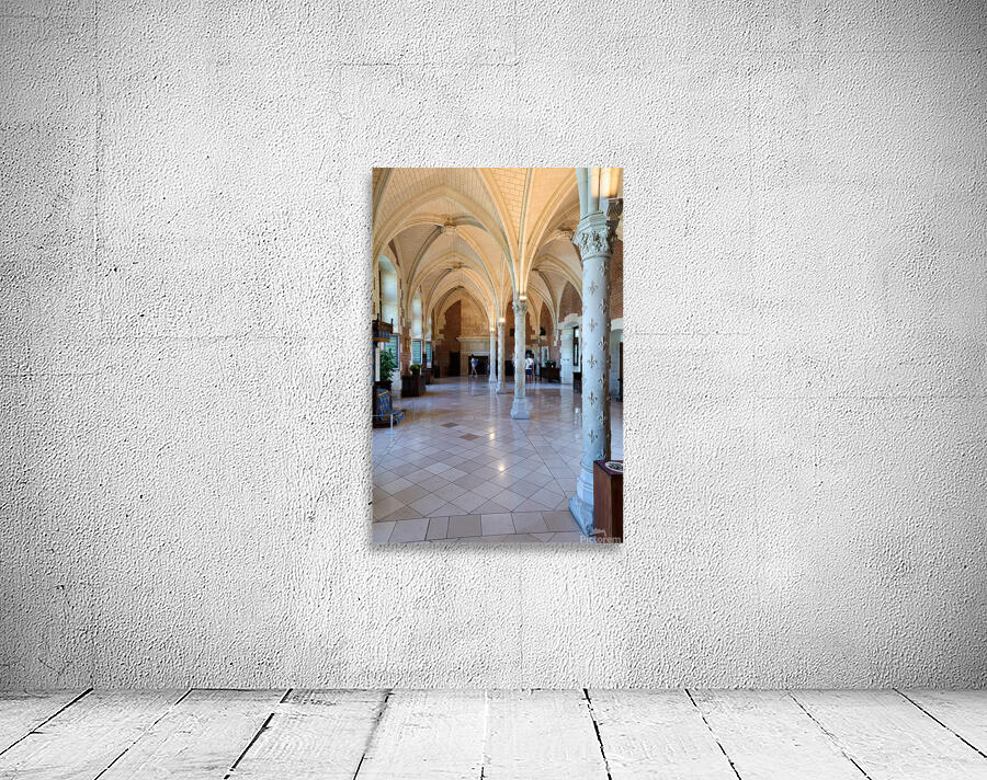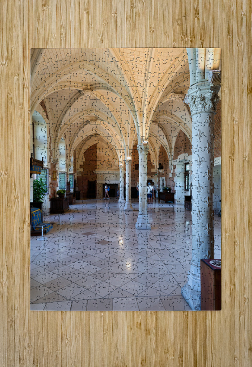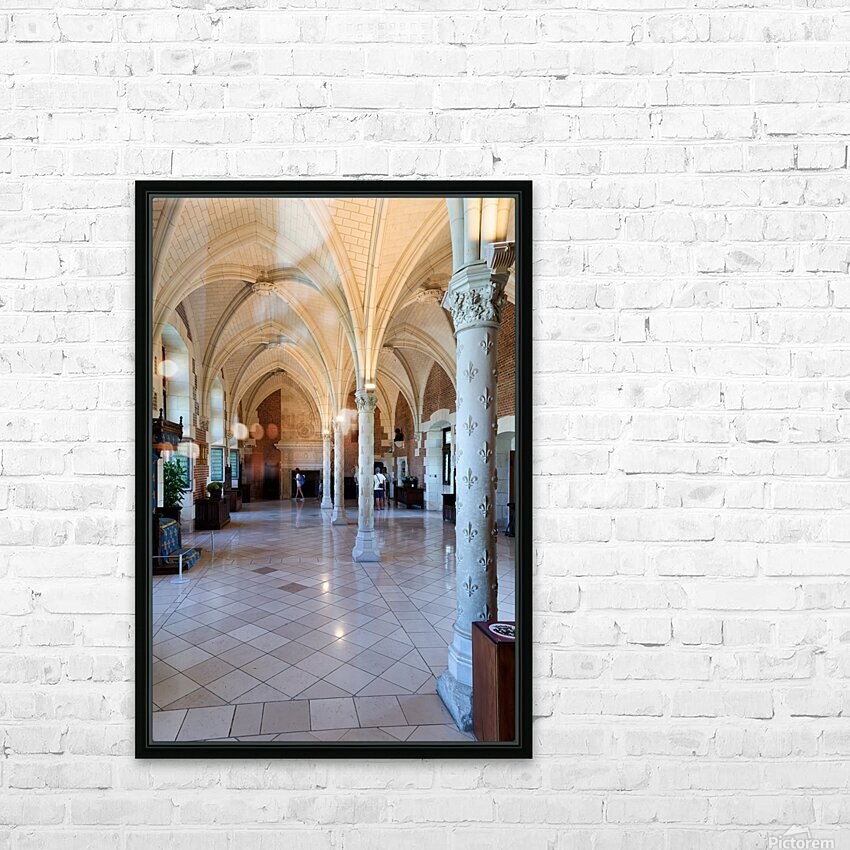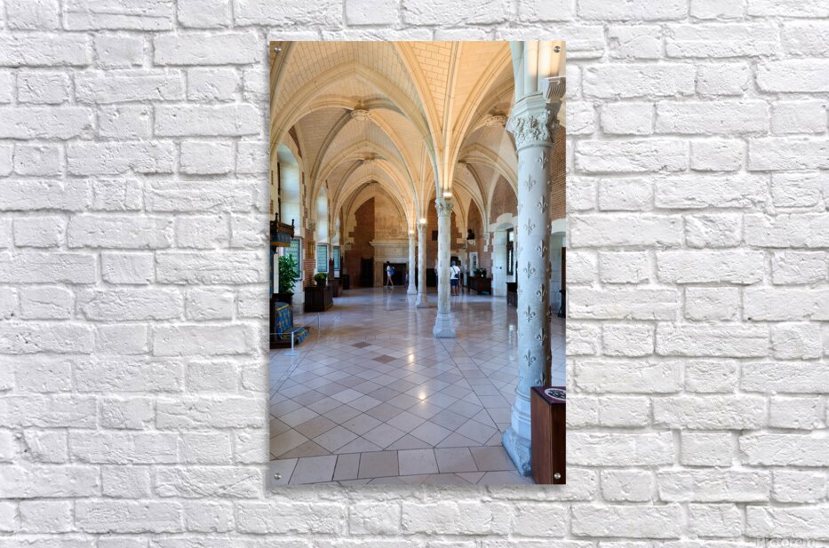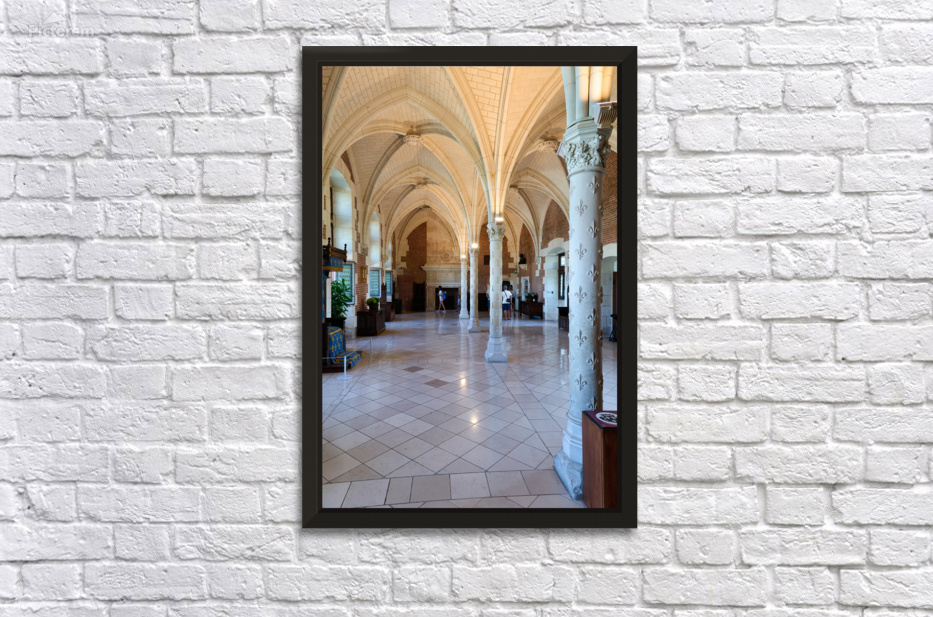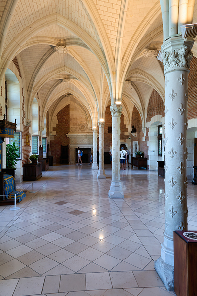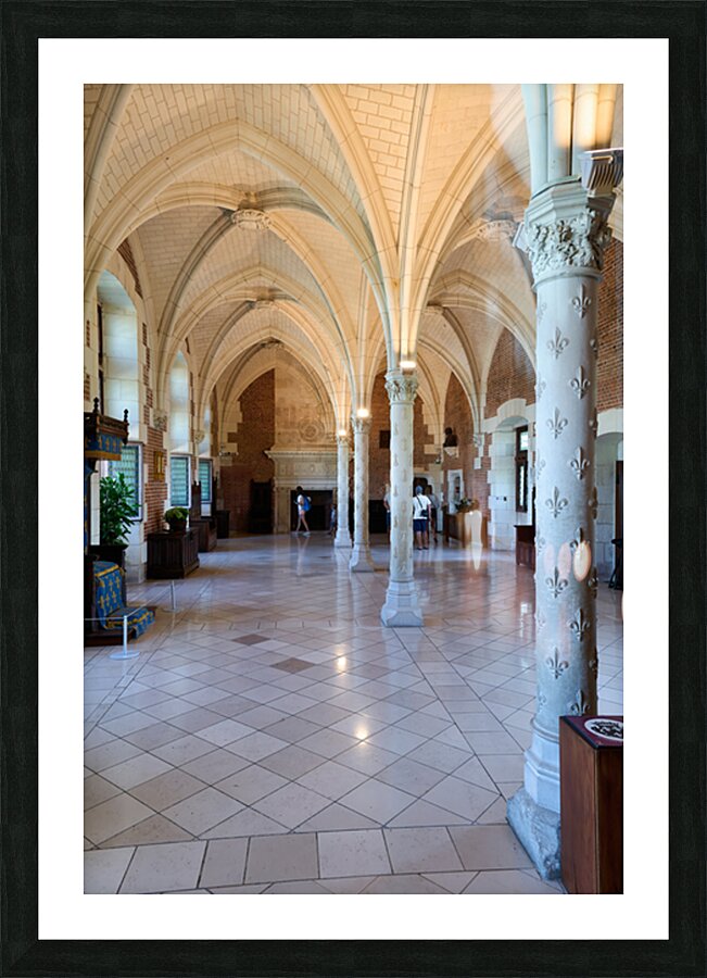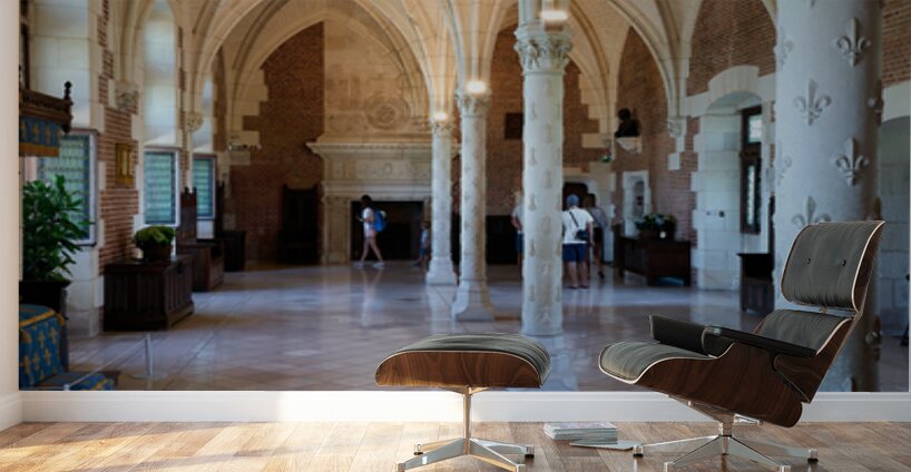 Visitors walk through the historic interior of Chateau dAmboise in France while observing its architecture and design details.
