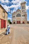 A nun walks by Vezelay Abbey in Bourgogne France. The sun is shining and the streets are quiet as she goes about her day.