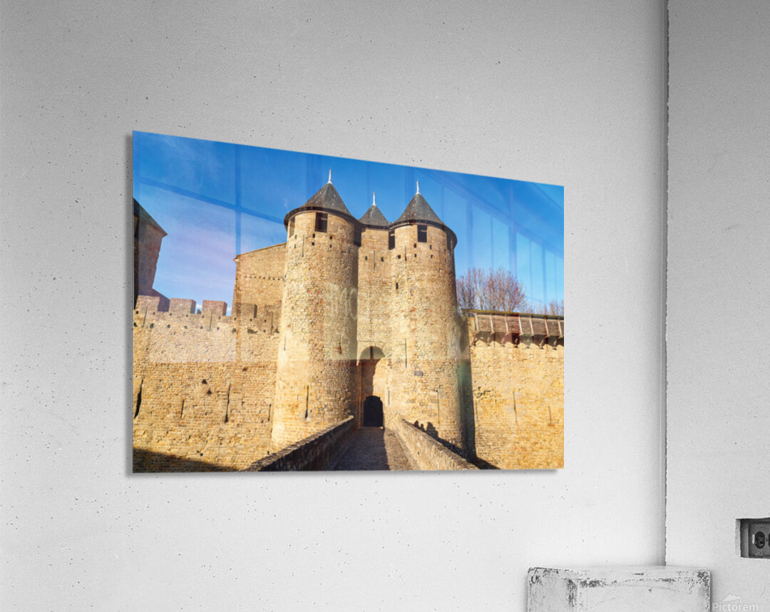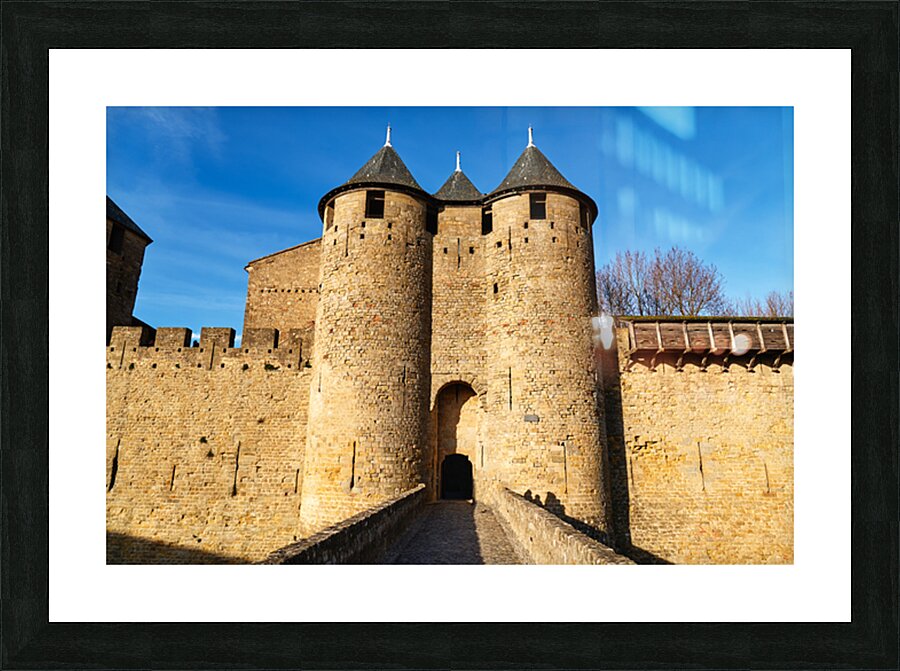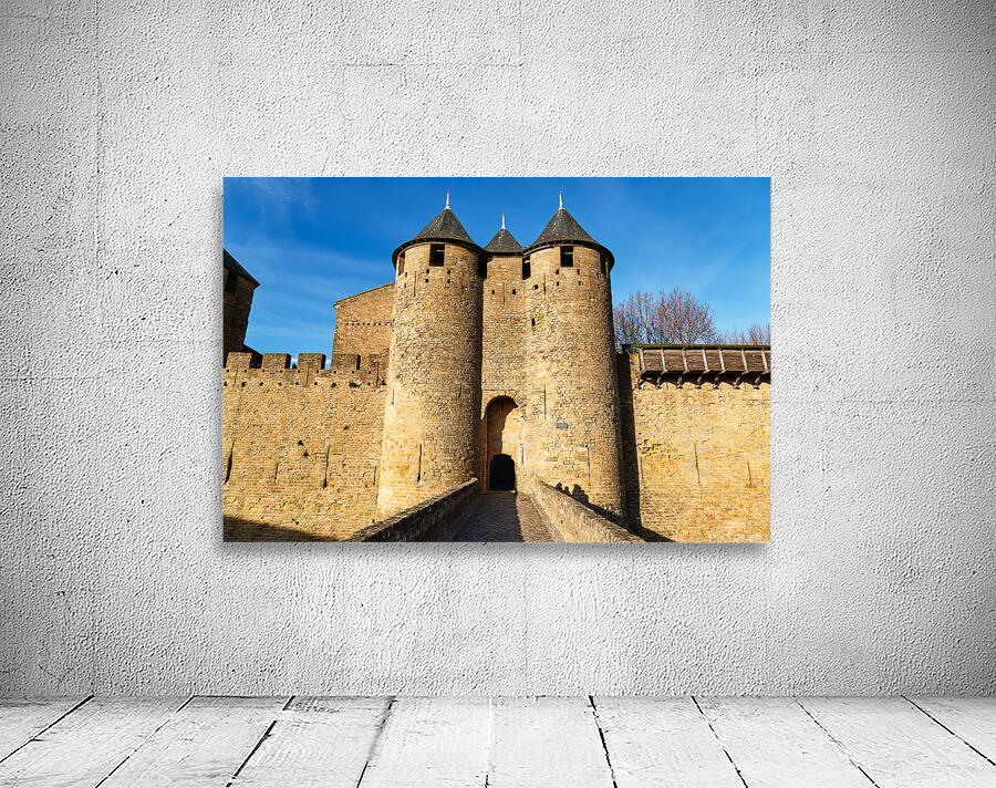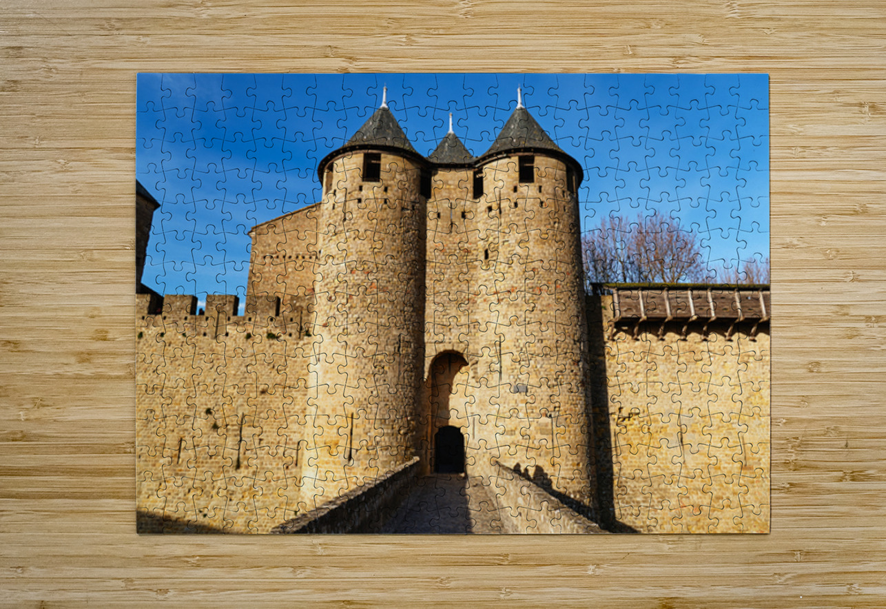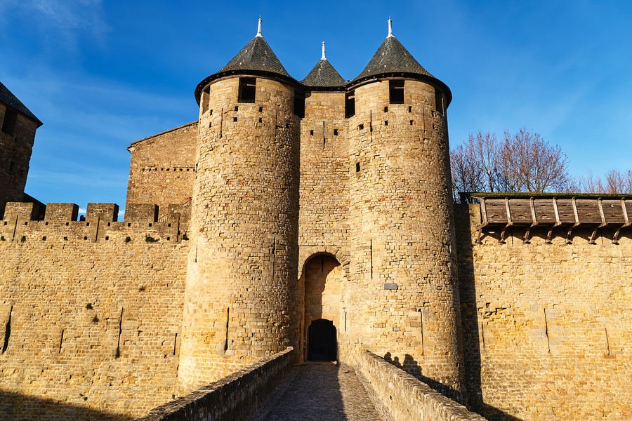 Visitors walk across the bridge toward the large stone towers of Carcassonne castle under a clear blue sky.