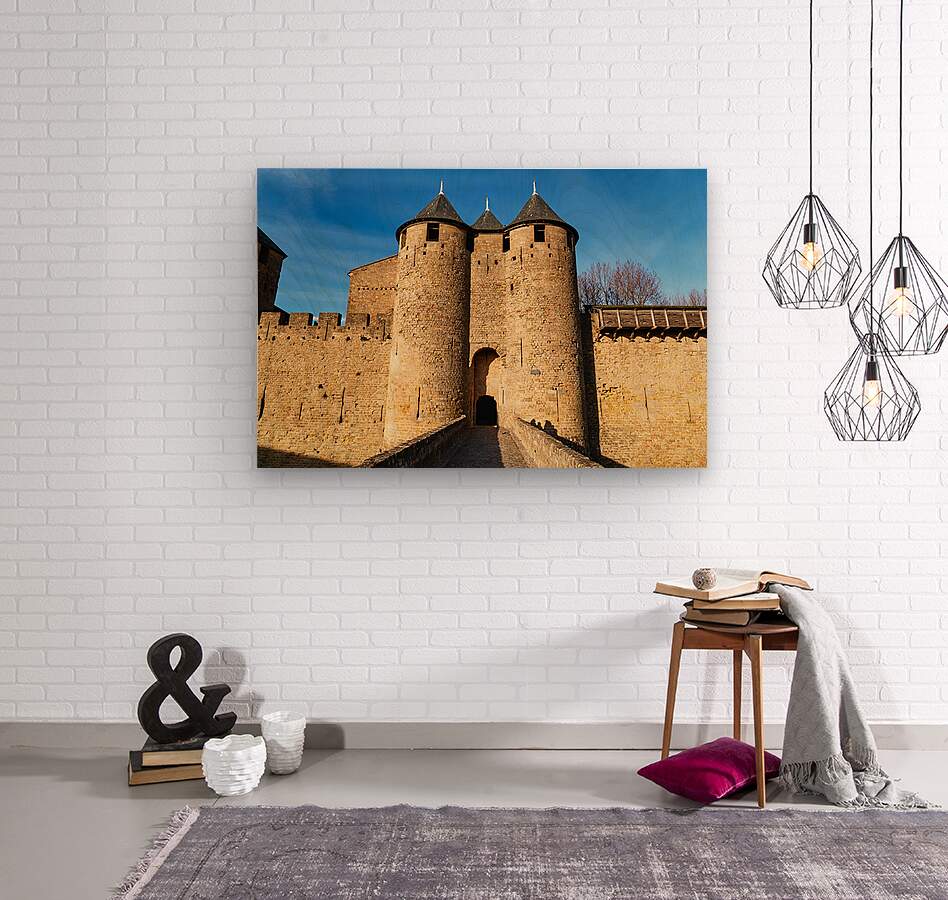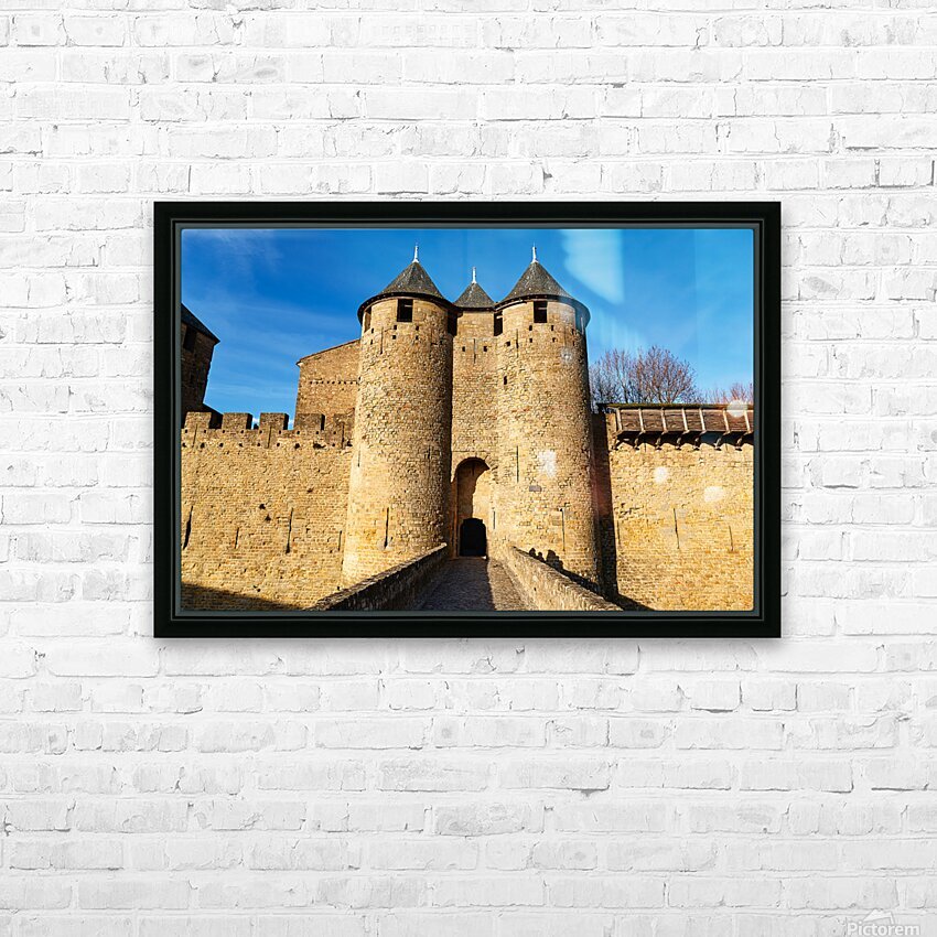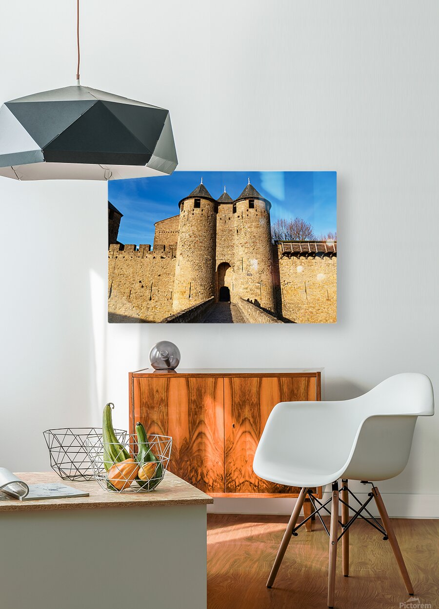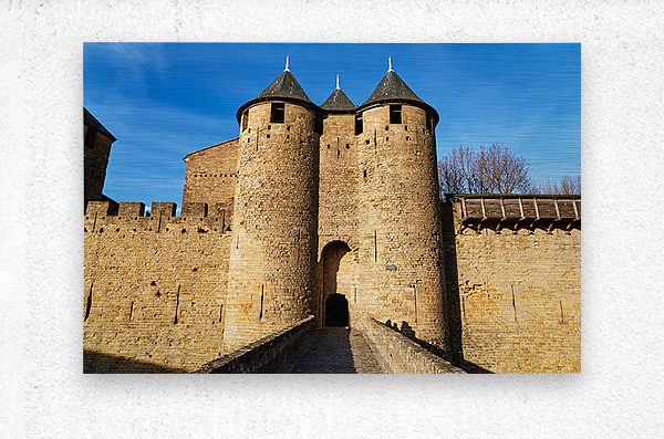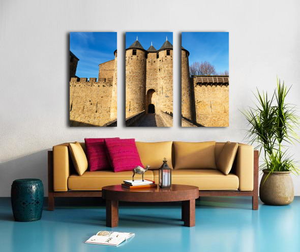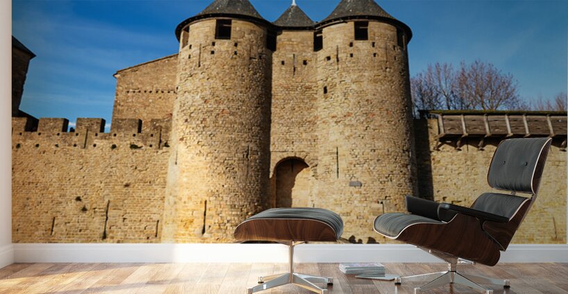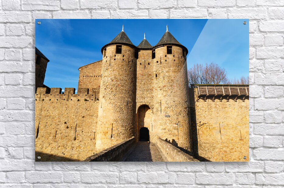 Visitors walk across the bridge toward the large stone towers of Carcassonne castle under a clear blue sky.