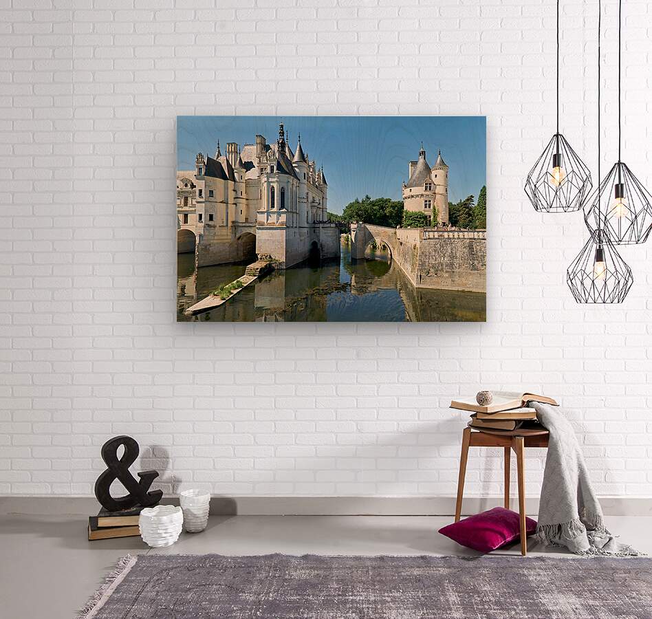 Tourists explore the historic Chenonceau Castle in France. The structure spans a river showcasing its unique architecture under a clear sky.