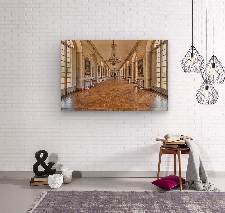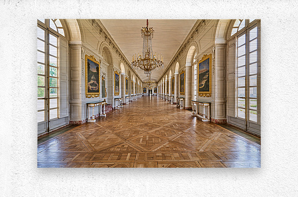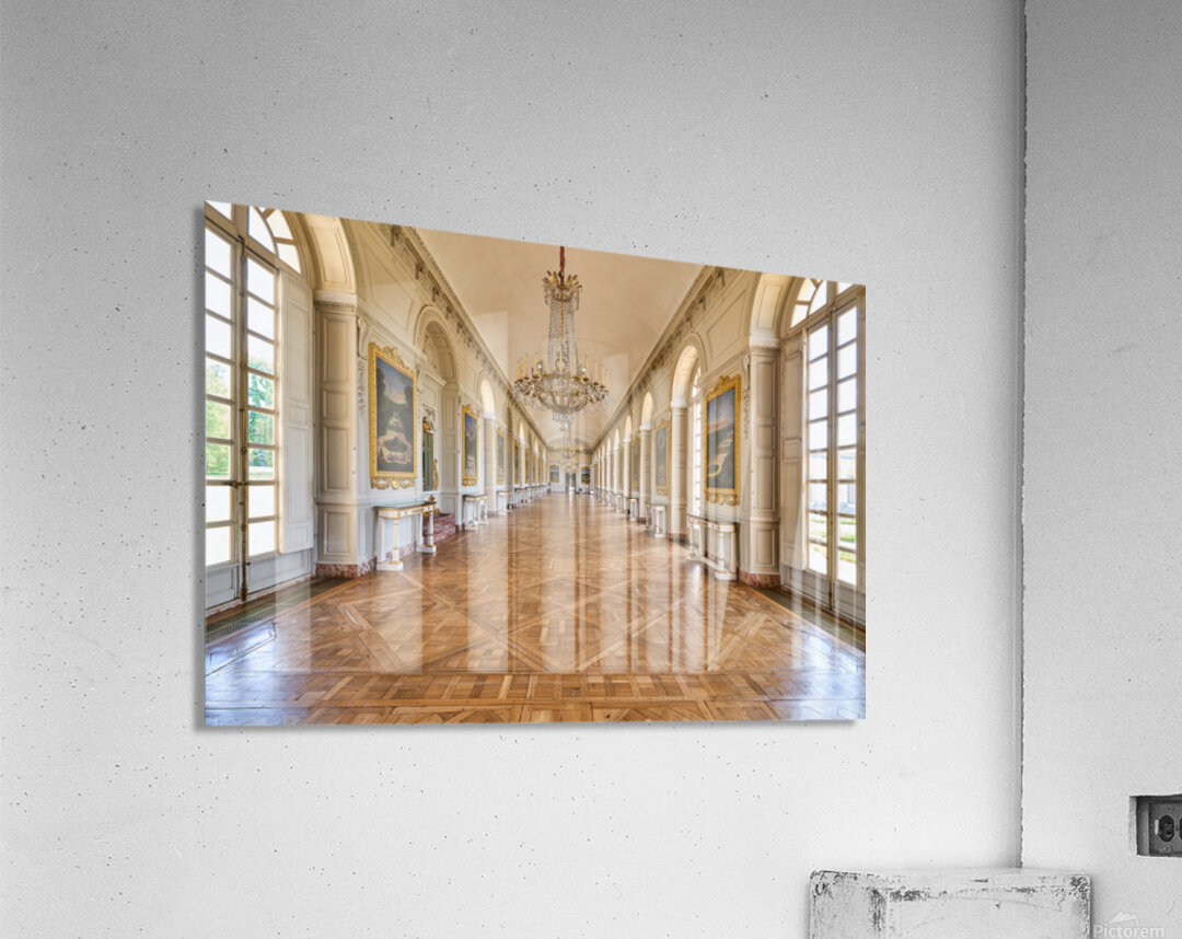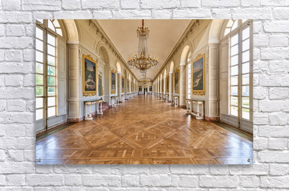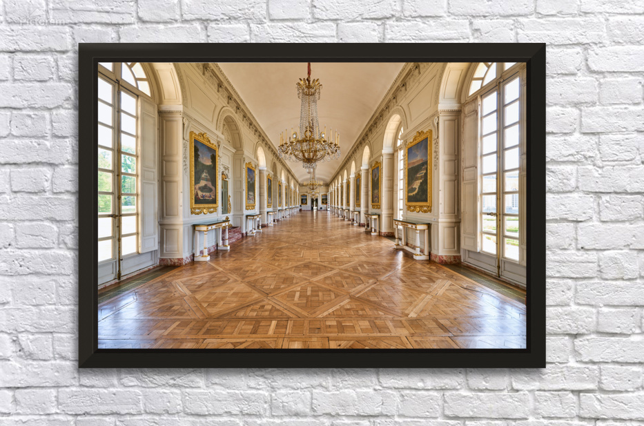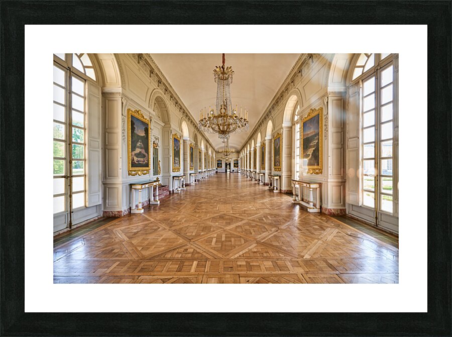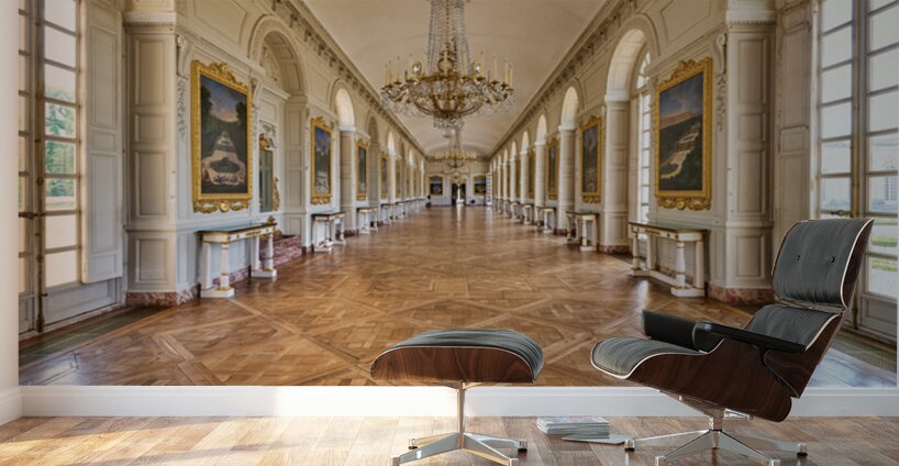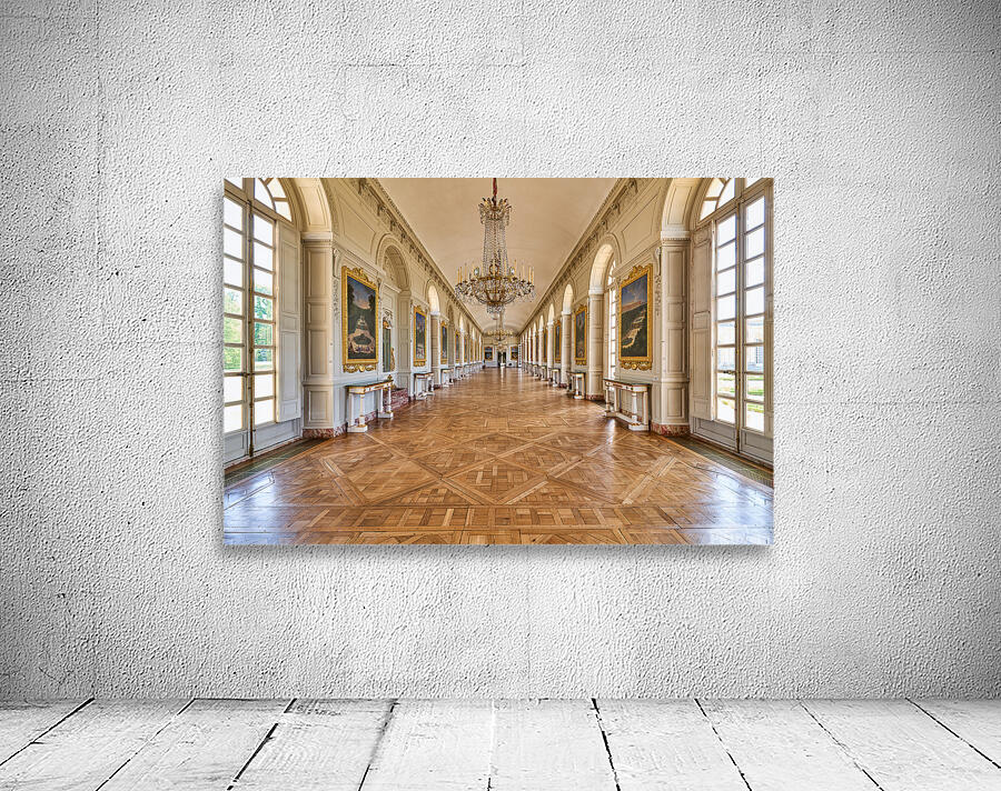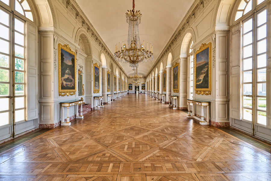 Visitors walk along the Grand Trianon hall in Versailles France. Sunlight shines through large windows highlighting the wooden floor.