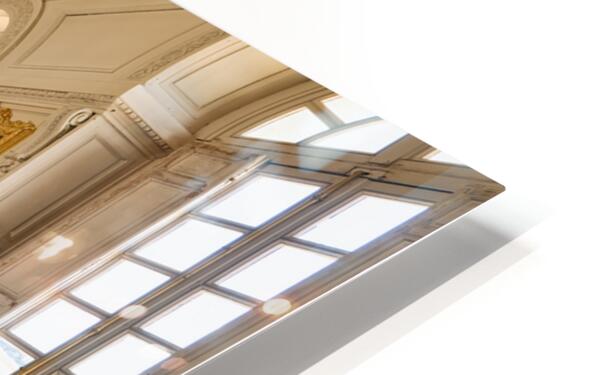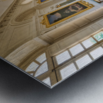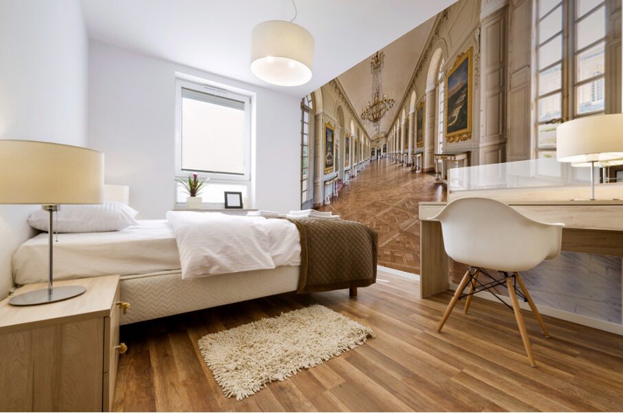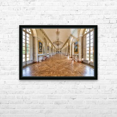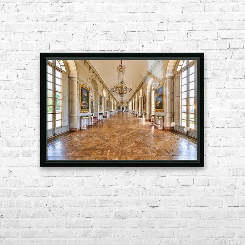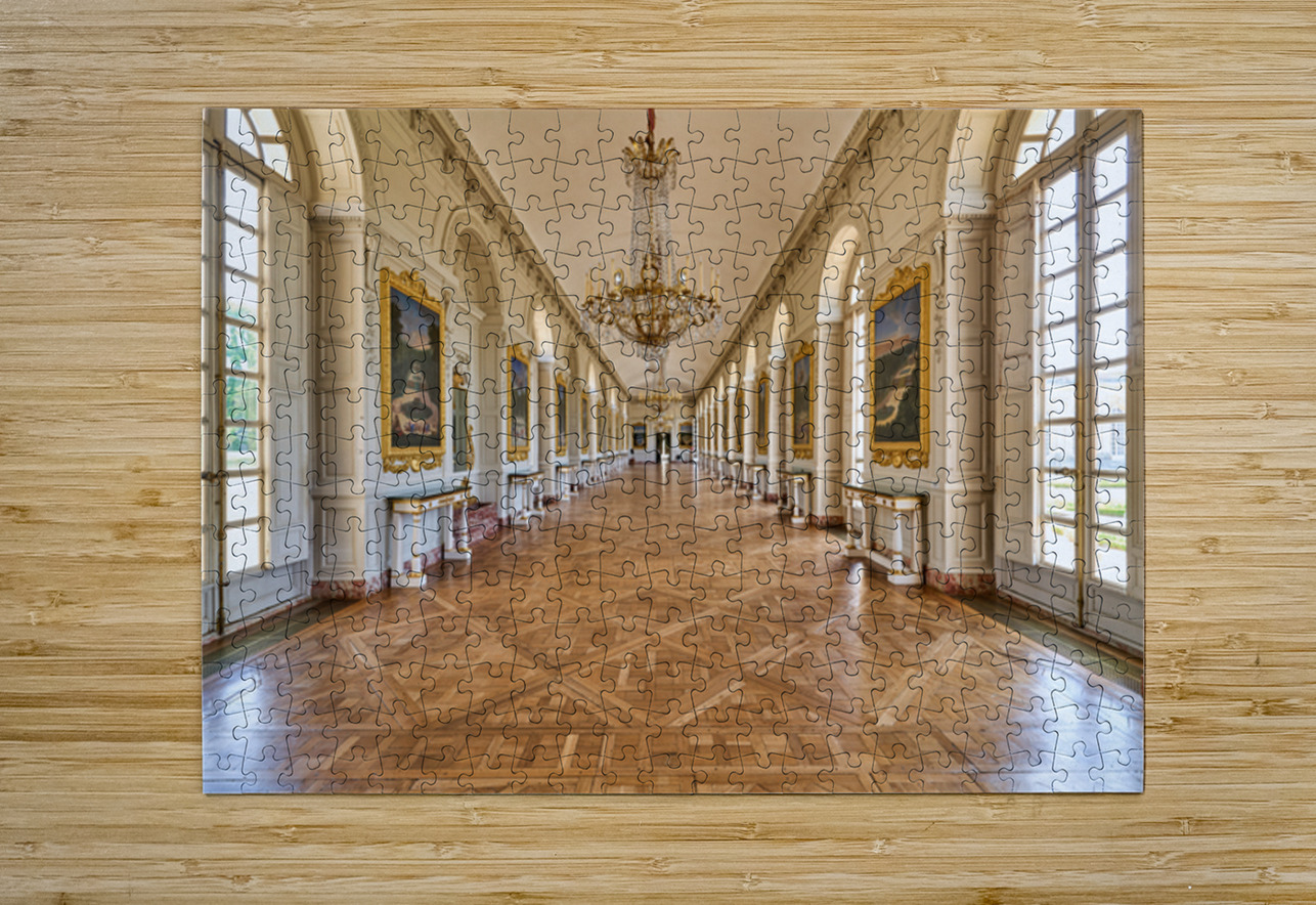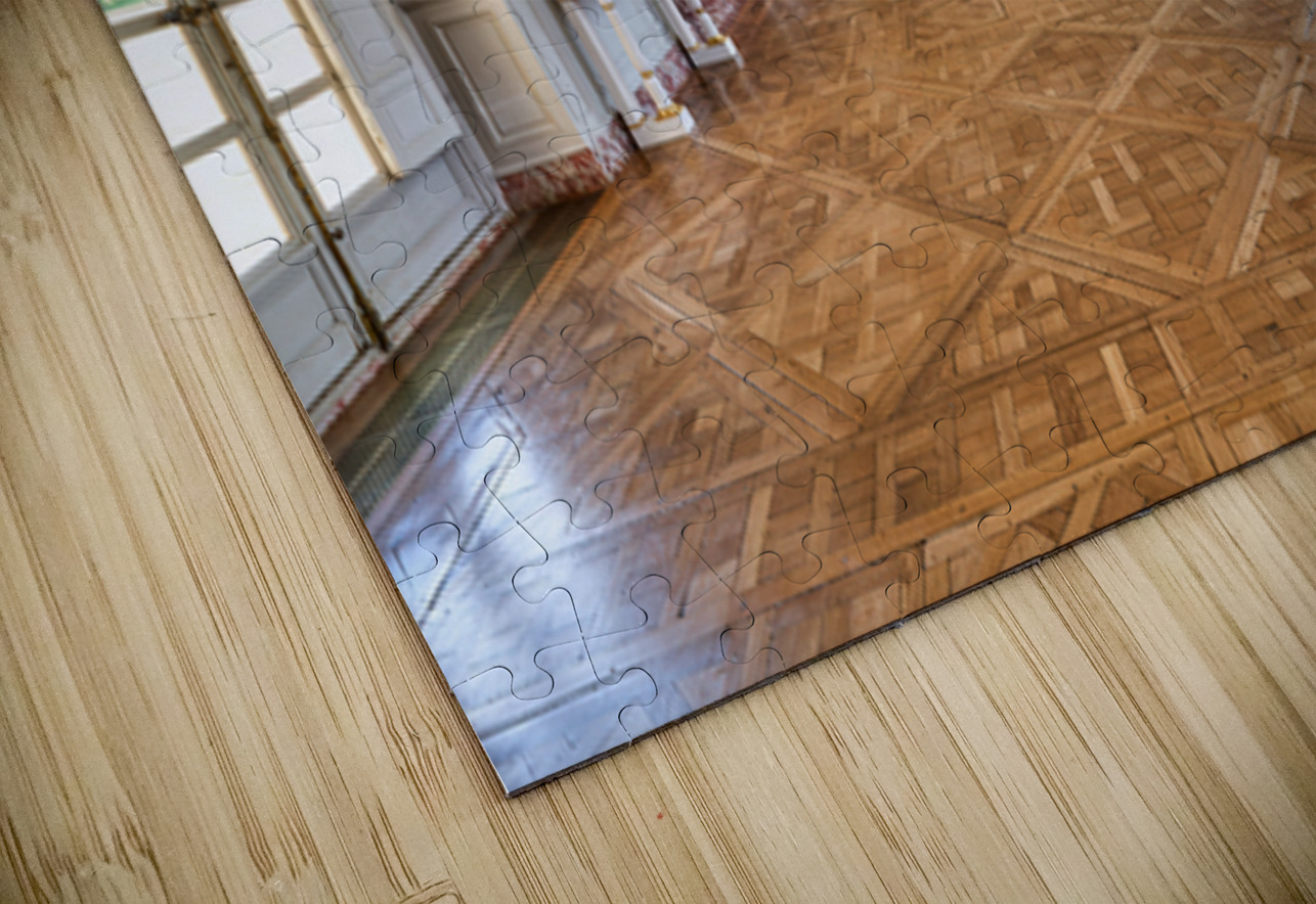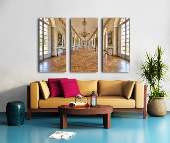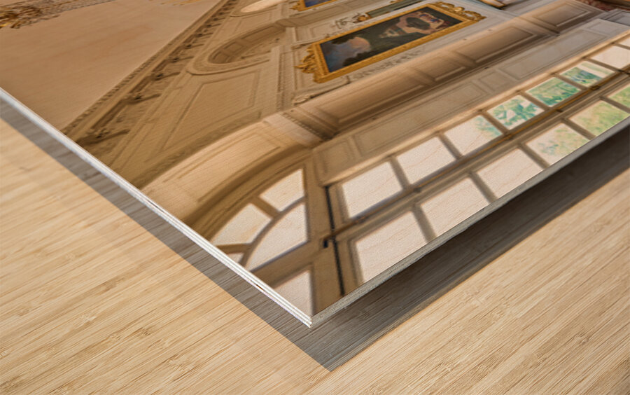 Visitors walk along the Grand Trianon hall in Versailles France. Sunlight shines through large windows highlighting the wooden floor.