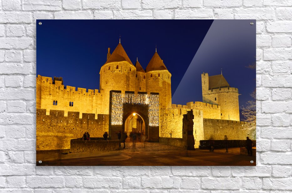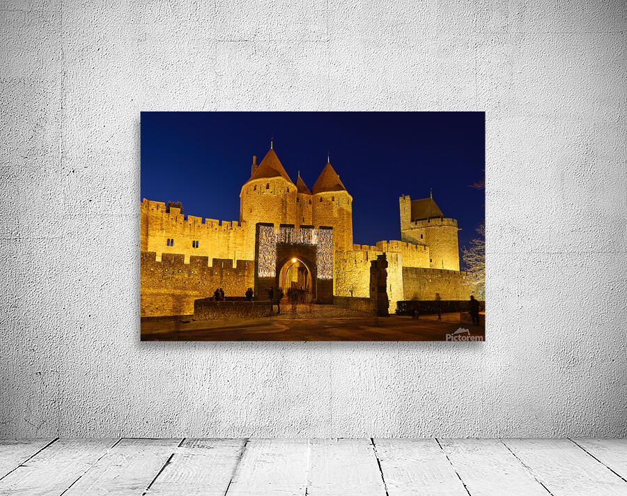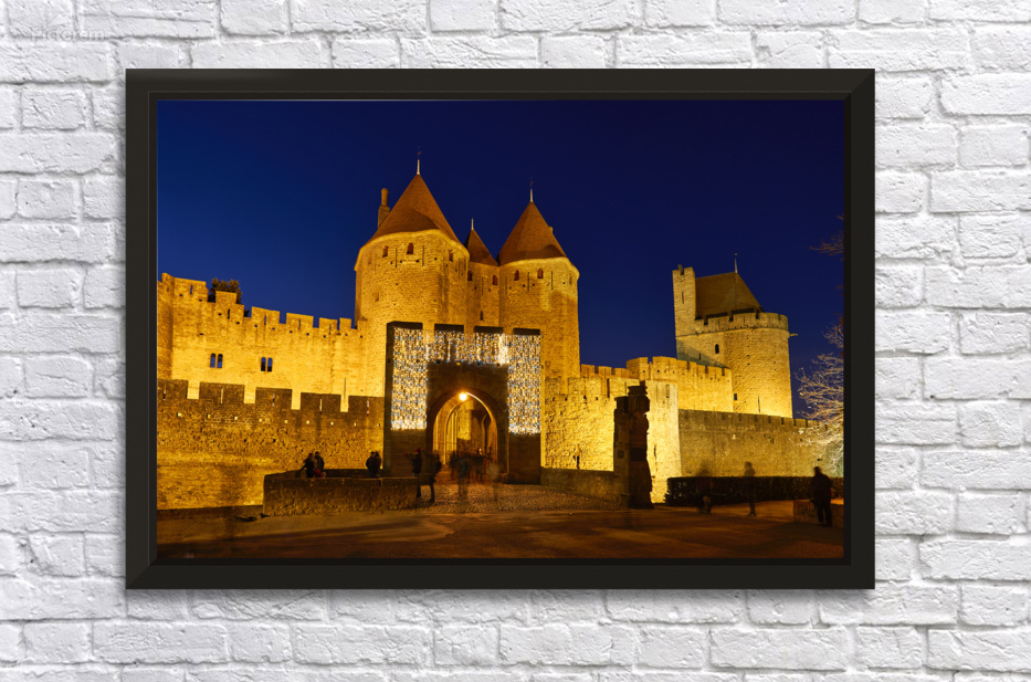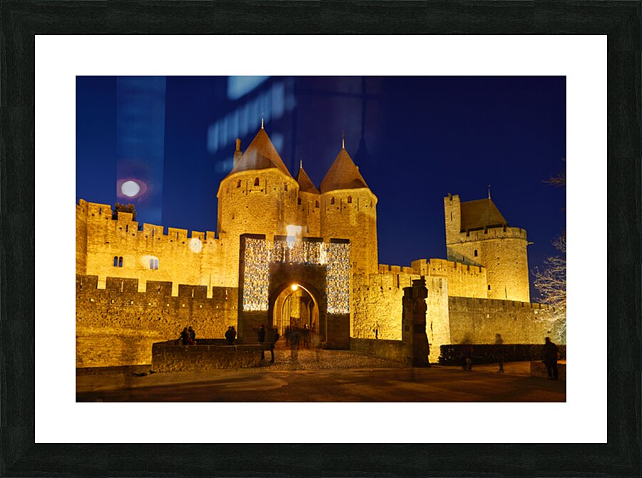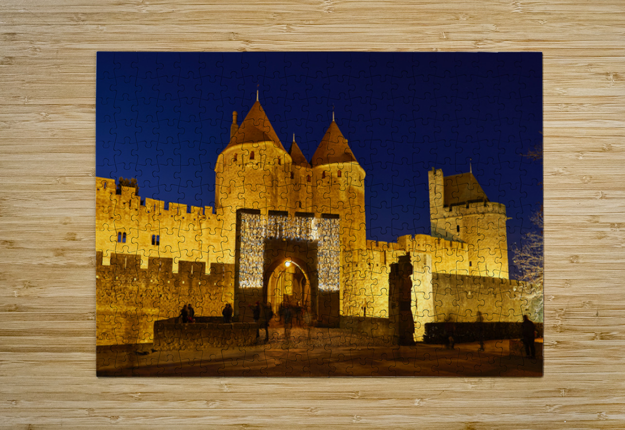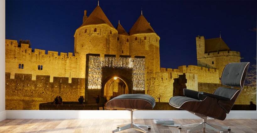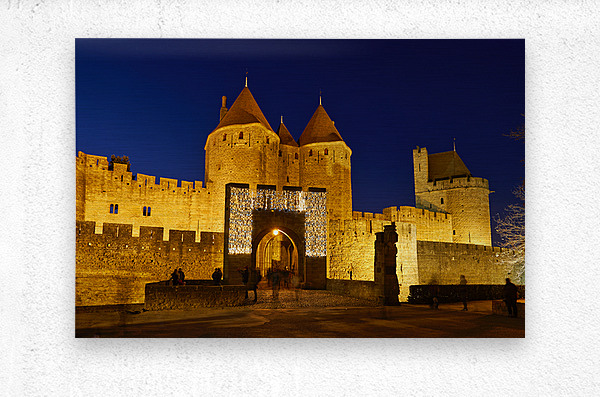 People walk near the bright entrance of Carcassonne castle at night. The lights add a festive look to the historic structure.